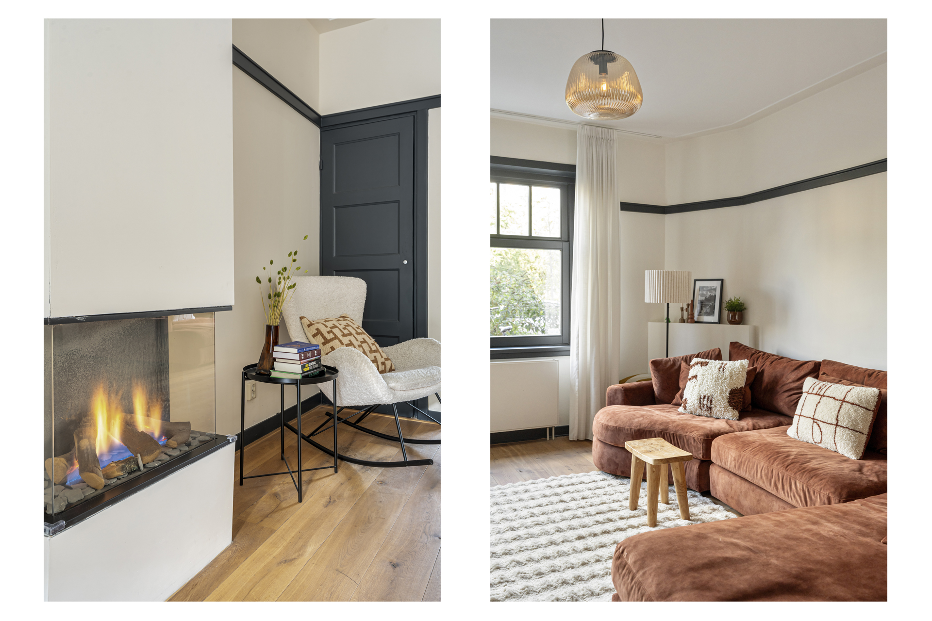 Middels de eigen entree betreedt u de woning en komt u in de hal, welke toegang biedt tot de centrale hal en de verschillende vertrekken. Aan de rechterzijde bevindt zich de royale woonkamer, een lichte en sfeervolle ruimte met grote raampartijen aan de voorzijde en openslaande deuren aan de achterzijde. De woonkamer biedt volop ruimte voor een comfortabele zit- en eethoek en is voorzien van een gezellige gashaard, die zorgt voor extra warmte en sfeer.