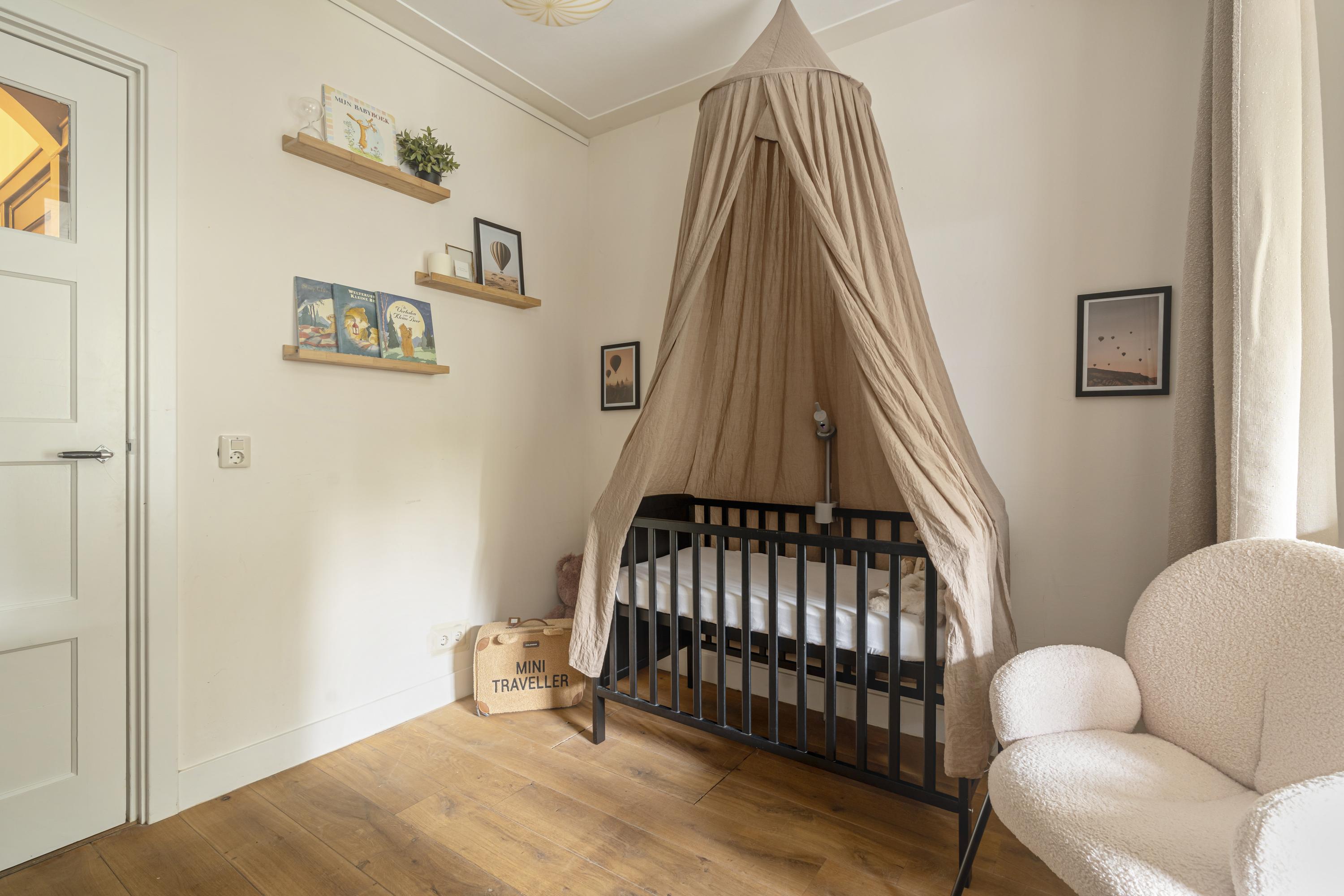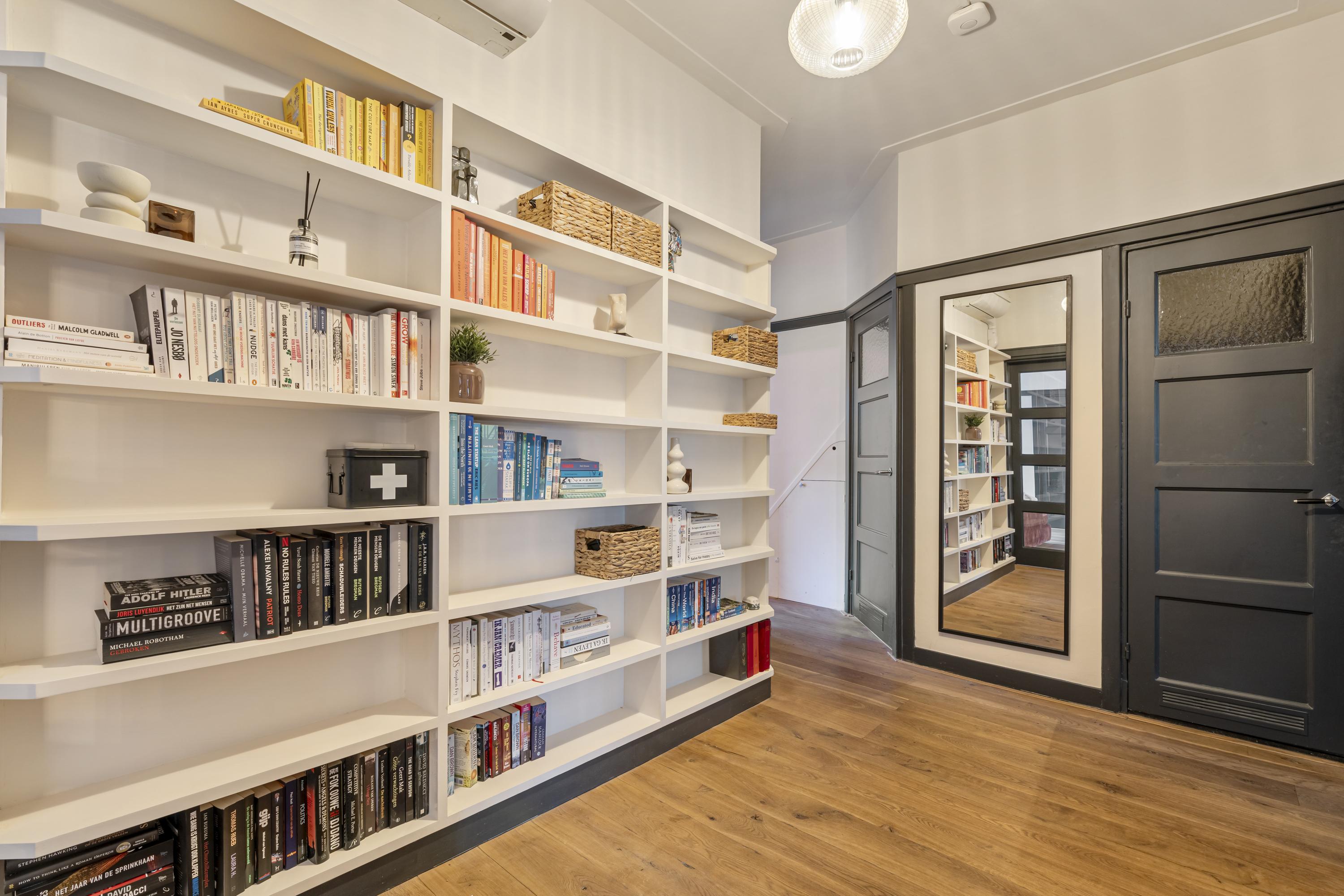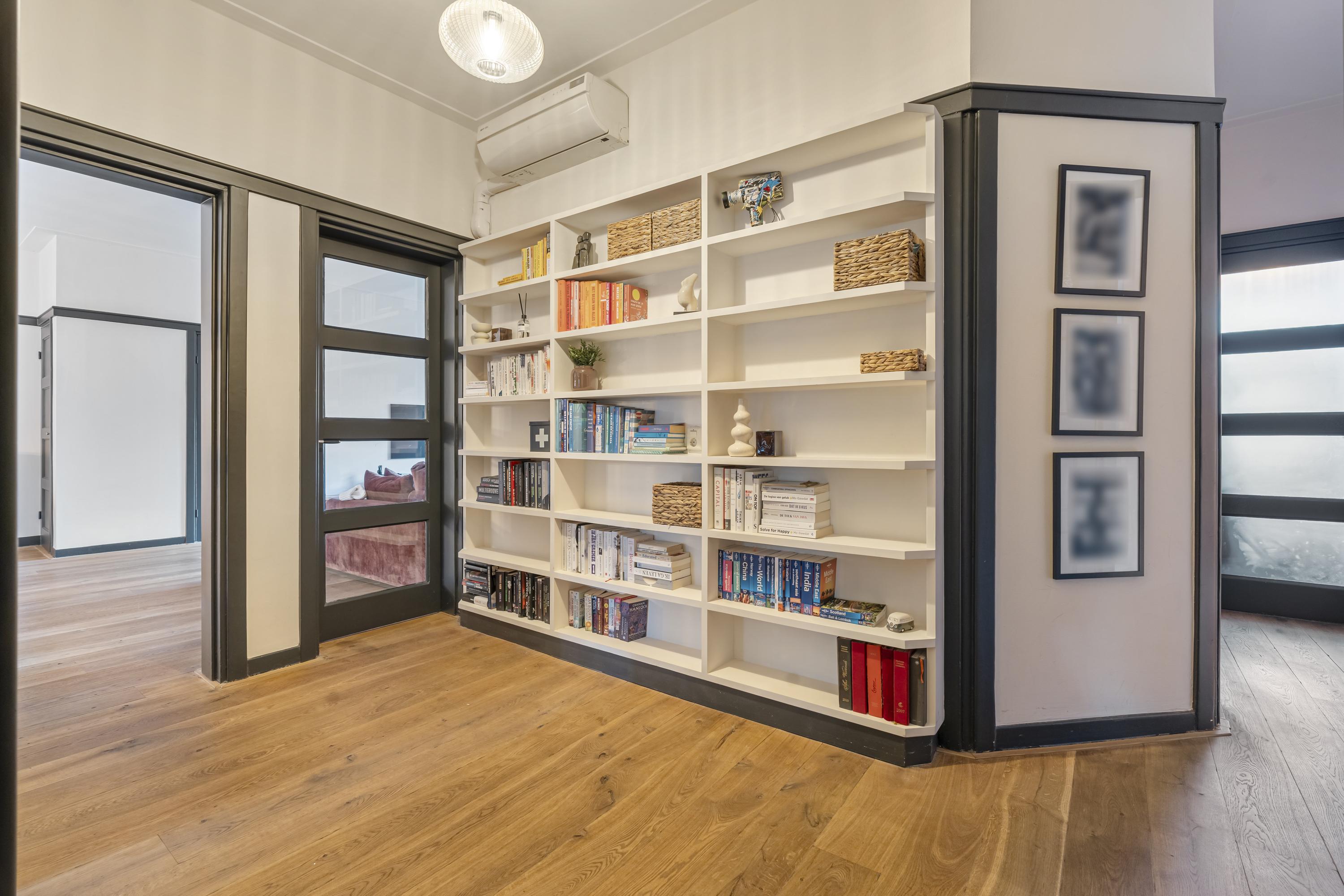 De woning beschikt over drie slaapkamers. De master bedroom is ruim opgezet en, evenals de hal, voorzien van airconditioning. De overige slaapkamers zijn uitstekend geschikt als kinder-, werk- of logeerkamer. Centraal in de woning bevindt zich de ruime hal, waar een op maat gemaakte wand met open planken is gerealiseerd. Deze fungeert als een stijlvolle boekenkast en biedt volop ruimte voor boeken, kunst en decoratieve objecten. Vanuit deze hal zijn de verschillende slaapkamers, de badkamer en het separate toilet bereikbaar. De badkamer is voorzien van een ligbad en wastafel. De zonnige achtertuin (Zuid/West) biedt veel privacy en beschikt naast de veranda over een vrijstaand tuinhuis, ideaal voor extra opslag of het stallen van fietsen.