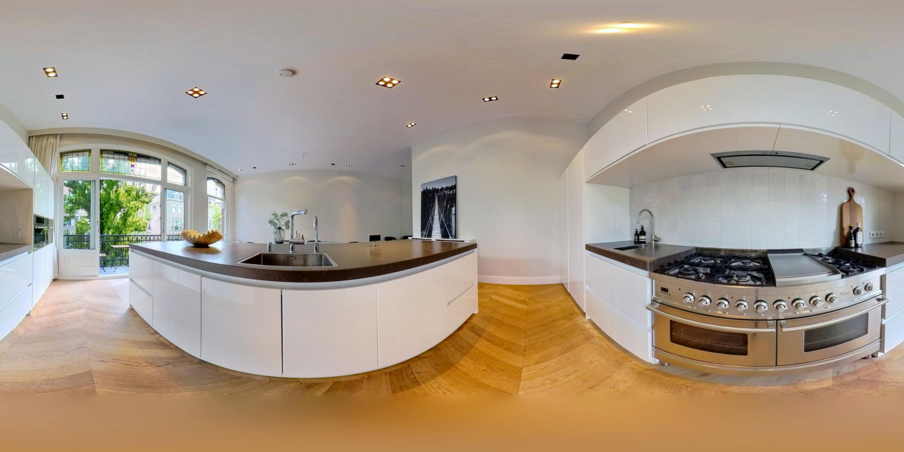 Middels de lift of de eigen entree op de eerste verdieping bereikt u de indrukwekkende leefverdieping. Hier valt direct de royale woonkamer op, met grote raampartijen welke zorgen voor een overvloed aan licht en een verfijnde sfeer. Aan de voorzijde bevindt zich de luxe woonkeuken, een absolute eyecatcher, voorzien van een royaal kookeiland met wijnklimaatkast, dubbele spoelbak met Quooker en hoogwaardige inbouwapparatuur: twee ovens, een volledige koelkast en een aparte vriezer. Deze keuken biedt alles voor de echte culinaire liefhebber en vormt het hart van de woning. Vanuit hier heeft u toegang tot het balkon met karakteristieke glas-in-loodramen, ideaal voor een ontspannen ontbijt in de ochtendzon. Op deze verdieping zijn tevens een garderoberuimte en separaat toilet te vinden.