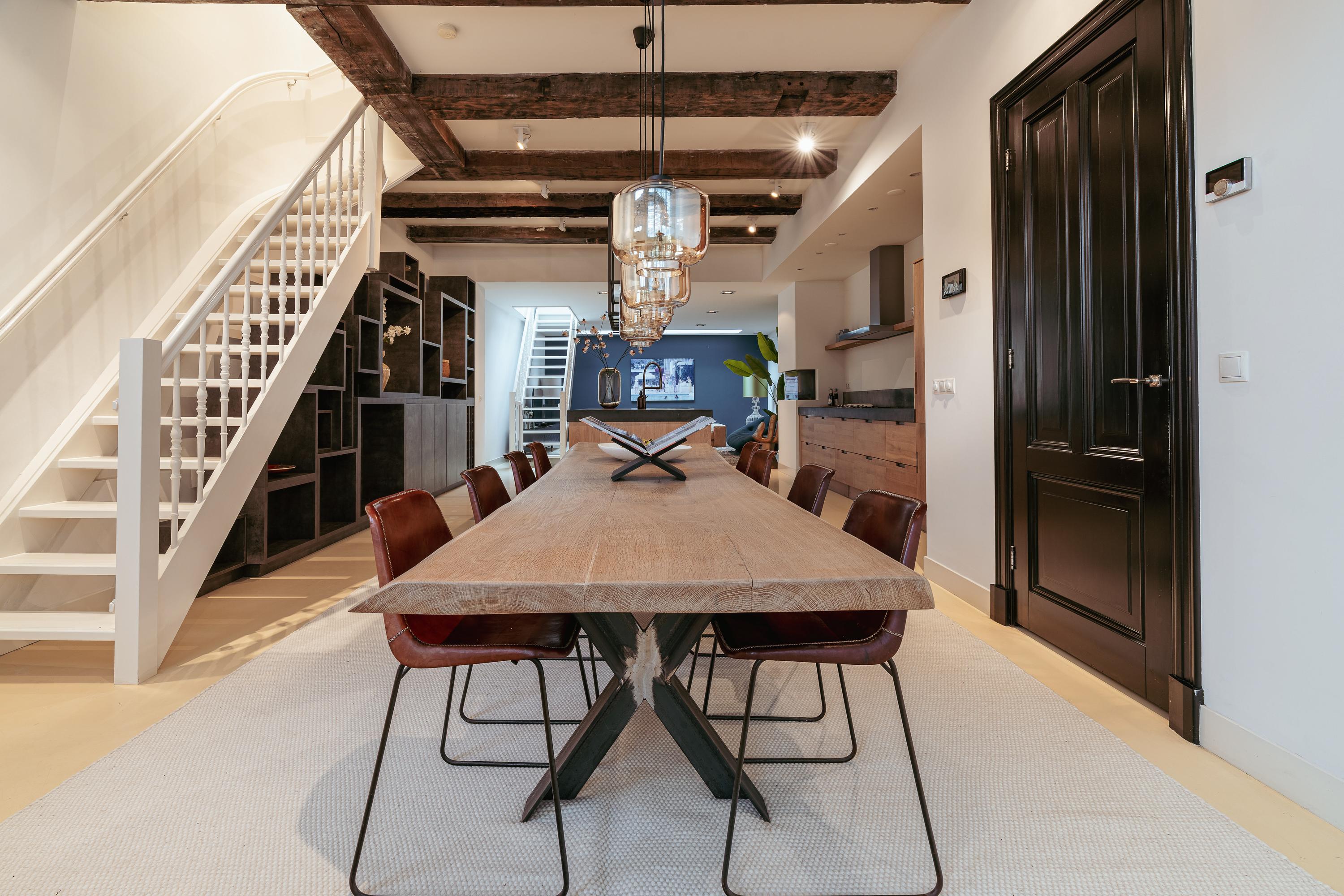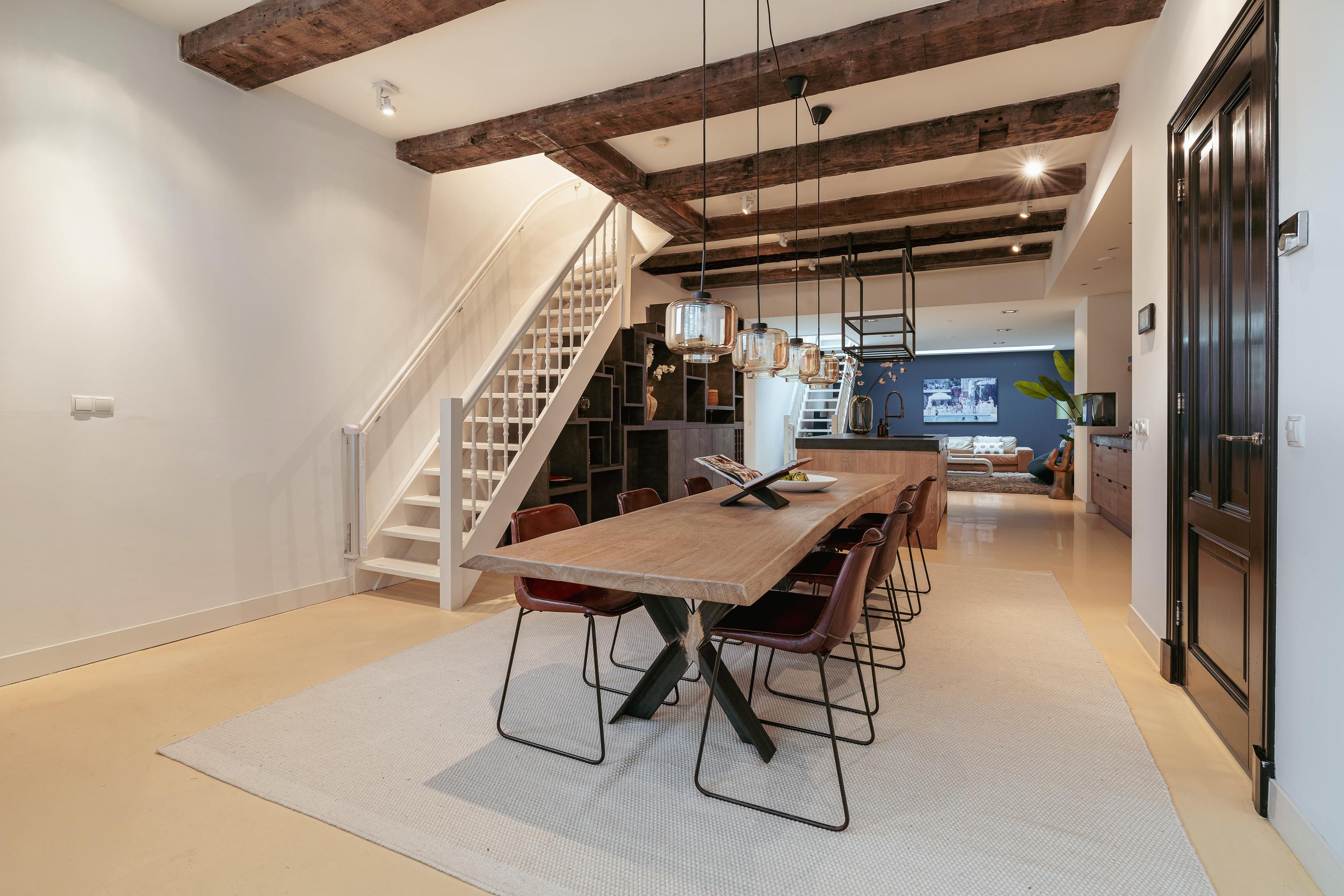 Via de eigen entree aan de Prinsengracht stapt u binnen in een bijzonder lichte en sfeervolle woonruimte waar authentieke details en modern comfort naadloos samenkomen. Direct bij binnenkomst vallen de hoge plafonds met zichtbare houten balken op, evenals de grote raampartijen die prachtig uitzicht bieden op de gracht.