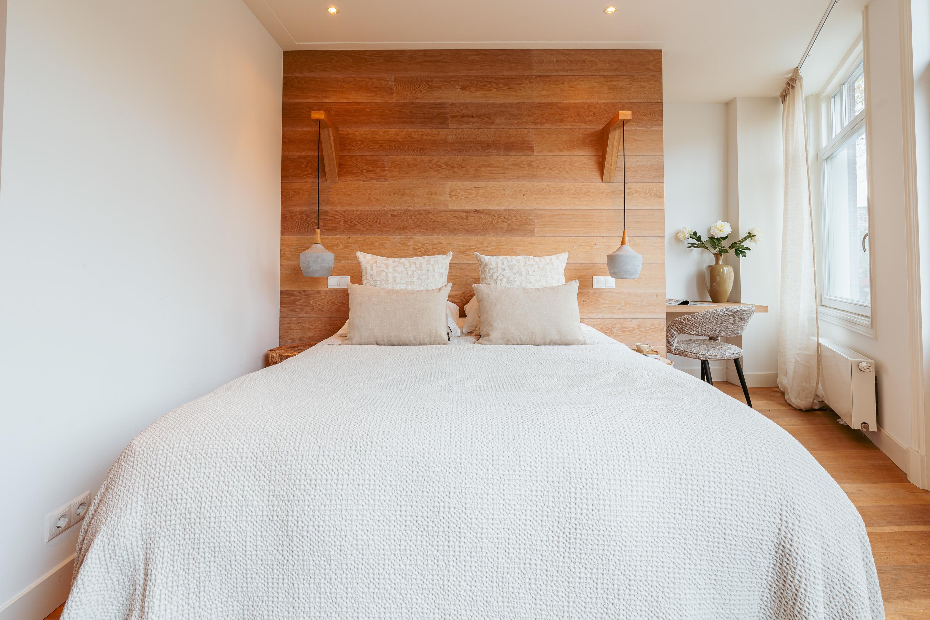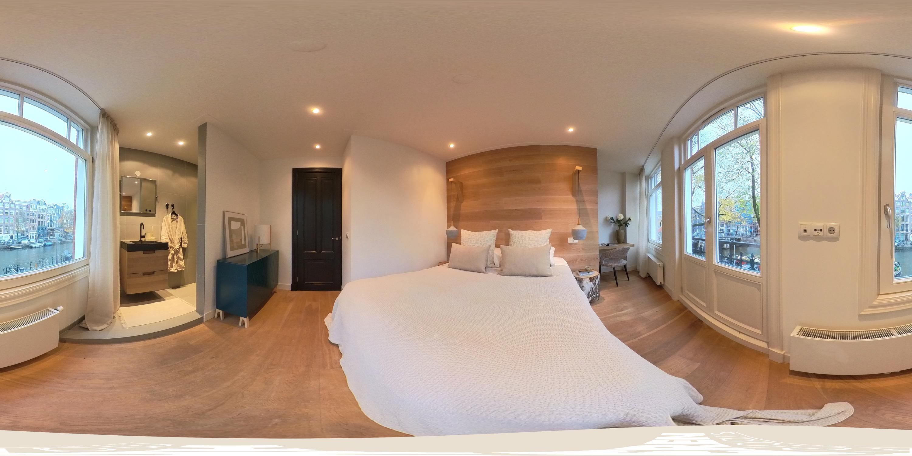 De trap aan de voorzijde leidt naar de eerste verdieping. Aan de voorzijde ligt de ruime hoofdslaapkamer met grote ramen en openslaande deuren die een prachtig uitzicht bieden over de gracht. De kamer is warm ingericht met een stijlvolle houten wand en beschikt over extra ruimte voor een eventuele werkplek. Aansluitend bevindt zich een moderne badkamer, voorzien van een inloopdouche, wastafelmeubel en luxe afwerking.