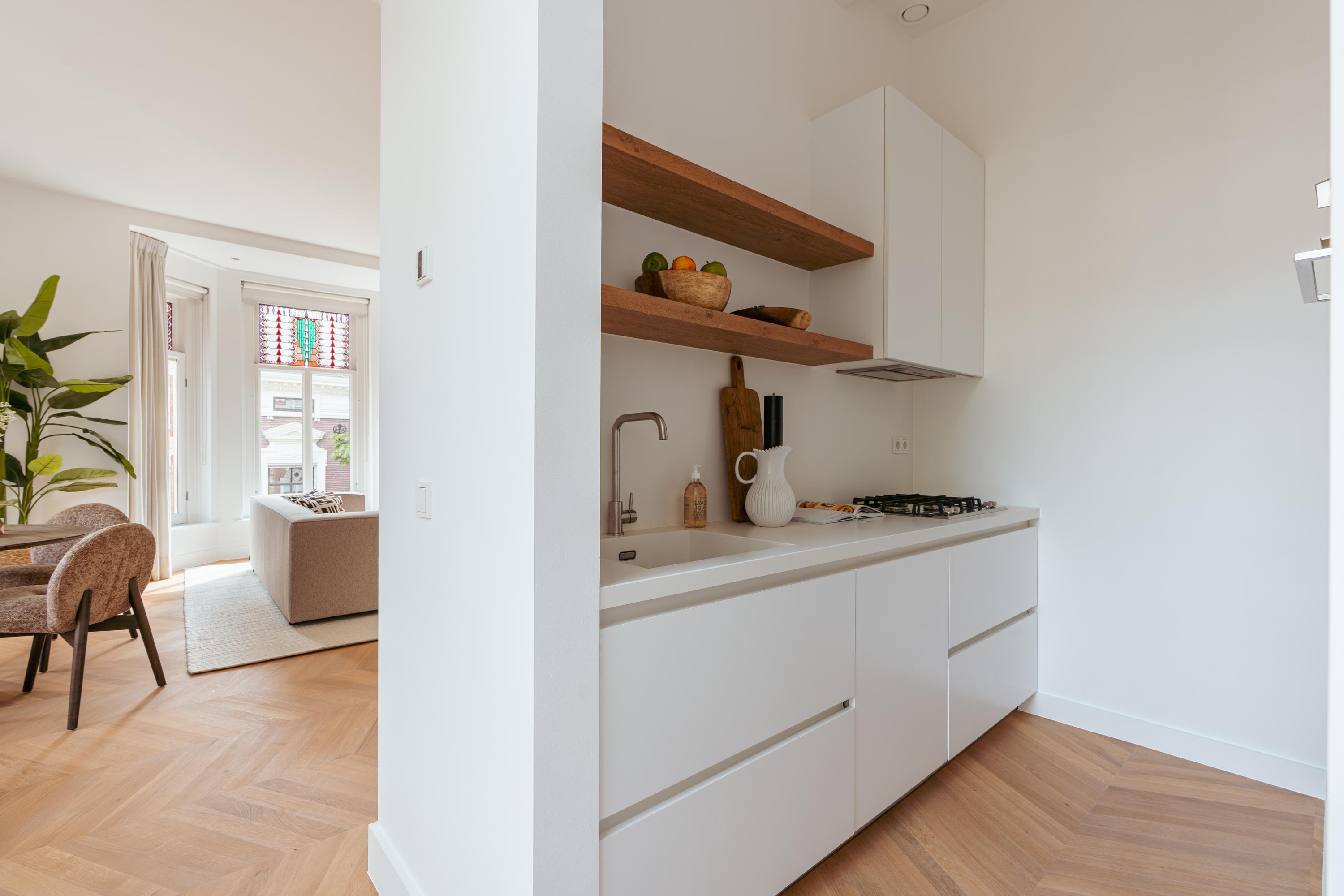 Via het nette gemeenschappelijke trappenhuis of de lift bereikt u het appartement op de tweede verdieping. Vanuit de ruime centrale hal heeft u toegang tot alle vertrekken. De royale woonkamer springt in het oog met zijn meer dan 3 meter hoge plafonds, elegante erkers en een stijlvolle haard. Aangrenzend vindt u de moderne halfopen keuken met bargedeelte en hoogwaardige inbouwapparatuur, waaronder een 4-pits gasfornuis met afzuigkap, koel- en vriescombinatie, combi-oven en vaatwasser.