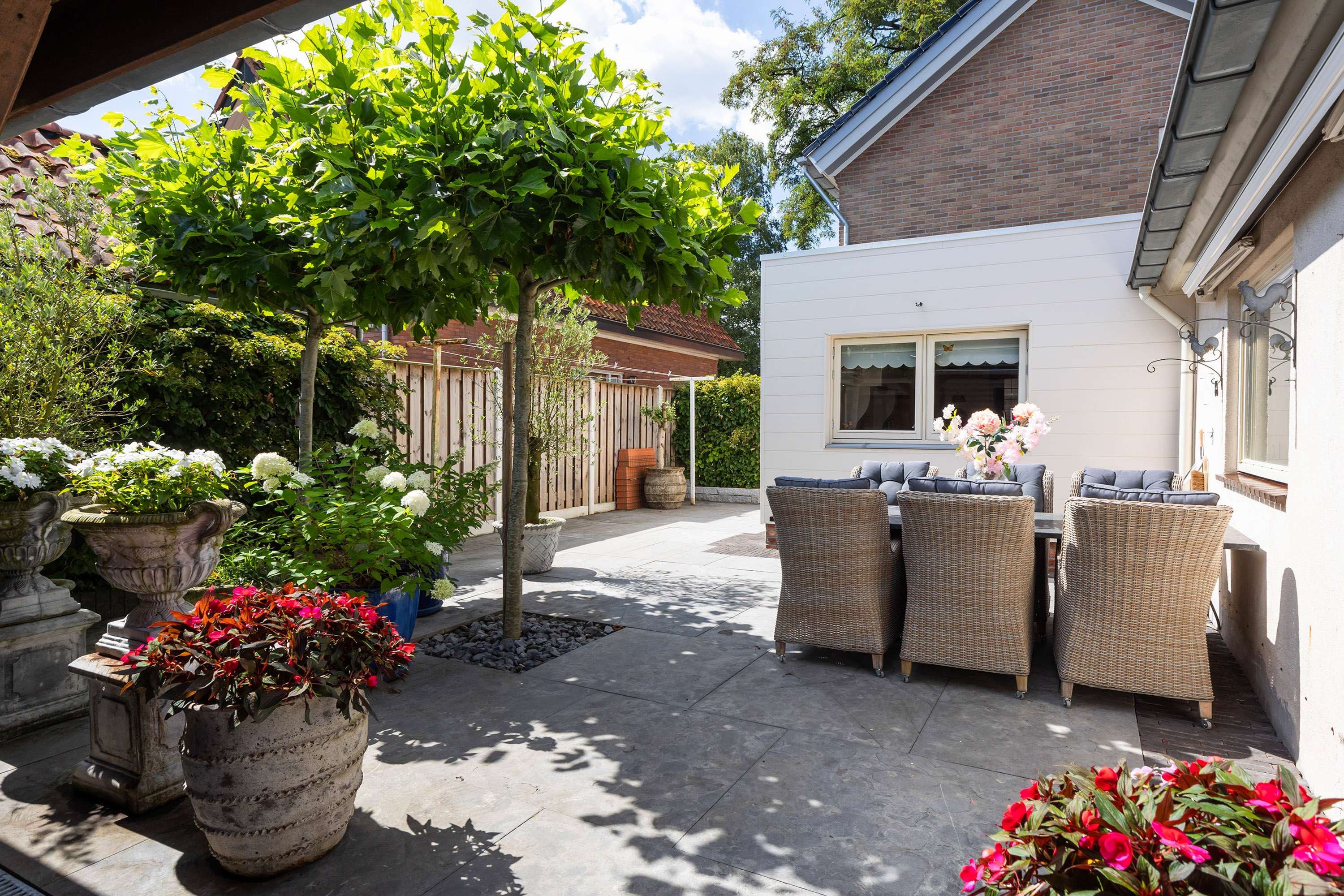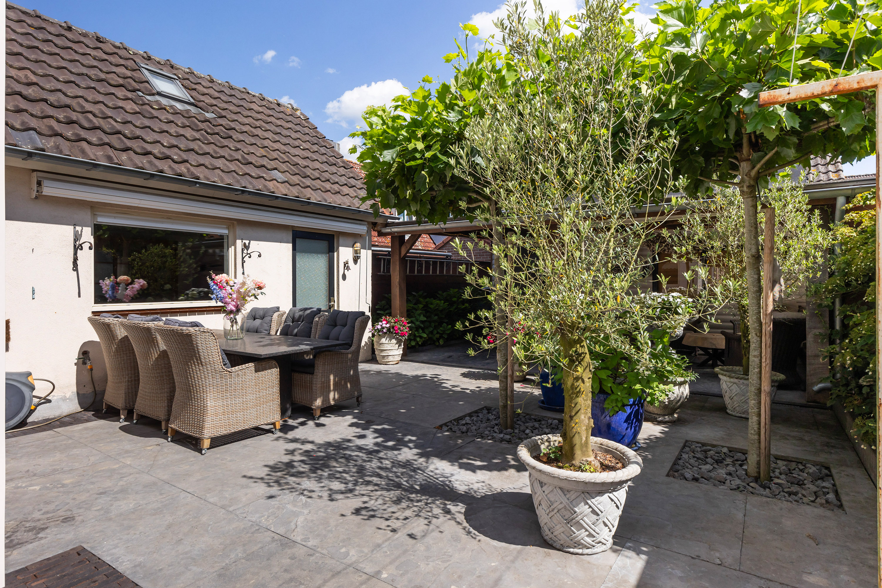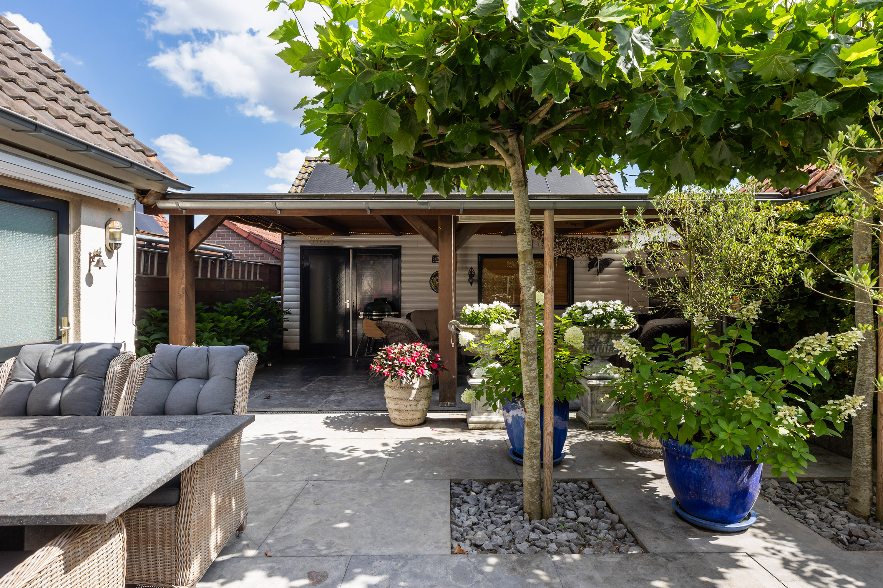 De buitenruimte is minstens zo aantrekkelijk. De fraai aangelegde tuin beschikt over terrassen van blauw hardsteen, granieten plantenbakken en diverse zitplekken. Aan de achterzijde staat een houten schuur met bergvliering met daarvoor een exclusieve veranda vervaardigd uit een robuust eikenhouten constructie en een met EPDM afgewerkt dak: een heerlijke plek om te genieten van het buitenleven en gezelligheid. De erfafscheidingen zijn recent vernieuwd in samenwerking met de buren en bestaan uit schuttingen met betonpalen en hout. Aan de voorzijde siert een acaciaboom de tuin, terwijl een smeedijzeren hekwerk met afsluitbare poort zorgt voor een stijlvolle entree. De royale oprit met klinkerbestrating en carport biedt plaats aan meerdere auto’s.