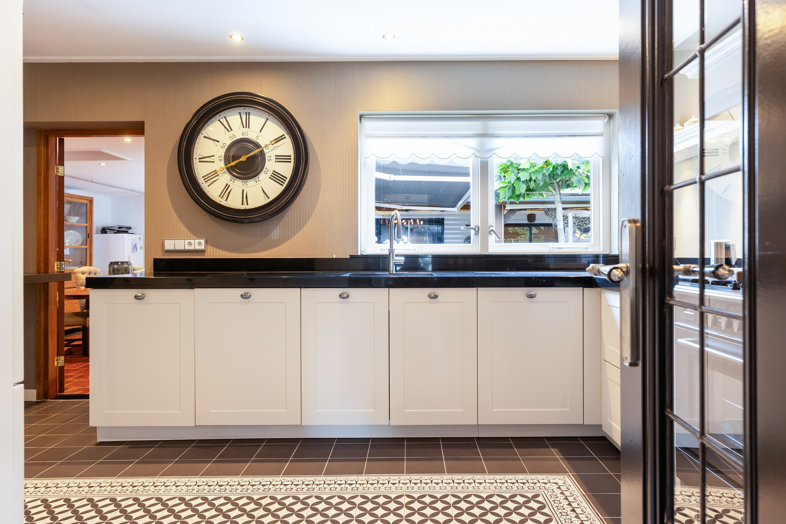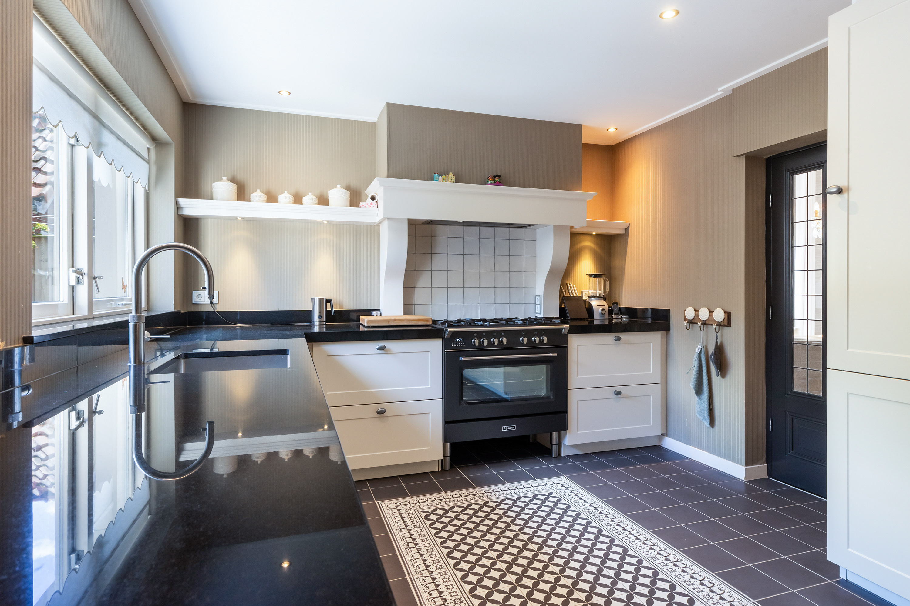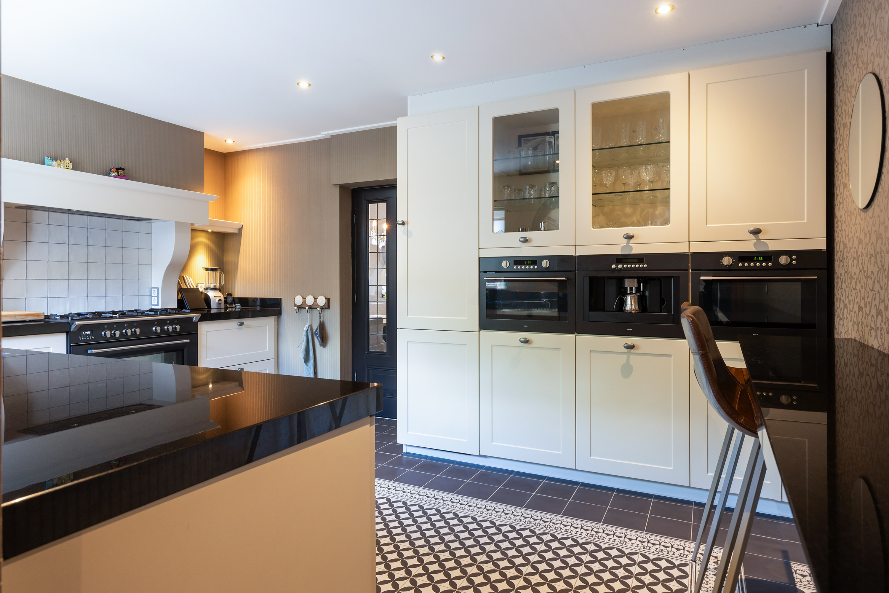 De keuken is een ware blikvanger: een luxe landelijke opstelling met granieten werkblad, een sfeervolle Portugese tegelvloer met elektrische vloerverwarming en hoogwaardige inbouwapparatuur: een combi-stoomoven, combimagnetron, vaatwasser, grote koelkast en een inbouw-koffiezetapparaat. Het 90 cm brede en luxe 5 pits gasfornuis heeft een ingebouwde oven. Hierboven is in de schouw een afzuigunit ingebouwd. De vele kasten en de hoekkast met een dubbel uitzwenkplateau geven handige bergruimte. Tevens is er een granieten eetbar aanwezig waar u gezellig kunt zitten, of kunt genieten van een maaltijd of drankje. Via de keuken is er directe verbinding naar zowel de woonkamer als de achtergelegen tuinkamer.