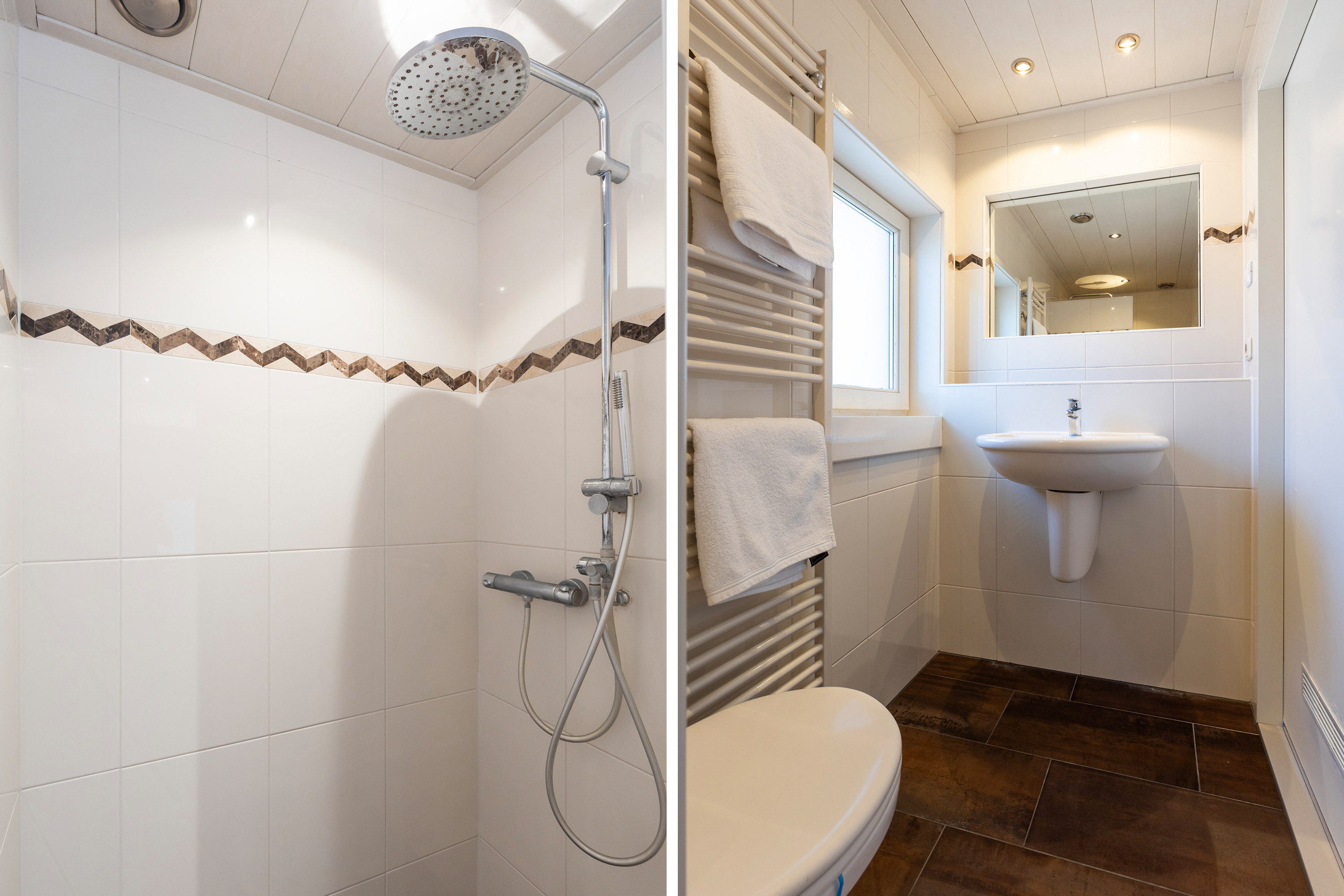 De badkamer is uitgerust met een inloopdouche, wastafel, wandtoilet en een designradiator. Ventilatie gaat hier mechanisch en met een kantel- kiepraam.