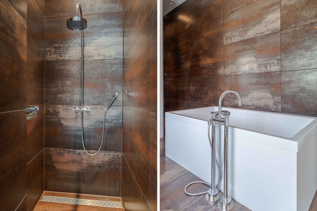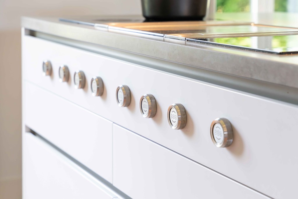 De keuken is voorzien van een modulair BORA systeem met 2 inductie kookplaten, 2 interne afzuigingen en een teppanyaki plaat, een Quooker kraan, 2 koelkasten, een vriezer, een stoomoven, een bakoven, een vaatwasser en een wijnklimaatkast.