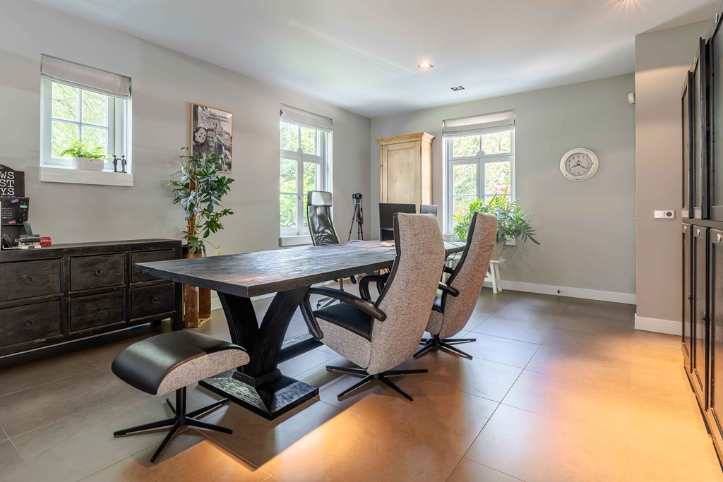De zitkamer is voorzien van een parketvloer, een ingebouwde gashaard, inbouwverlichting en een tuindeur. Door de grote raampartijen aan zowel de voor, zij-als achterzijde is er veel natuurlijke lichtinval en heeft u een heerlijk uitzicht op de tuin.