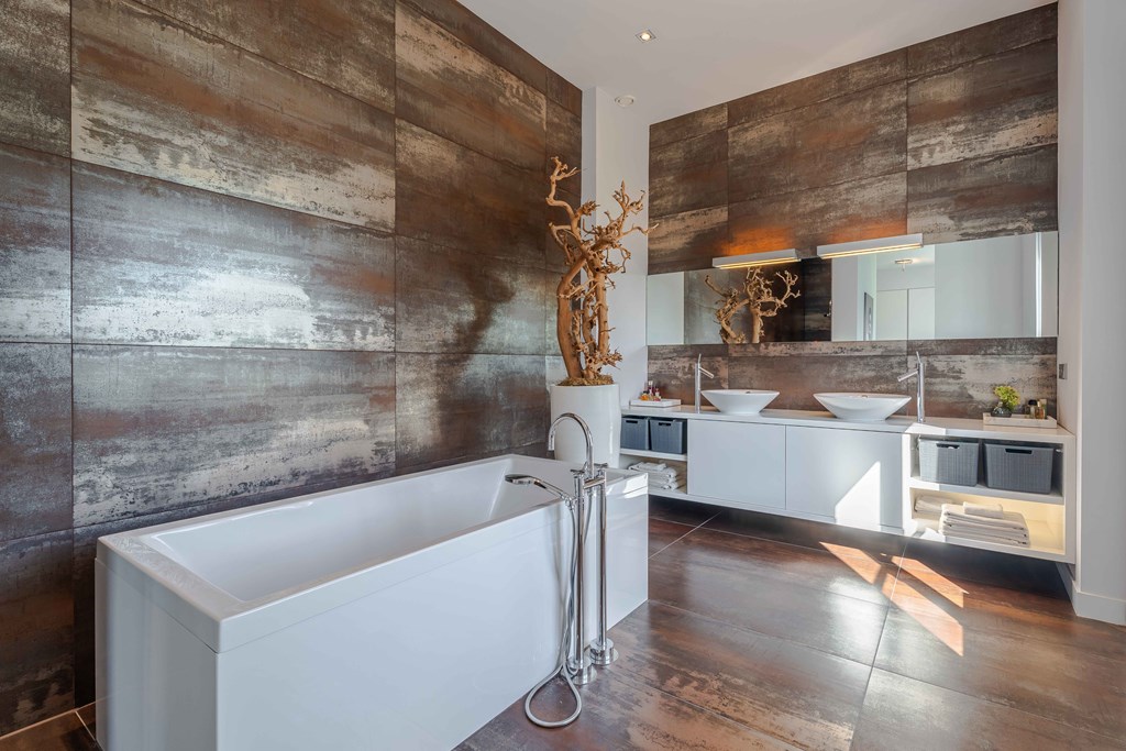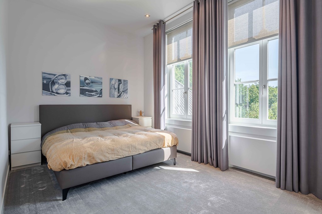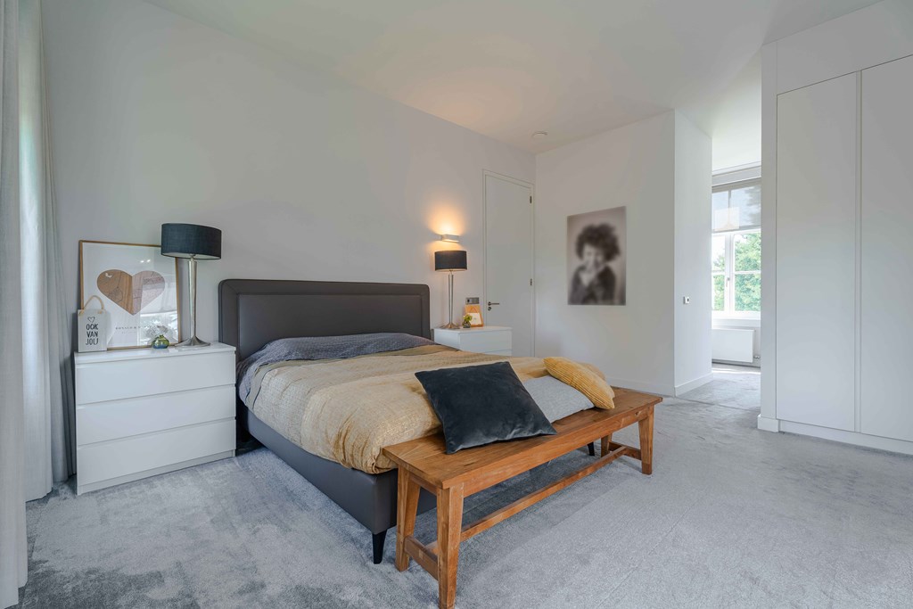 Slaapkamer 1 gelegen aan de voorzijde van de woning. Deze master suite, met doorkijkjes naar de tuin, is een oase van rust. Aansluitend heeft u toegang tot een kleedkamer en een complete badkamer met inloopdouche, een vrijstaand ligbad en 2 waskommen met meubel.