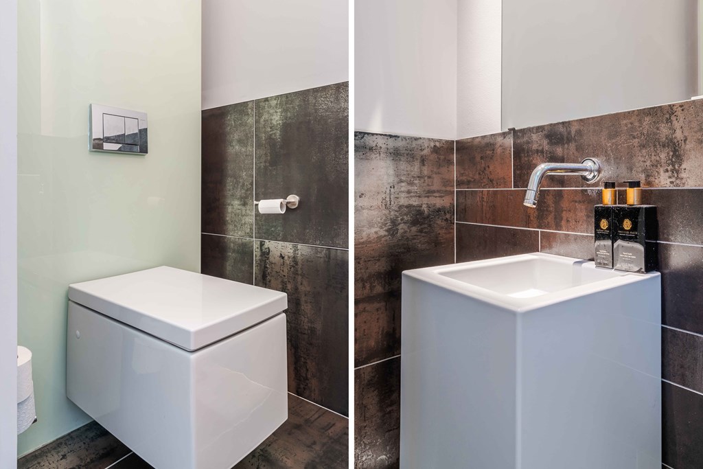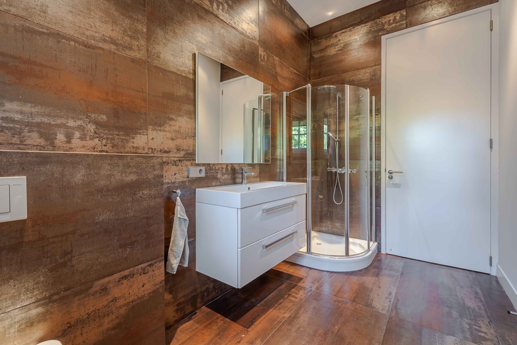 De tweede badkamer is voorzien van een wandcloset, een douche en een brede wastafel met meubel. Op de overloop bevindt zich een extra separate toiletruimte.