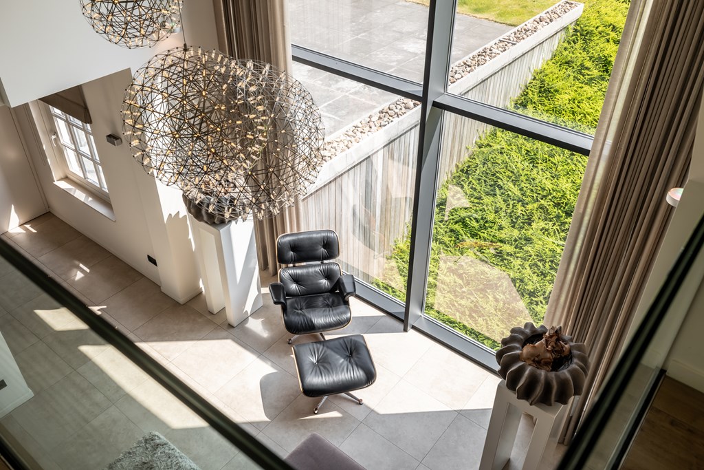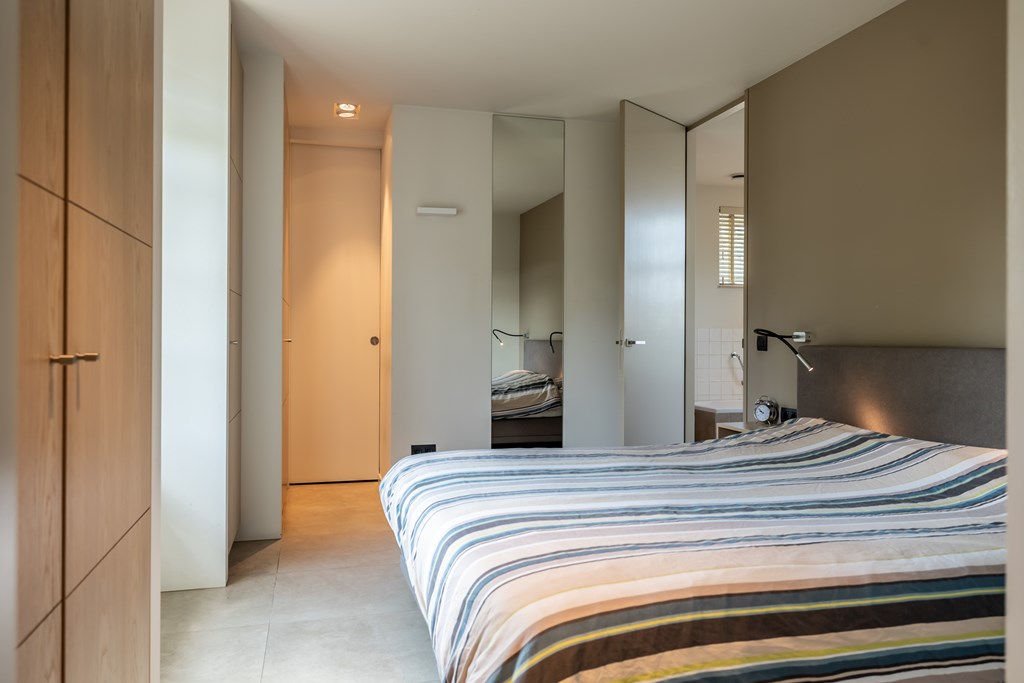 Op de eerste verdieping zijn aan beide kanten van het huis slaapkamers gecreëerd. Deze twee slaapkamers staan met elkaar in verbinding middels een “brug” vanwaar u een prachtig uitzicht heeft over de tuin. Doordat de brug is voorzien van een balustrade van glas heeft het bouwelement een luchtig karakter.