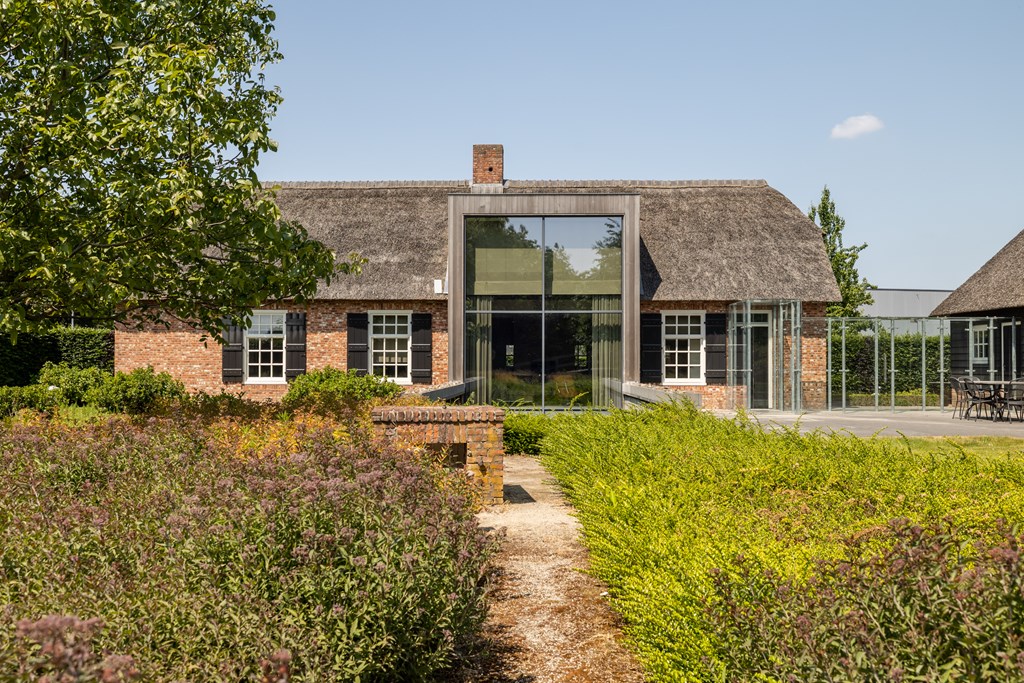 De garage die middels een glazen doorgang met het woonhuis is verbonden is net zoals het hoofdverblijf voorzien van een rieten dak. De dubbele garage heeft elektrisch bedienbare segmentdeuren en biedt plaats aan twee auto’s.