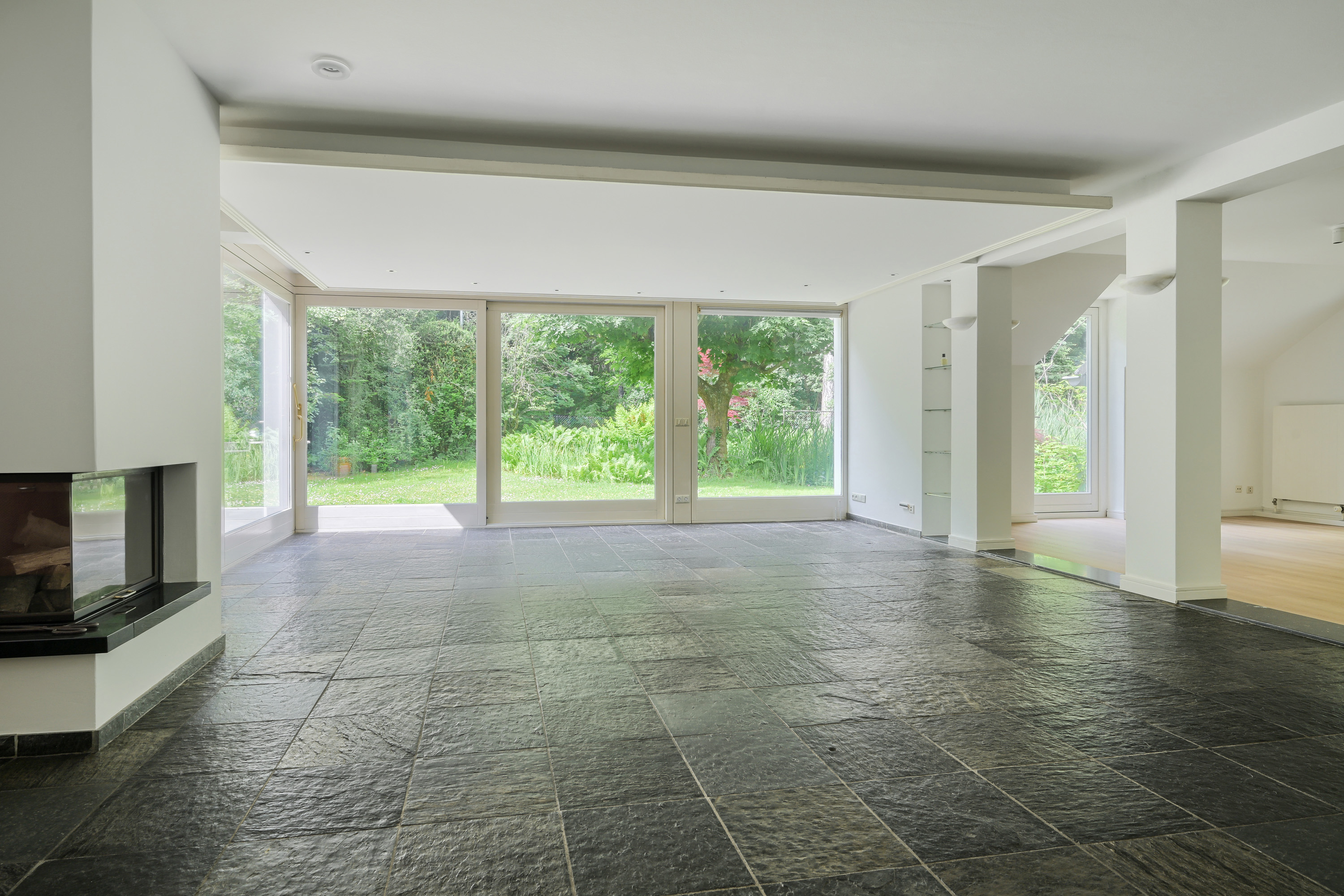 De uitermate royale en lichte zitkamer, met een afmeting van circa 9 bij 6 meter, grenst aan de tuin, welke u via twee schuifpuien rechtstreeks kan betreden. De woonkamer wordt gekenmerkt door een overvloed aan natuurlijk daglicht,