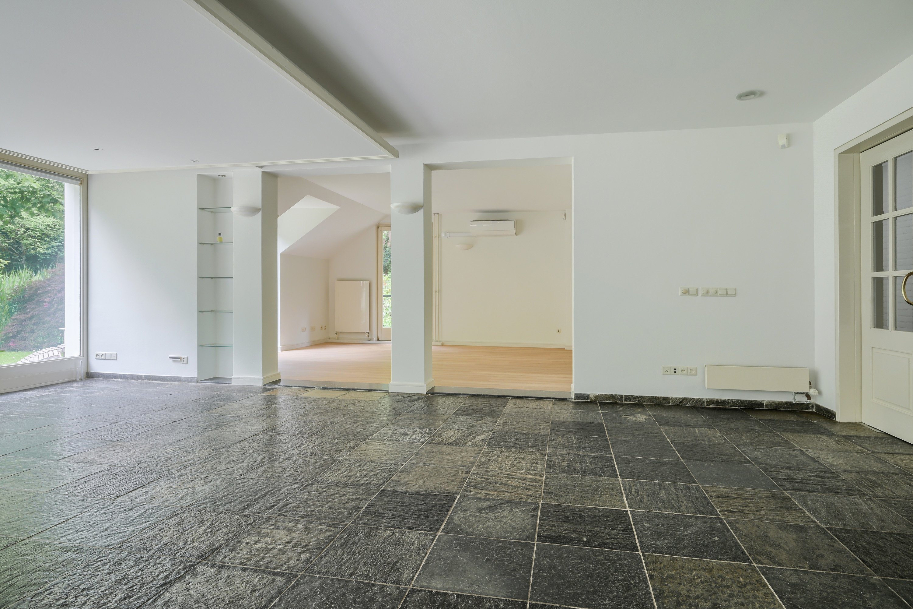 • De vloeren in de hal, toilet I, de werkkamer, de zitkamer, de eetkamer, slaapkamer I en de bijkeuken zijn afgewerkt met Noorse leisteen 'Pillarguri'.