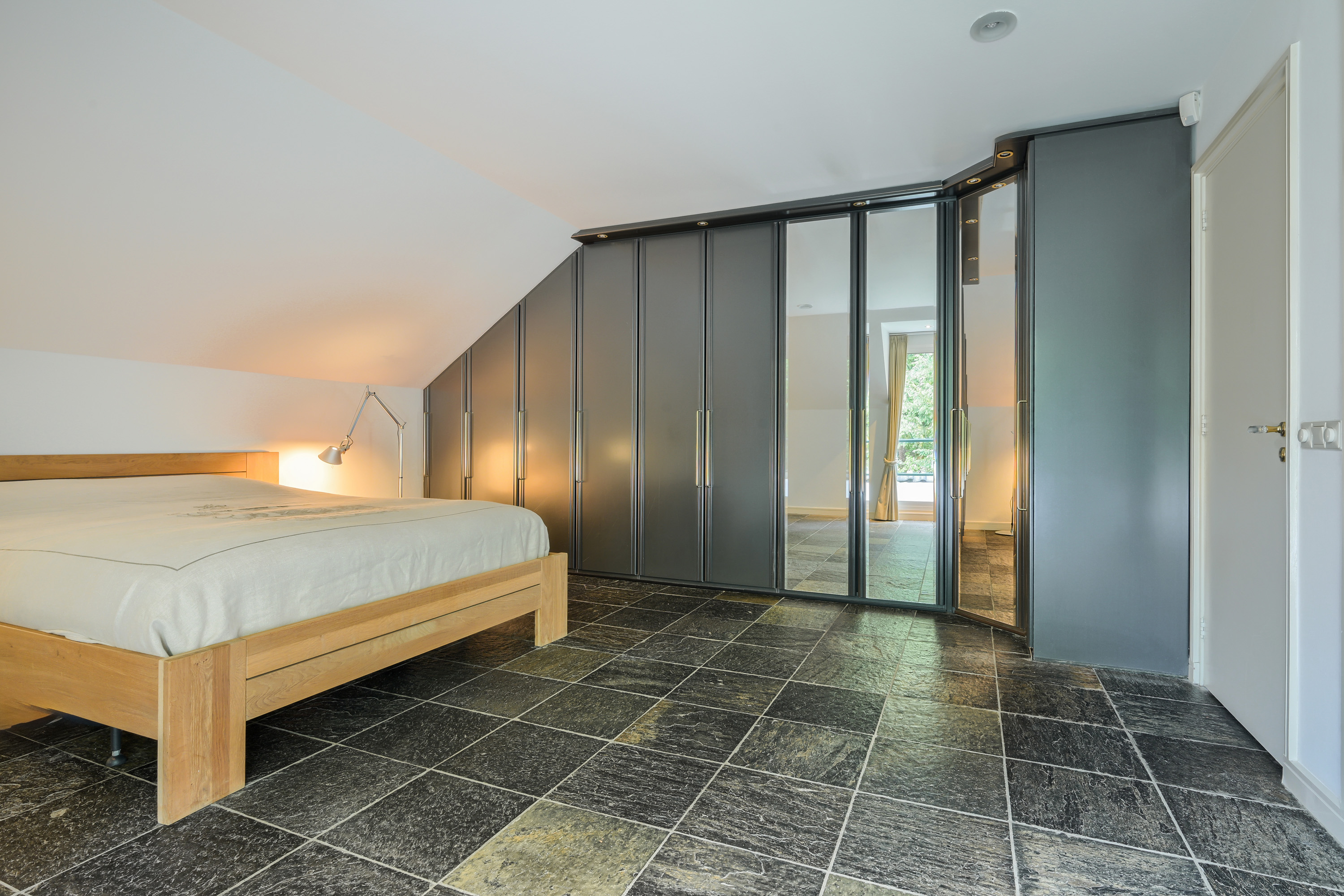 Hoofdslaapkamer, voorzien van een op maat gemaakte garderobekast en een schuifpui die toegang verleent tot