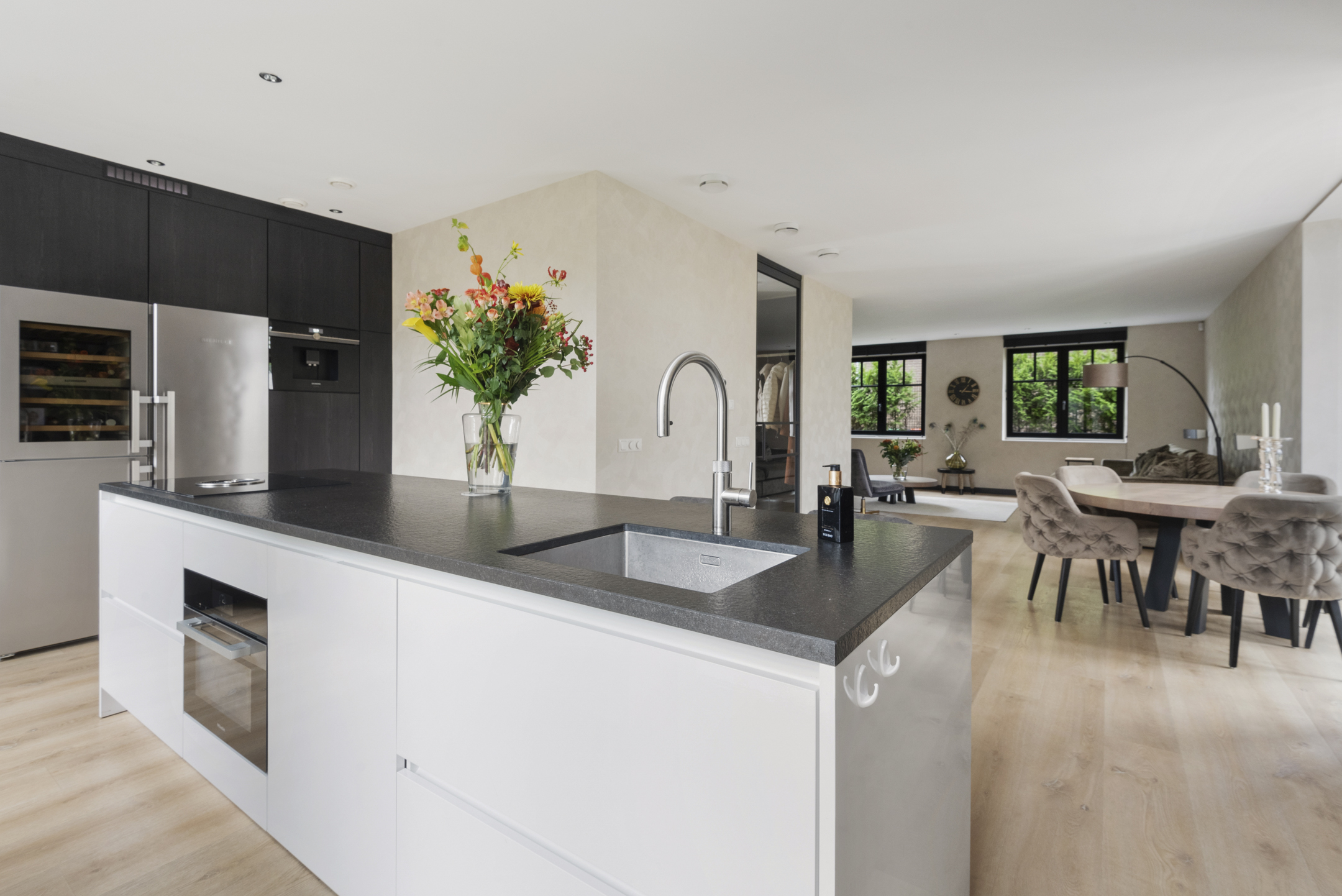 De luxe keuken met kookeiland is uitgerust met hoogwaardige inbouwapparatuur, waaronder een Miele stoomoven, wijnklimaatkoeling, Siemens combi oven, inbouwkoffiemachine, Bora inductiekookplaat met geïntegreerde afzuiging, Siemens vaatwasmachine en een koel- vriescombinatie.
