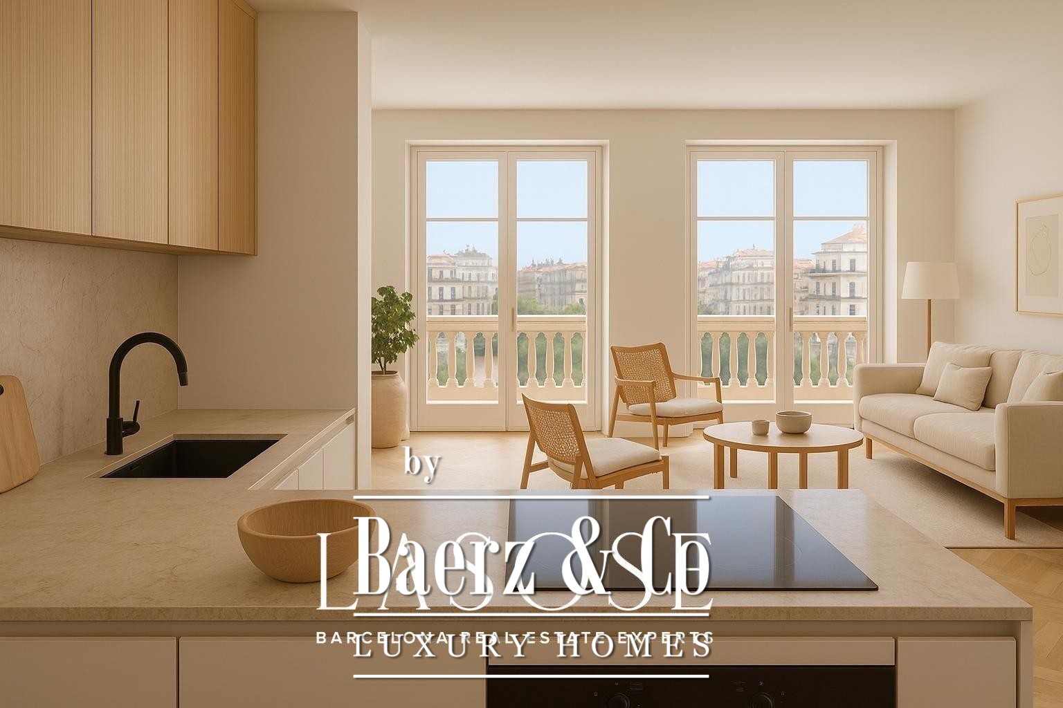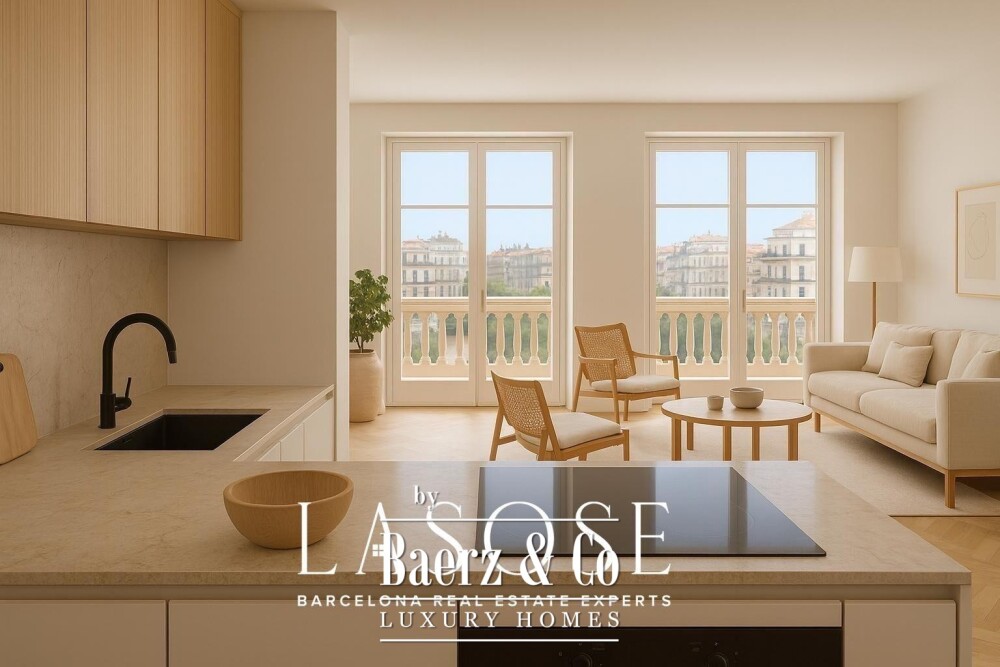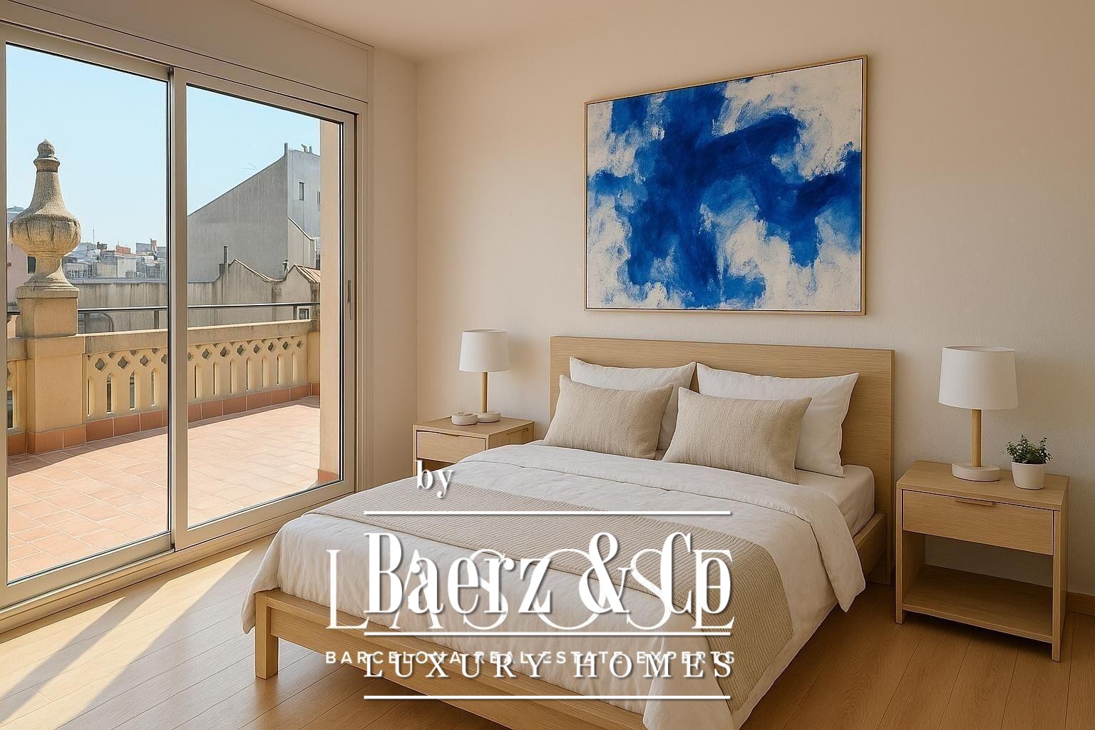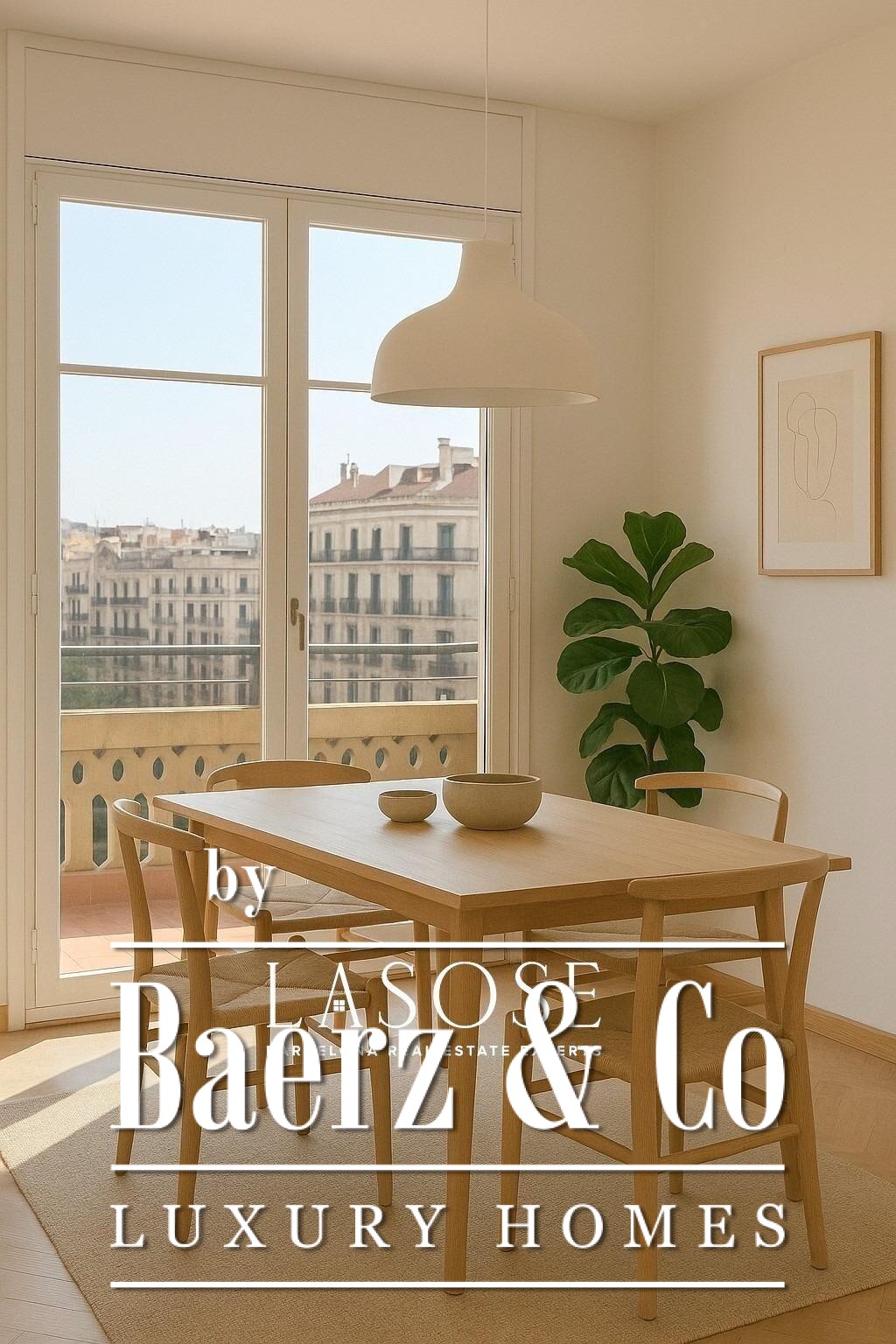 Penthouse Barcelona geeft invulling aan een verhoogde standaard van design en stedelijk leven in de wijk Eixample. Deze volledig gerenoveerde residentie beslaat 98 m² en biedt een verfijnde combinatie van ruimte en overvloedig daglicht in het hele appartement. De woon- en eetkamer lopen naadloos over in een royaal terras, waardoor een lichte omgeving ontstaat die even geschikt is voor ontspannen rust als voor sfeervol entertainen met uitzicht over de stad.