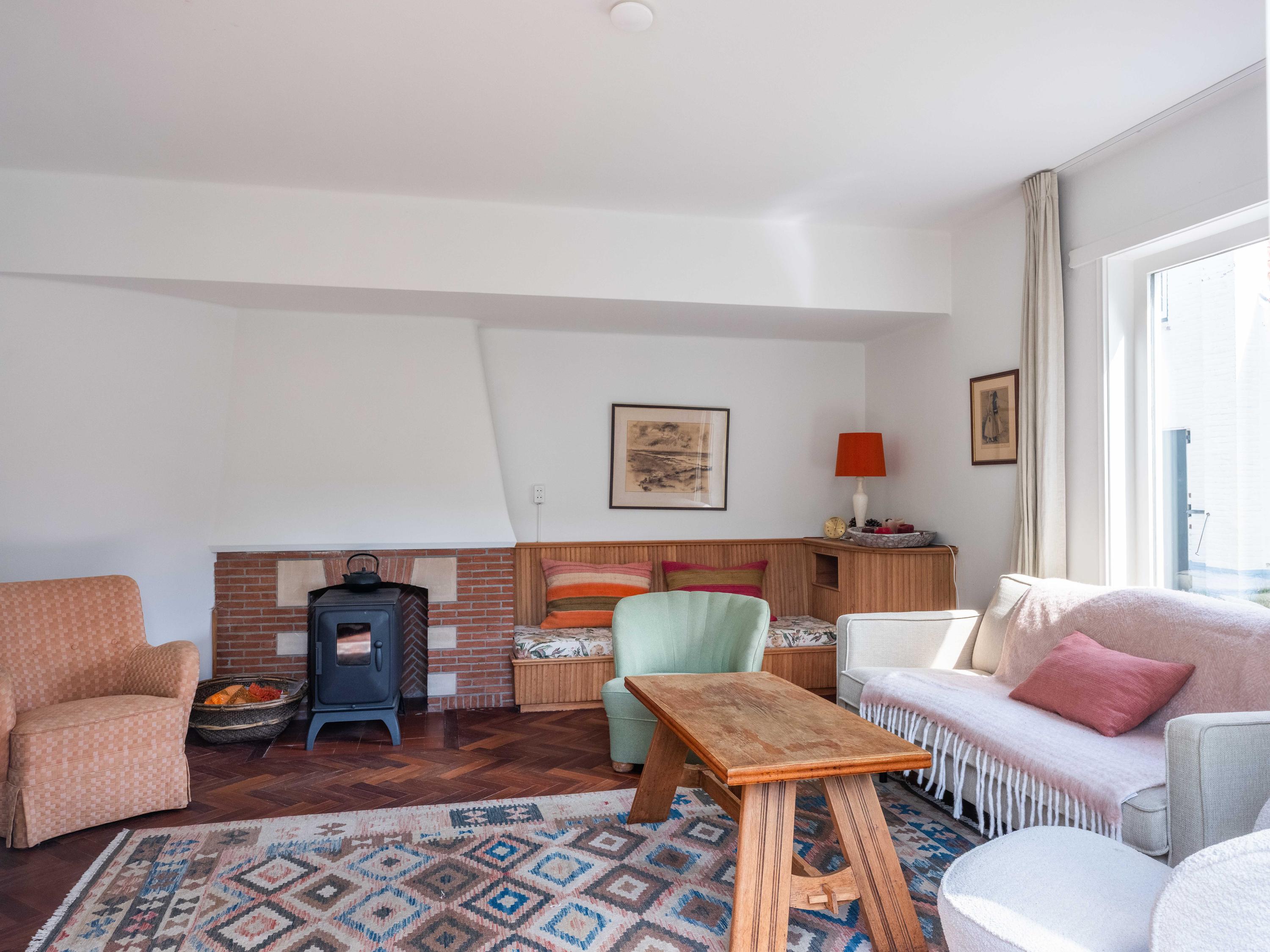 We nemen u mee naar binnen. Bij binnenkomst valt direct de fraaie entreehal op met een stijlvolle trapopgang met smeedijzeren leuning, een moderne toiletruimte en een handige kelderkast. De woonkamer is licht en sfeervol met een originele houten parketvloer, een houtkachel en openslaande tuindeuren naar de groene tuin. Ingebouwde houten maatwerkkasten zorgen voor extra charme én bergruimte.