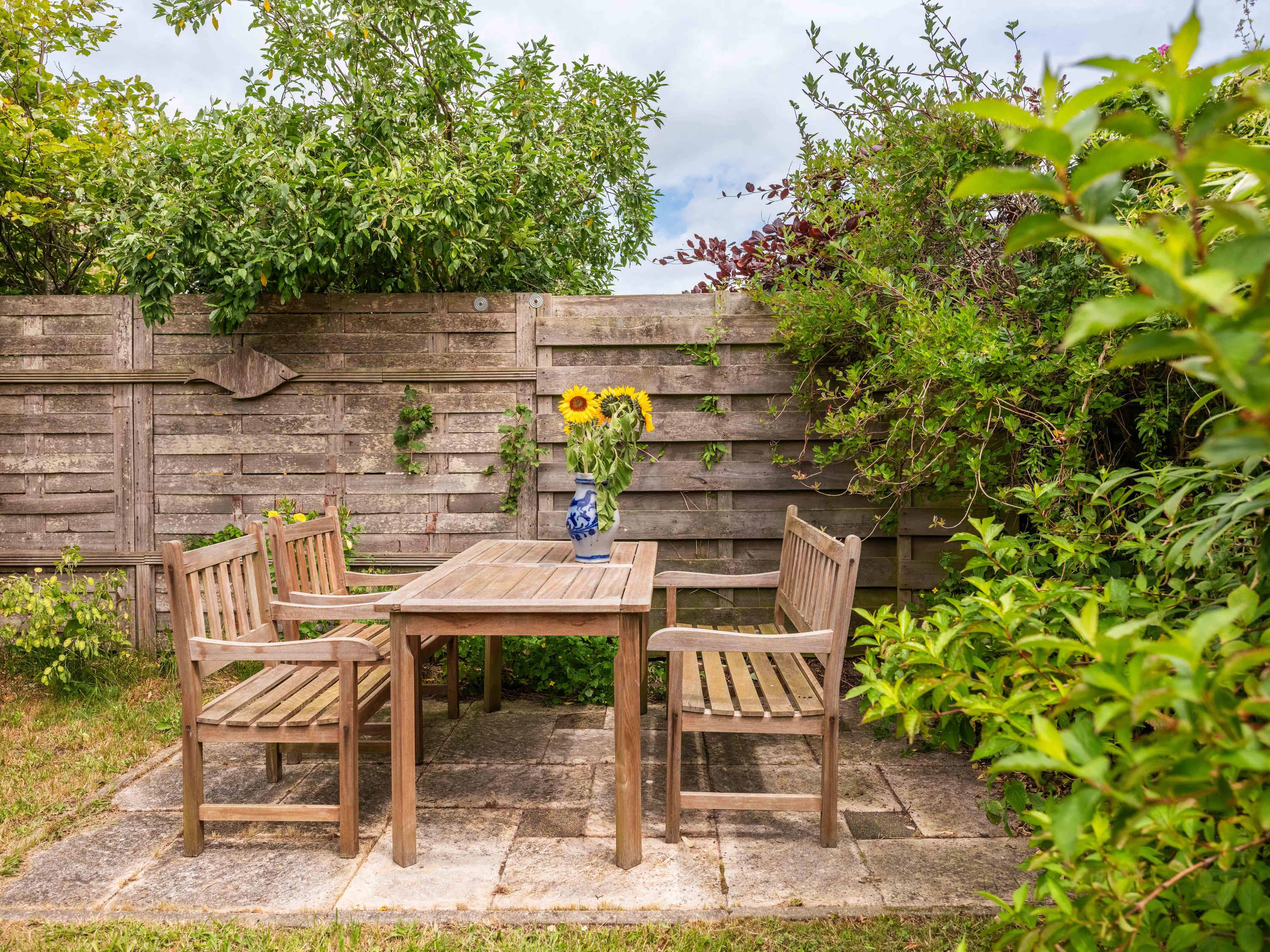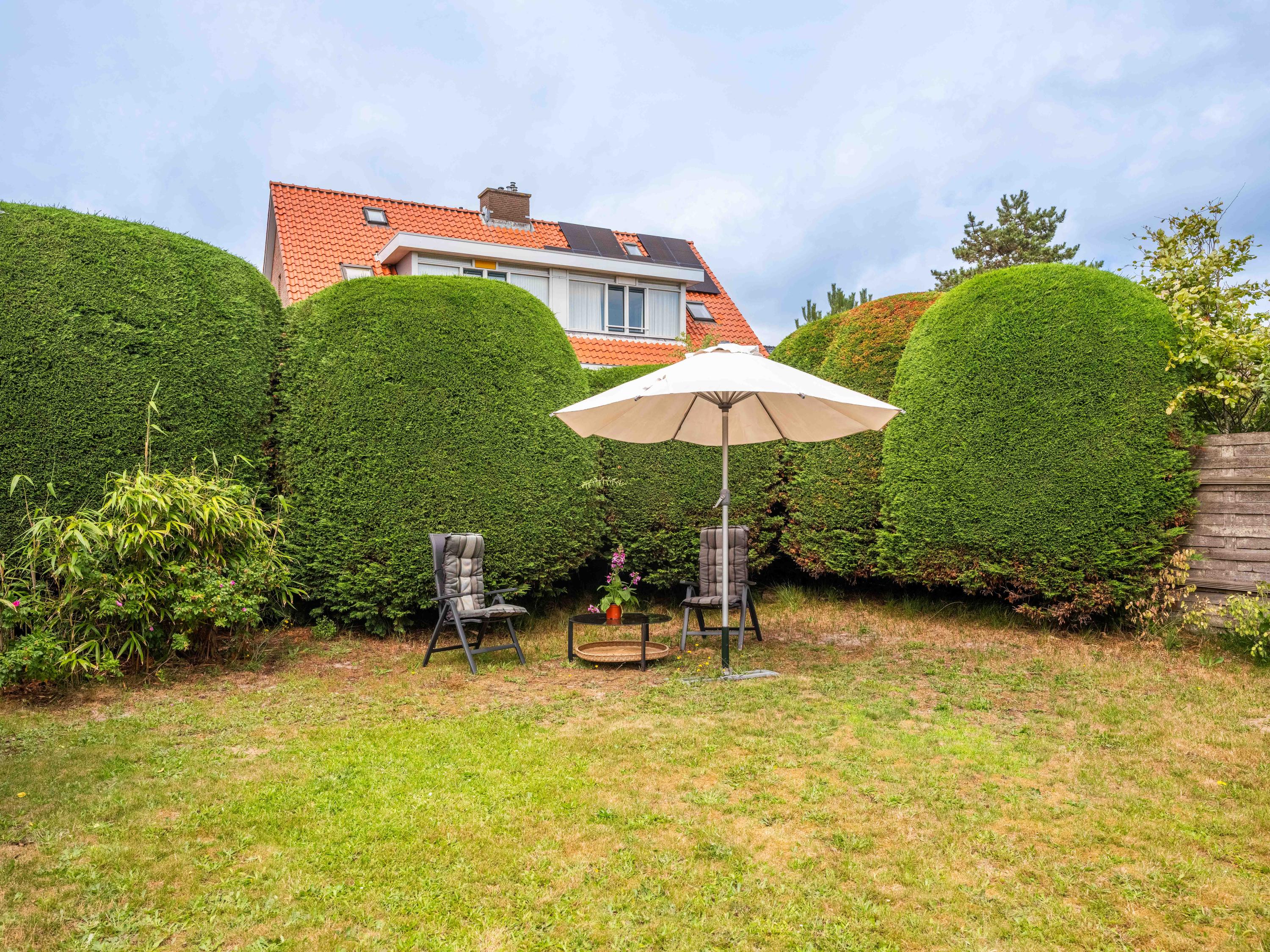 Rondom de woning ligt een groene tuin die dankzij de recent geplaatste schutting veel privacy biedt. Door de ligging rondom het huis is er altijd wel een zonnige of juist schaduwrijke plek om te genieten van de rust en het buitenleven.