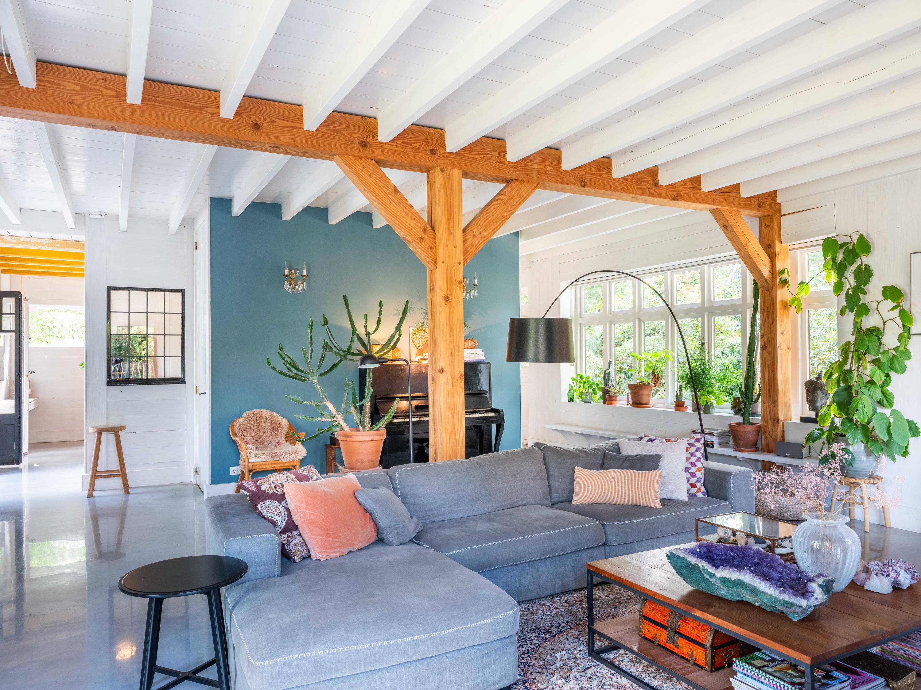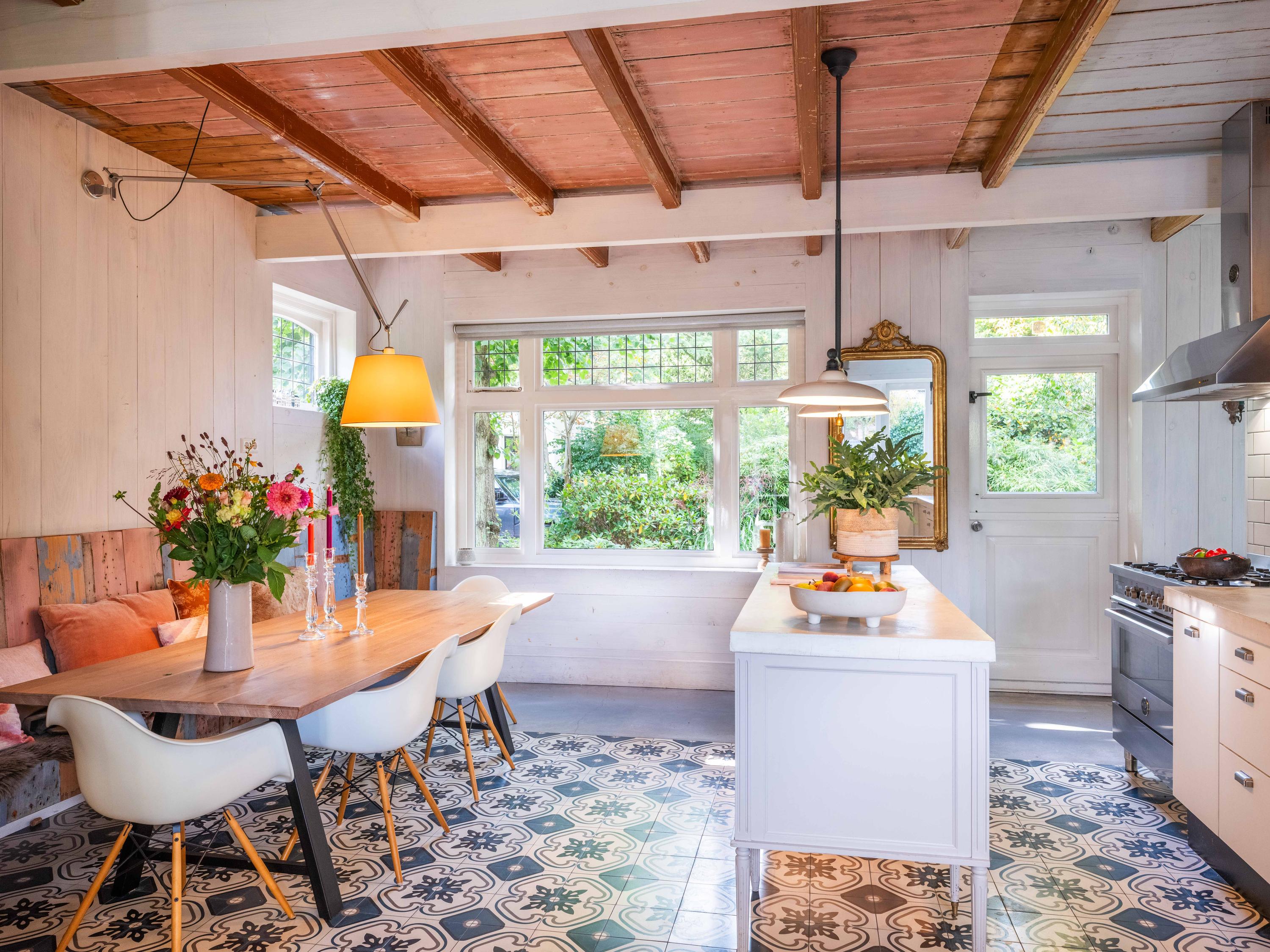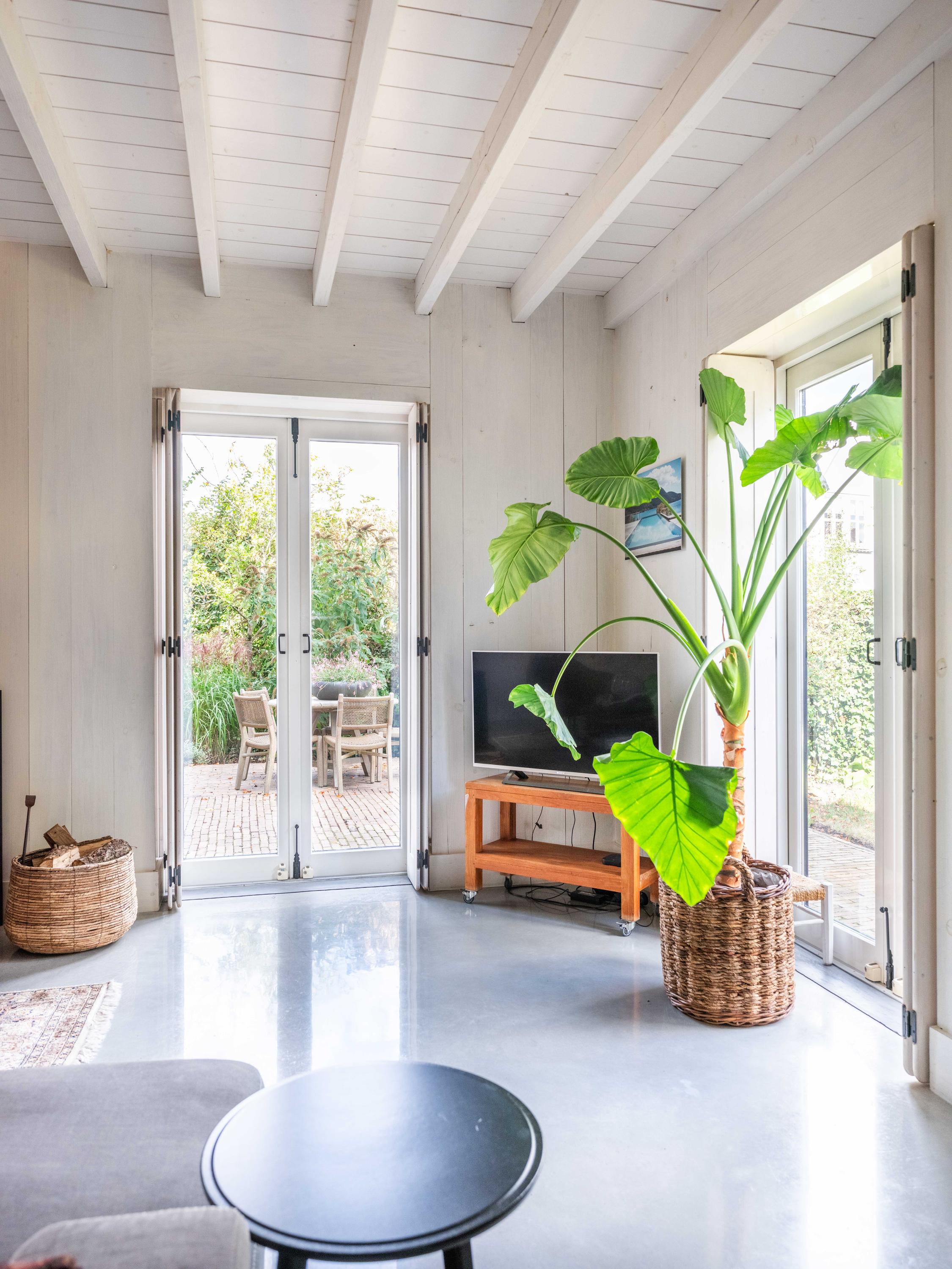 Grenzend aan de keuken bevindt zich de sfeervolle woonkamer met houtkachel, ramen rondom en diverse openslaande deuren naar de tuin. De houten details en de warme uitstraling maken dit een heerlijke plek om te ontspannen, zowel ’s winters bij de haard als ’s zomers met de deuren open naar de tuin met terras.