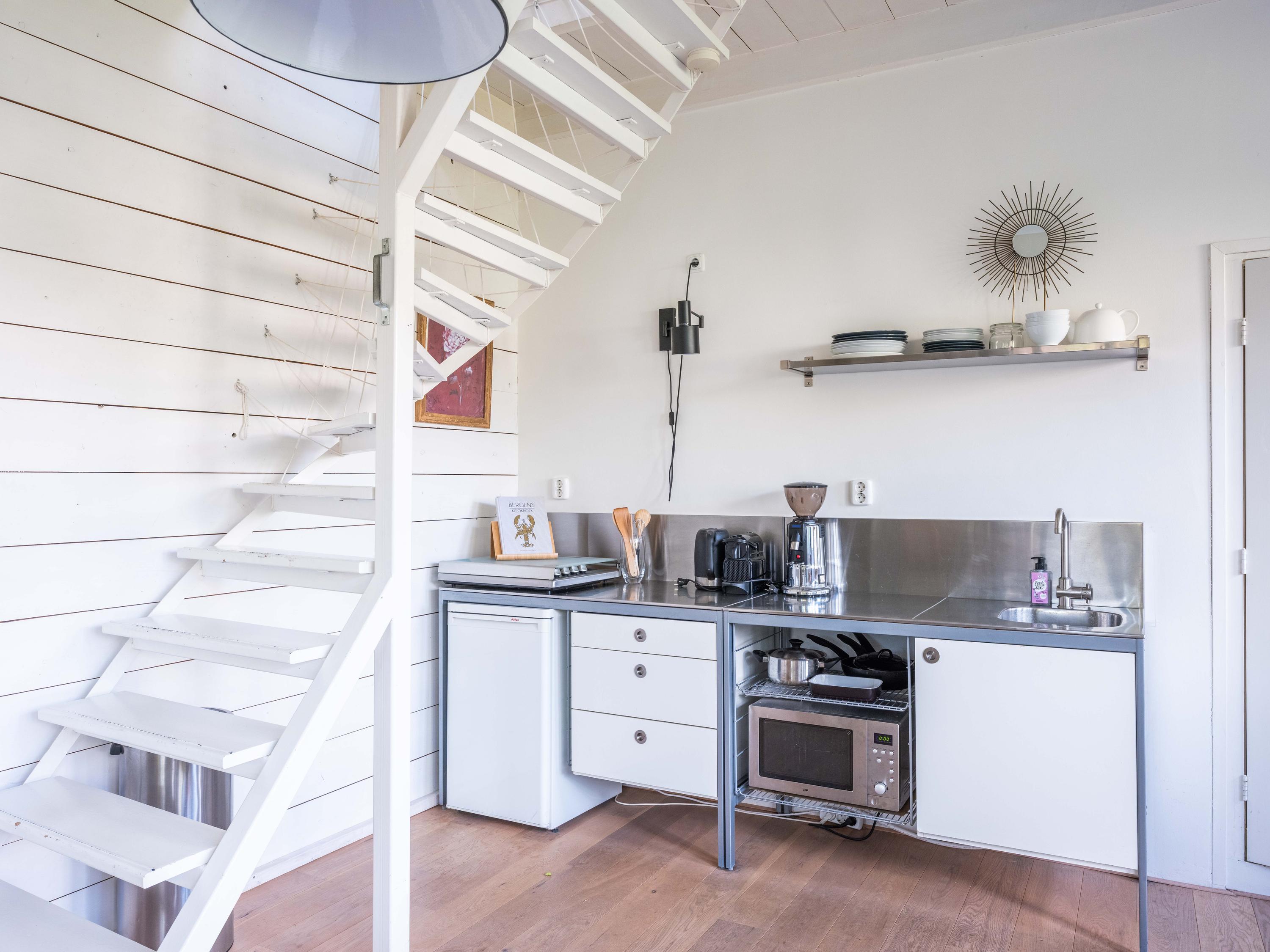 Aan de andere zijde van de woning bevindt zich het voormalige atelier, thans in gebruik als bijhuis met keukentje en slaapgelegenheid. Met ca. 80 m² vloeroppervlak en een eigen toegang is dit een heerlijk lichte ruimte, ideaal te gebruiken als atelier, kantoor aan huis, praktijkruimte of bijvoorbeeld als kangoeroewoning of verblijf voor een au-pair.