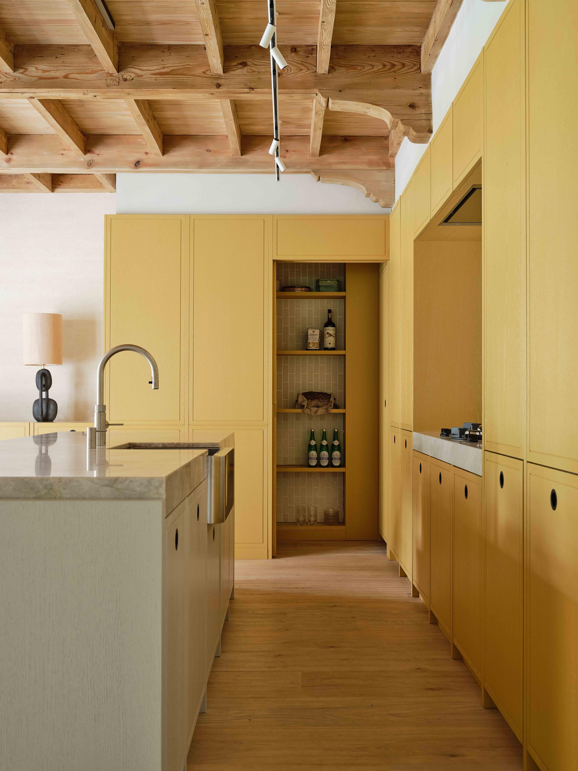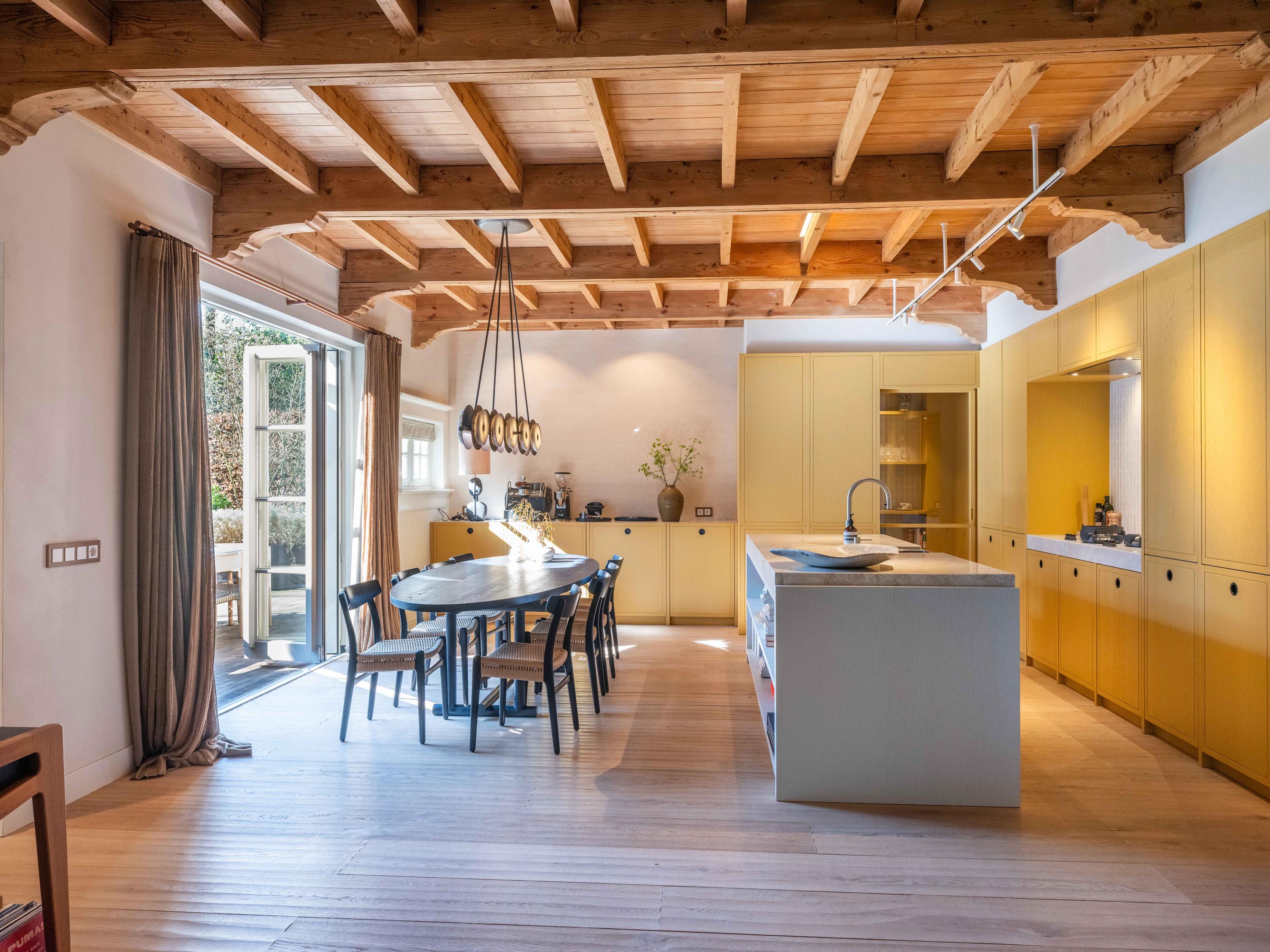 We gaan naar binnen: de entree geeft toegang tot een ruime hal met garderobekamer, modern toilet en toegang tot de kelder. Van hier uit loopt u door naar de royale woonkeuken, het centrale punt van de woning. Deze is uitgevoerd met een kookeiland, natuurstenen werkbladen en hoogwaardige inbouwapparatuur. Dankzij de openslaande deuren is er een directe verbinding met buiten.