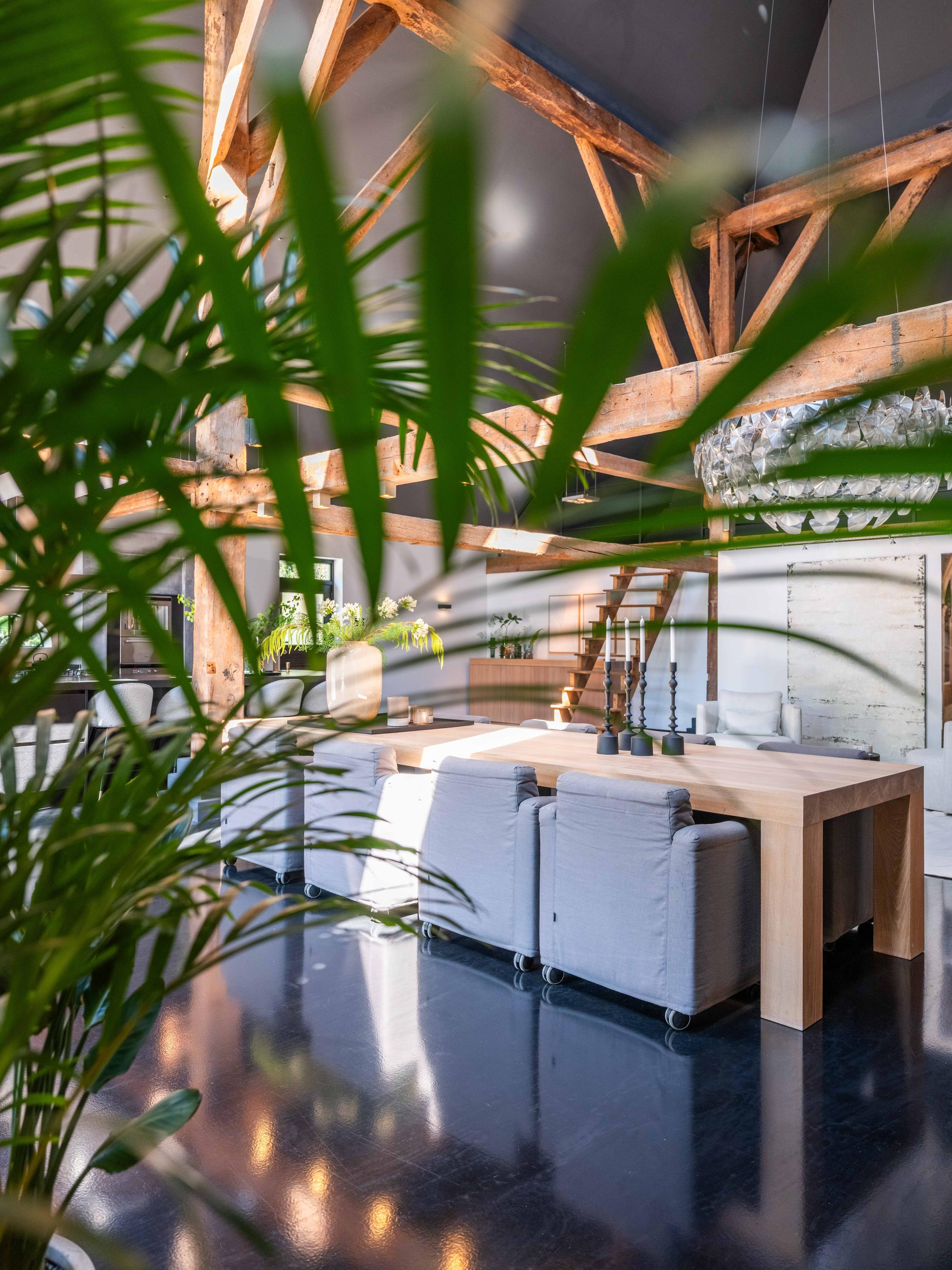 In de woonkamer valt de ruimte gelijk op. Het contrast van de kleuren in de woning versterken het stoere karakter van de woning. Deze zeer ruime living heeft een open haard en openslaande deuren naar de tuin. De moderne open keuken is uitgerust met diverse inbouwapparatuur, waaronder een Boretti 8-pits fornuis, een Amerikaanse koelkast met koffieapparaat en bordenwarmer, oven, en een ingebouwde koel- en vaatwasapparatuur.