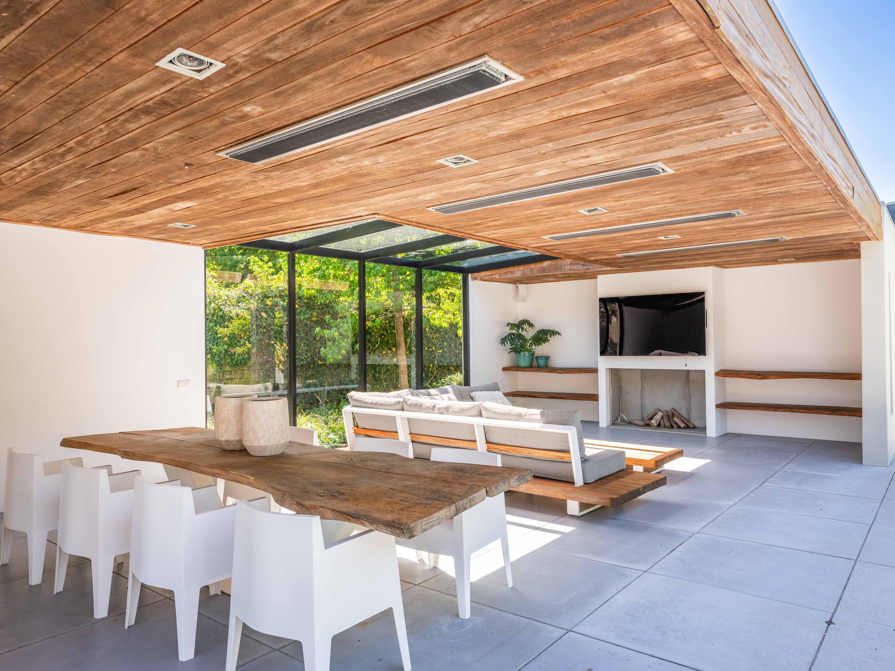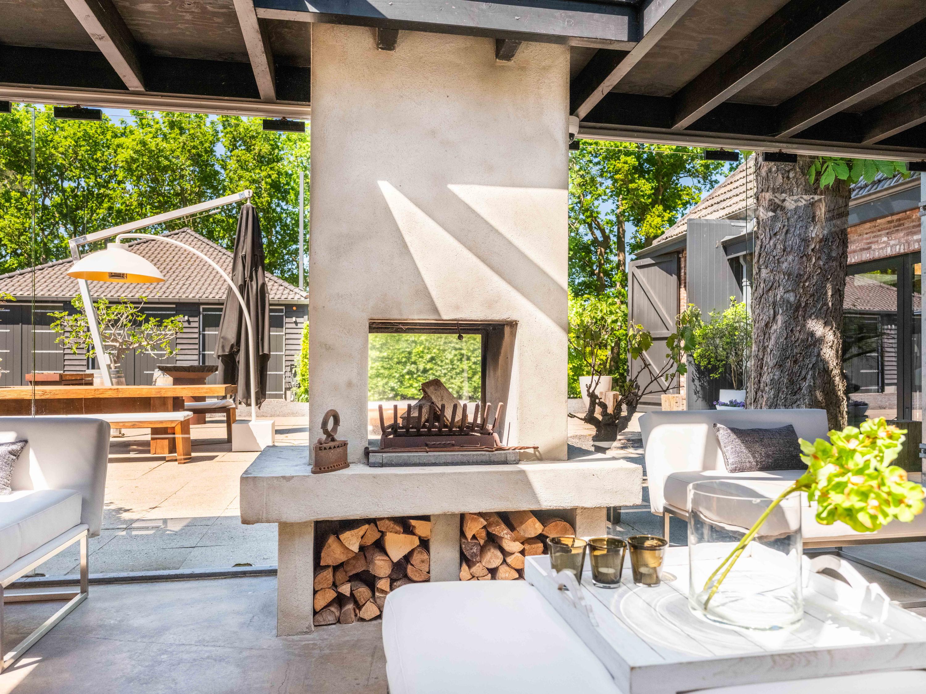 Vanuit de woonkamer heeft u toegang tot de serre, deze is uitgerust met een open haard, een pantry en een grote loungehoek. Vanuit de serre heeft u prachtig uitzicht over de ruim aangelegde tuin.