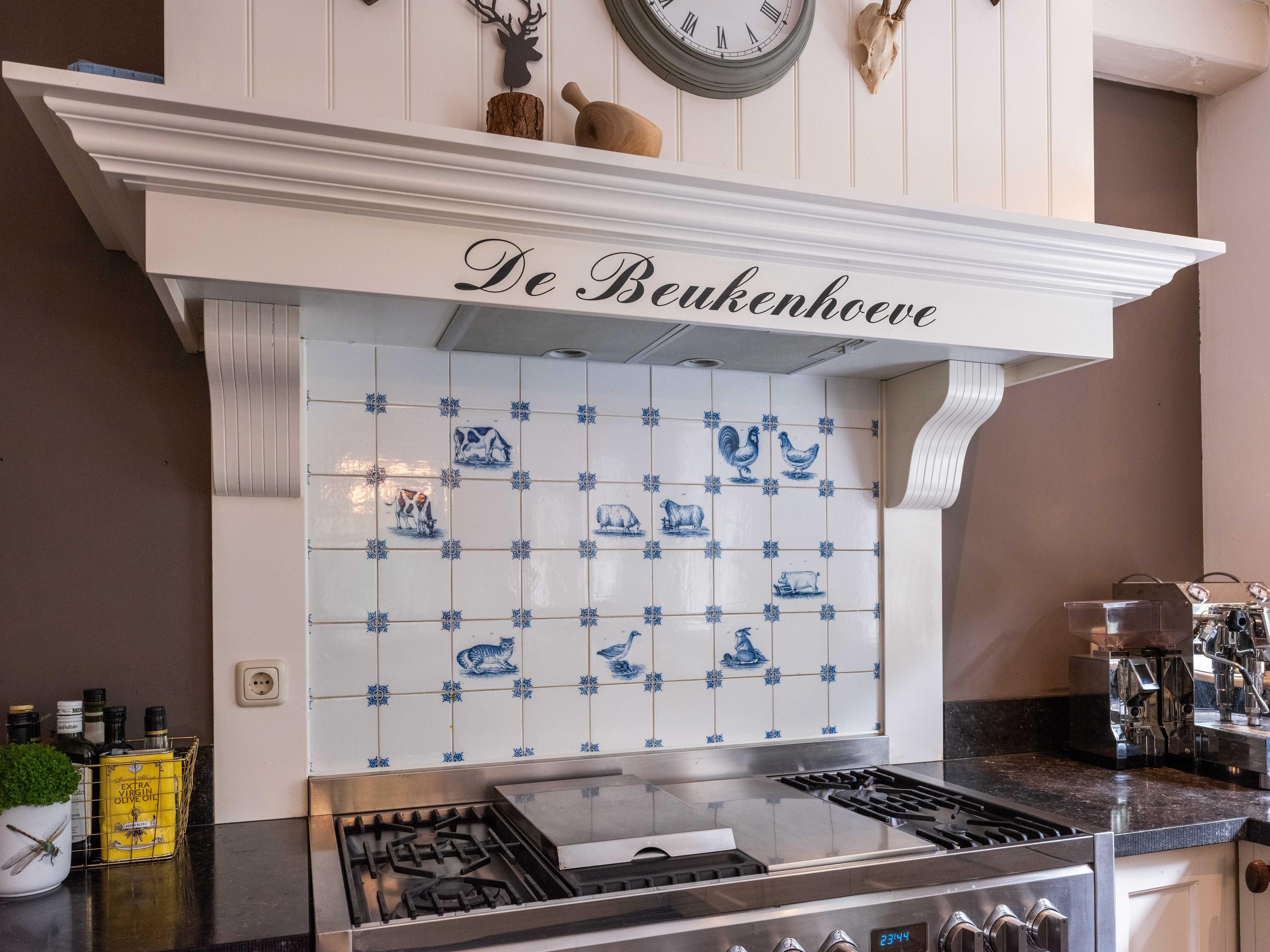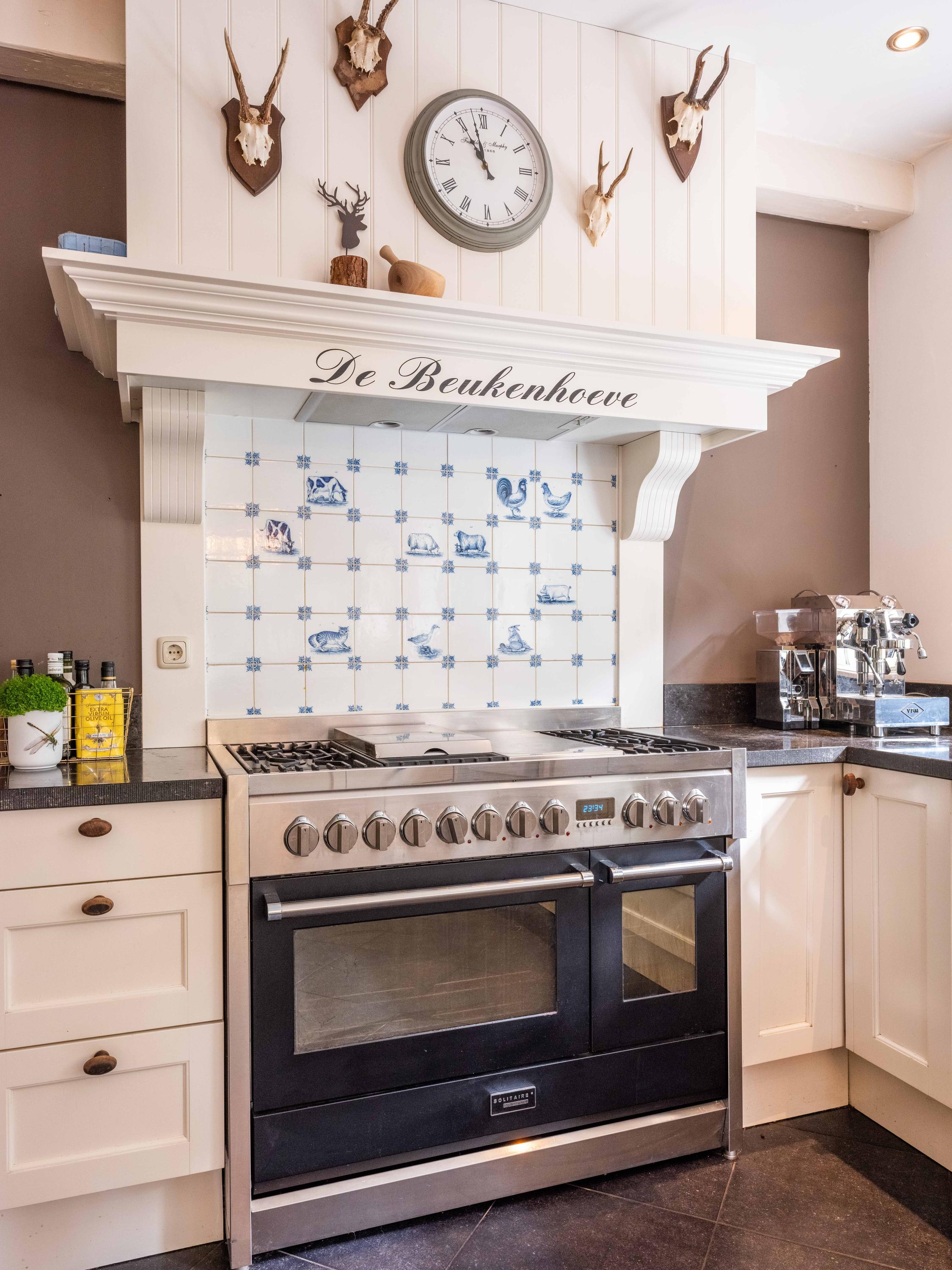 De ruime living van 18 meter lang is licht door de vele raampartijen. Kamer-en-suite deuren delen nu de ruimte in tweeën, waarvan een deel kantoor is. In de woonkamer vinden we een gezellige houtkachel en een deur naar het terras. De ruime landelijke open keuken heeft een opvallende schouw met groot fornuis. Aansluitend aan de keuken vinden we een waskamer met aansluiting voor wasmachine en droger en opbergruimte. Aangrenzend bevind zich een linnenkamer. Er is een bijkeuken met inbouwkasten over de gehele lengte en een keukenblok. De deur gaat naar het tweede terras grenzend aan de woning.