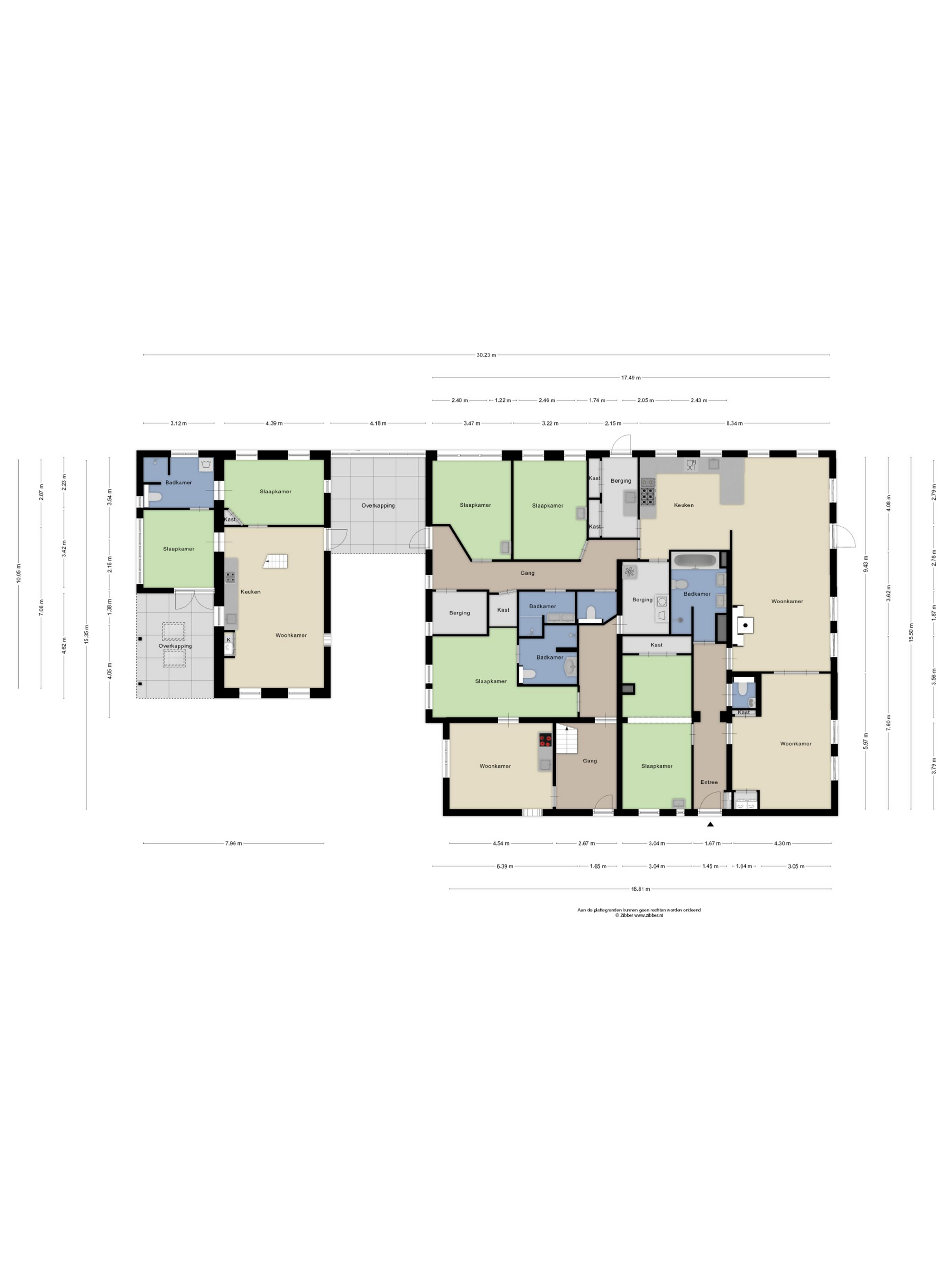 De begane grond is voorzien van nog 3 slaap/werkkamers, waarvan twee met wastafel. Inloopkast en alarm. Ook is er een extra, separaat ruim toilet en nog een extra badkamer voorzien van een inloopdouche en dubbele wastafel.