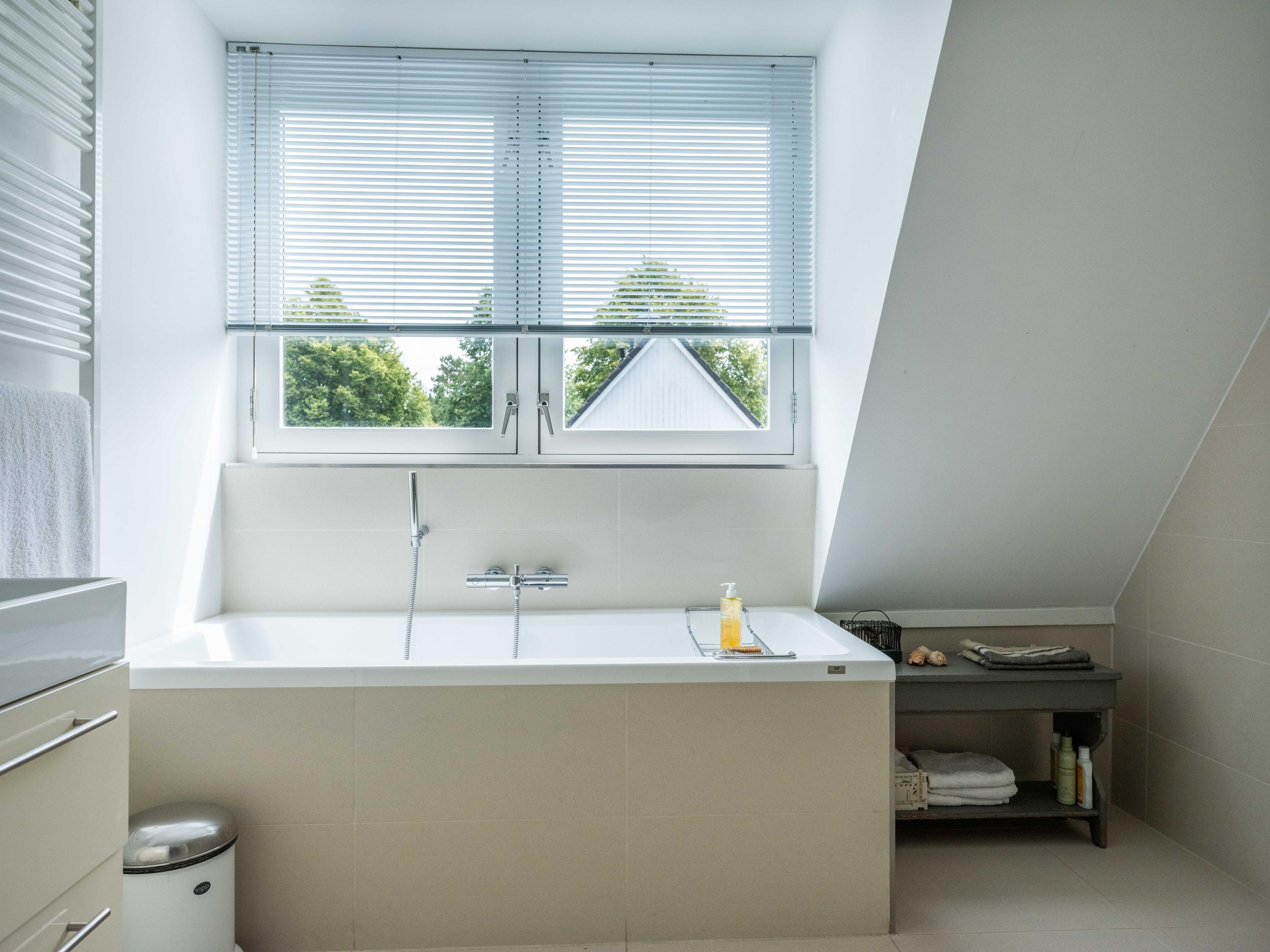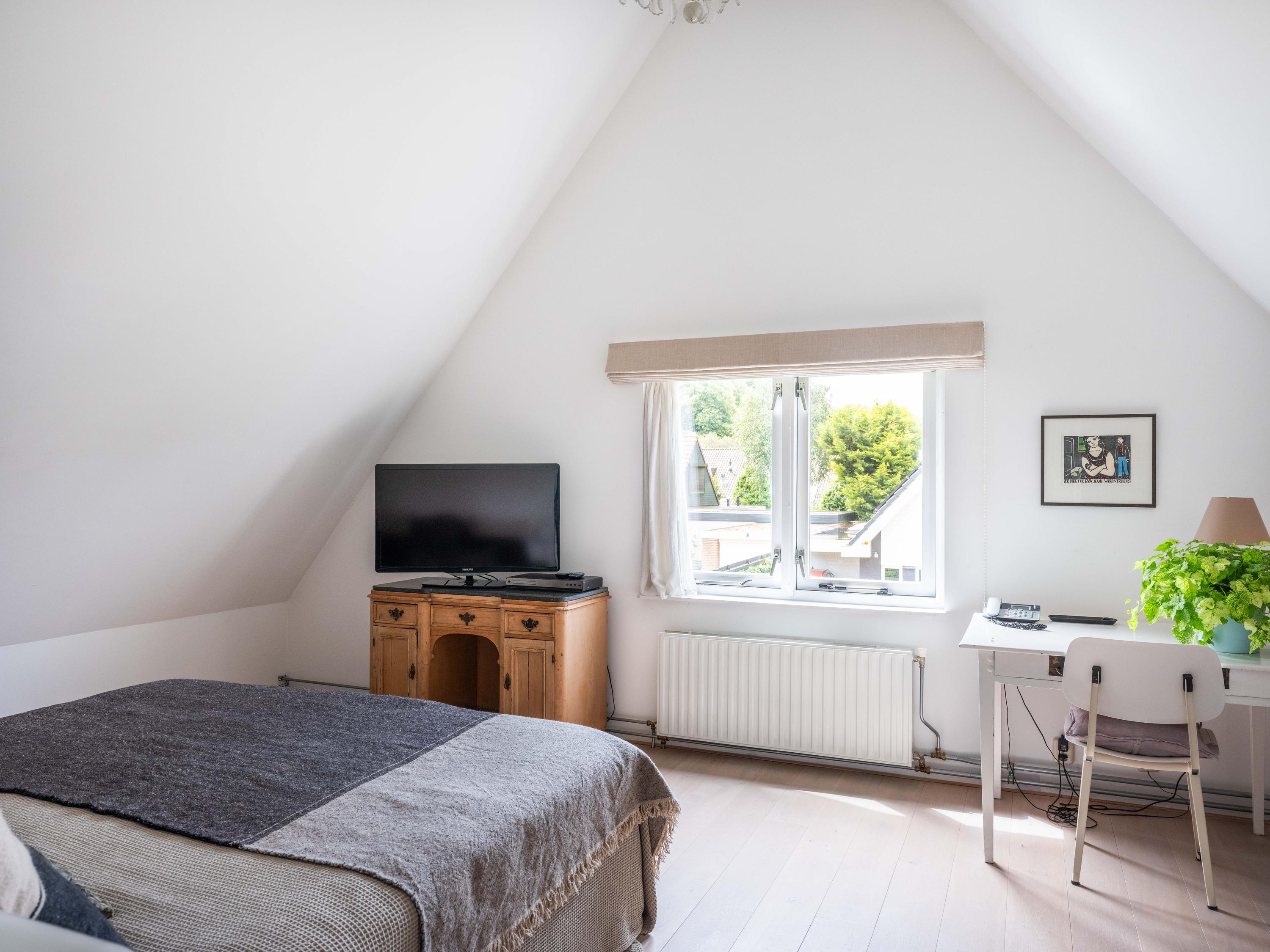 Op de eerste verdieping zijn twee ruime slaapkamers (waarvan één met airco) en een derde, kleinere slaapkamer. De badkamer heeft een dubbele wastafel, ligbad en inloopdouche. Op deze verdieping vindt u ook een ruim toilet en de was-/droogaansluiting. Een vlizotrap leidt naar de zolder die dient als bergruimte en waar de airco en ventilatie-installatie zich bevinden.