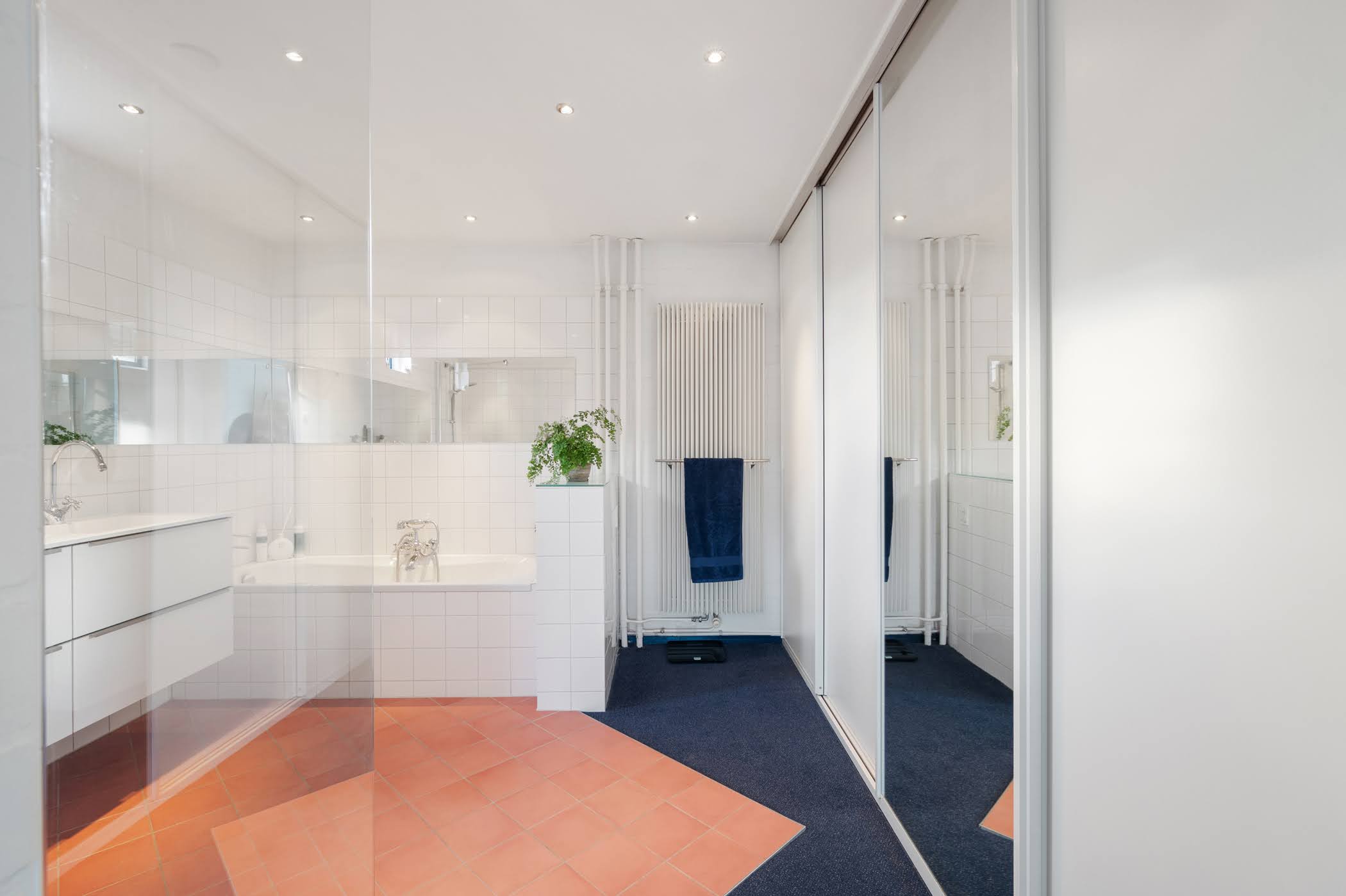 Op de overloop bevinden zich een toilet en een tweede badkamer, welke voorzien is van een douche, wastafel, planchet en spiegel.