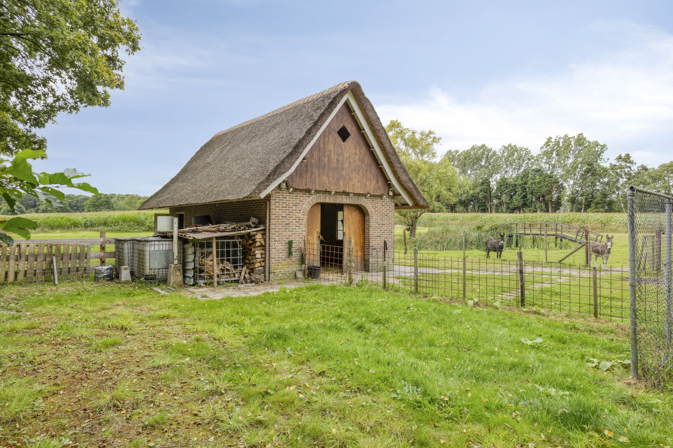 Dierenverblijf: afmeting 8 x 5 meter, met compleet nieuw rietgedekt dak inclusief hooizolder.