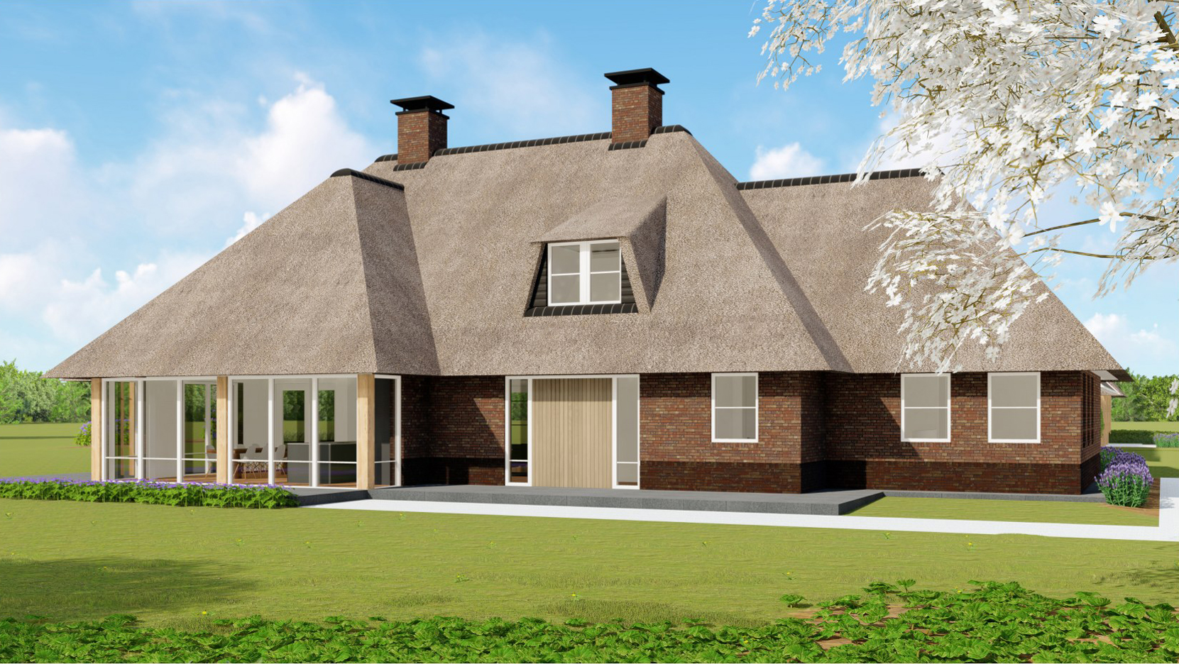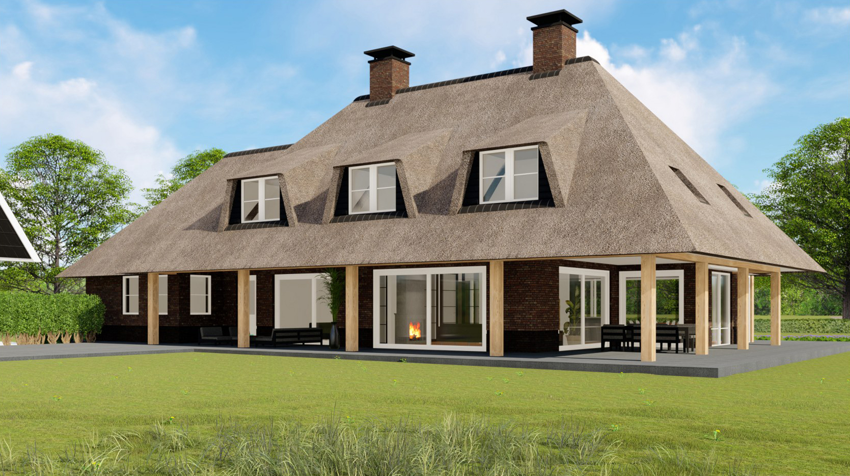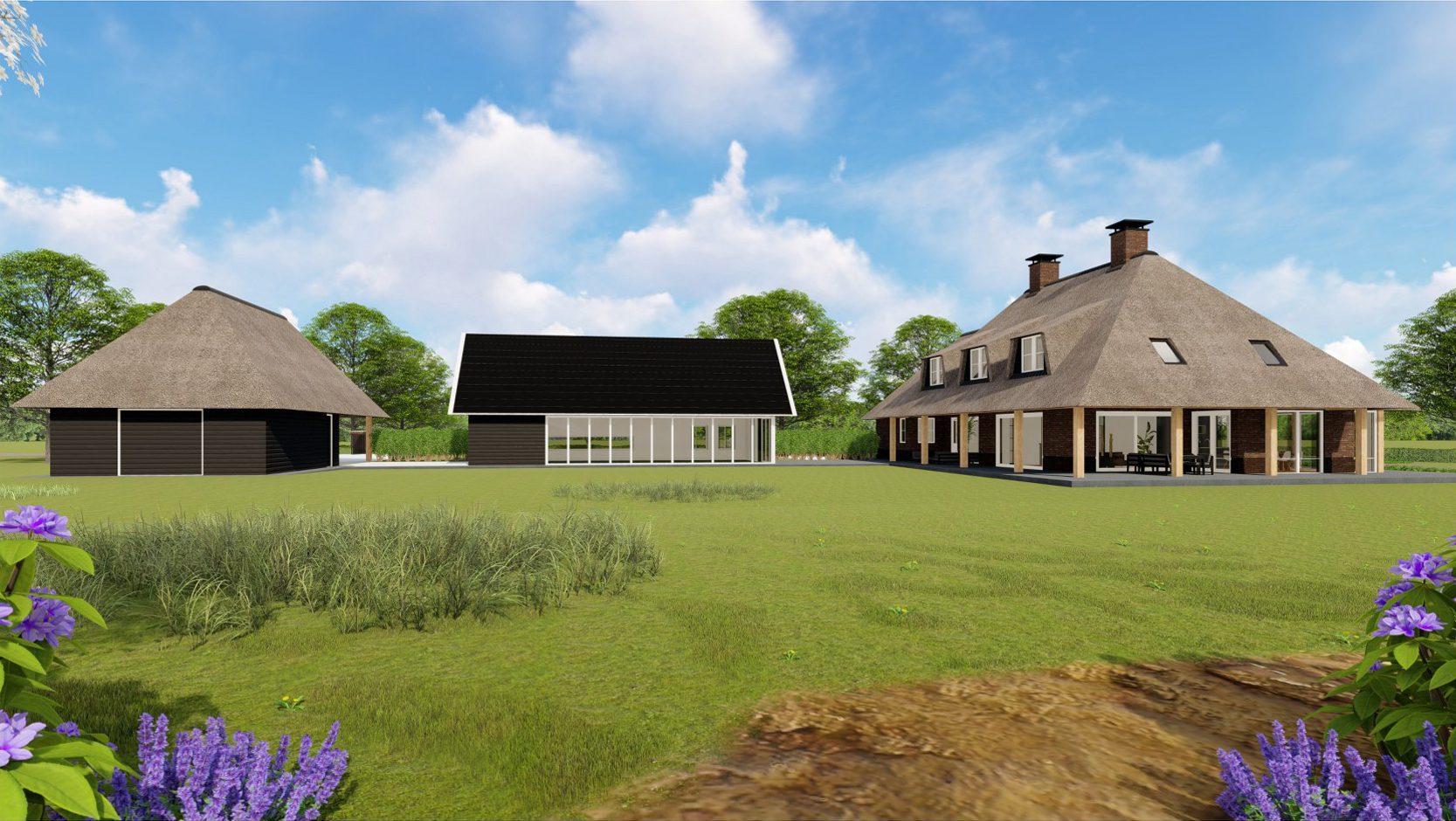 De architect betrokken bij dit ontwerp is Bekhuis & Kleinjan. Het ontwerp is gestoeld op landelijk wonen met een knipoog naar de traditionele Drentse boerderij maar dan met alle luxe en comfort van nu. Rieten daken met gemetselde schoorstenen, stoere eikenhouten palen en balken, grote raampartijen gericht op een prachtige natuurbeleving, brede dak overstekken met overdekte wine- & dine area’s, een pool house (of gastenverblijf) met wellness en een ruime dubbele garage met vliering en carport. Dit alles gesitueerd in een hoefijzeropstelling om maximale privacy te garanderen. Naast de bouwtekeningen is ook een tuinontwerp beschikbaar. De vergunning is verleend voor onbepaalde tijd, de woning vrij te plaatsen op de kavel, onder de voorwaarde dat het oude woonhuis wordt gesloopt.