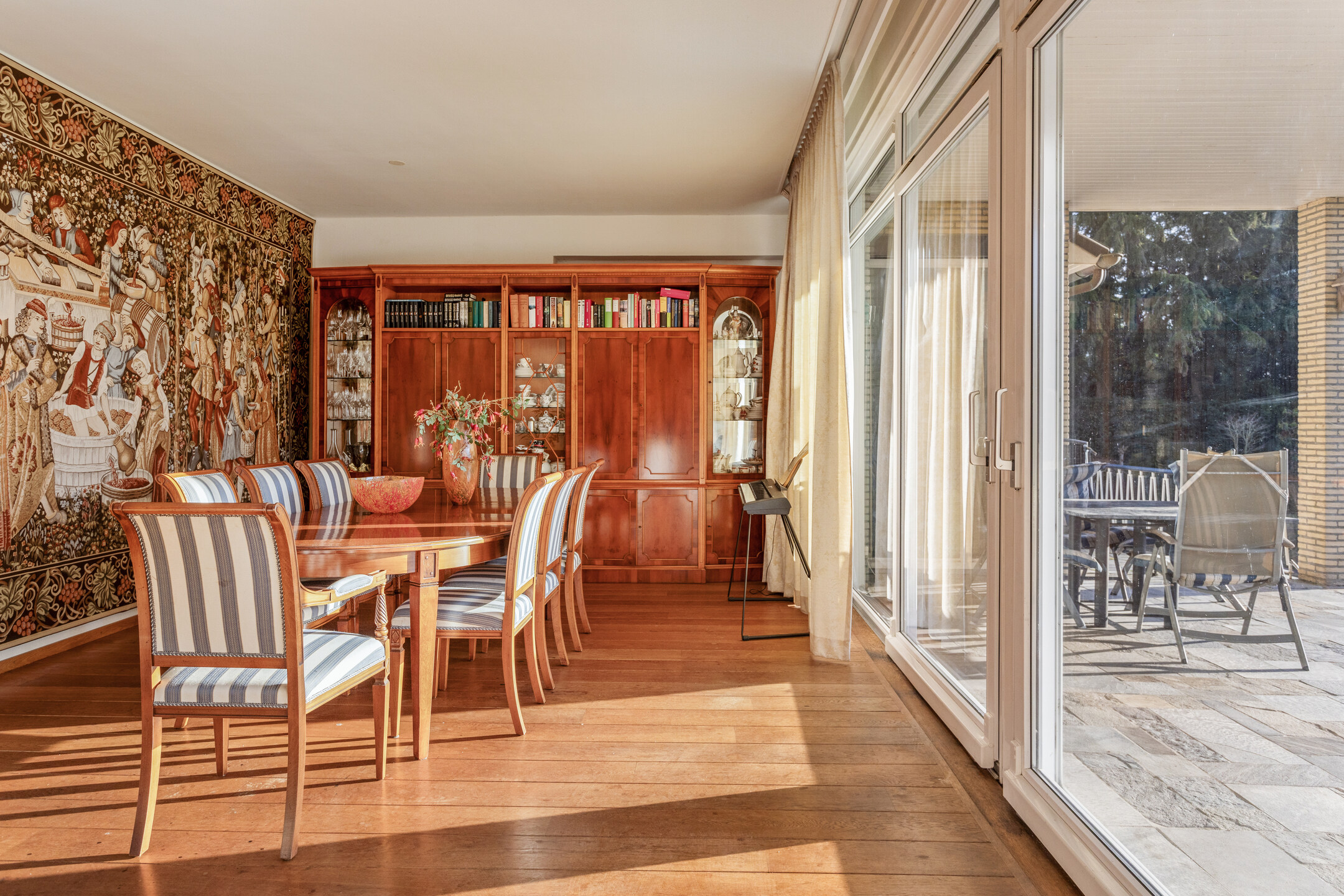 - Een lichte, royale woonkamer met panoramisch uitzicht op de tuin, open haard van Bentheimer zandsteen en directe toegang tot het overdekte terras.