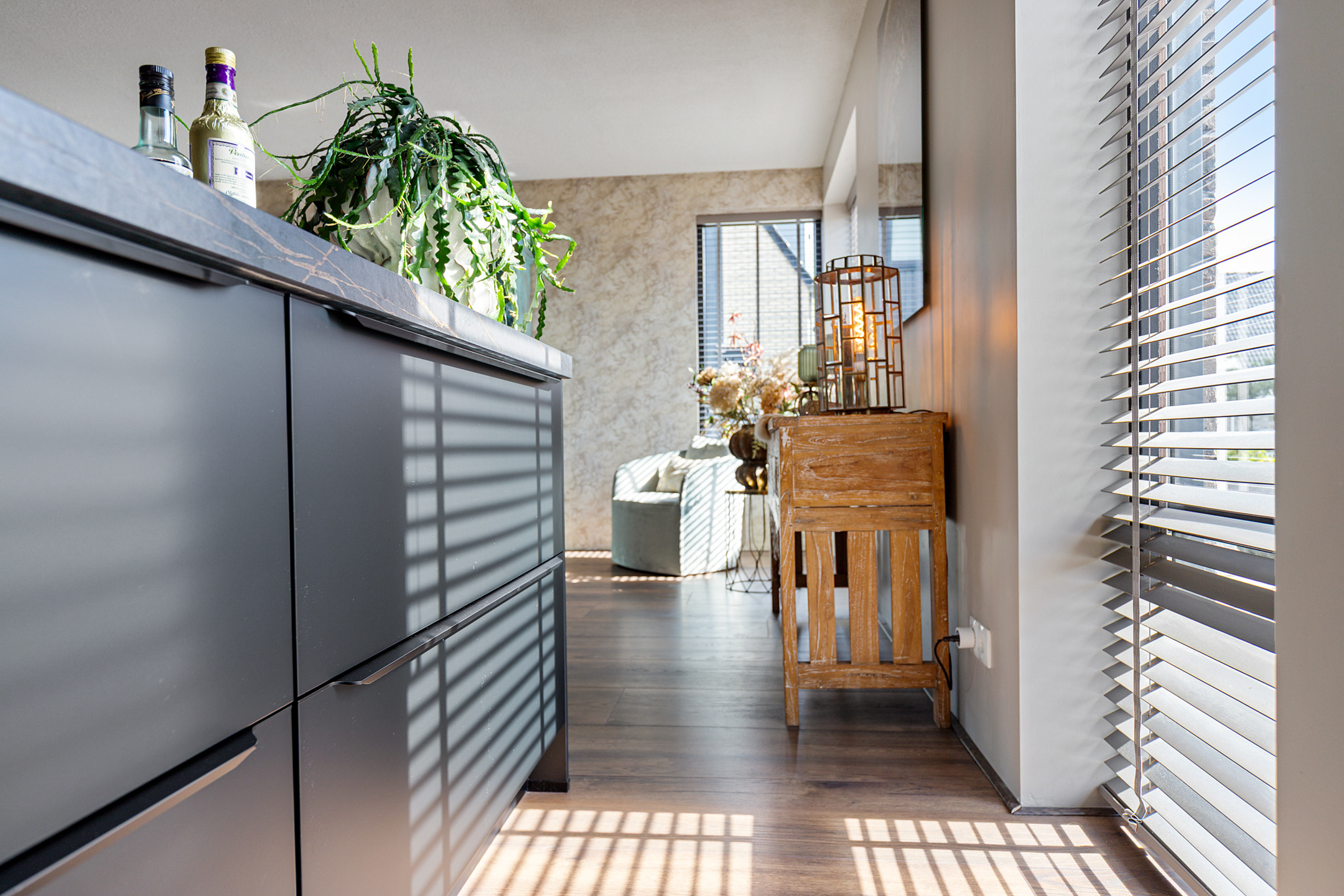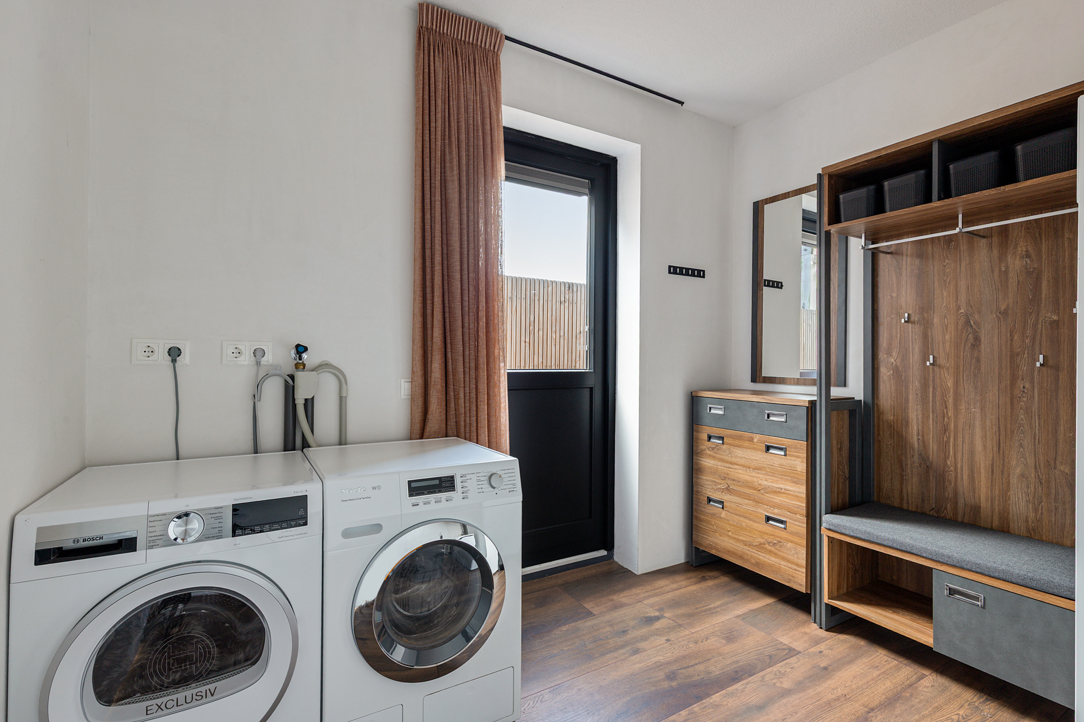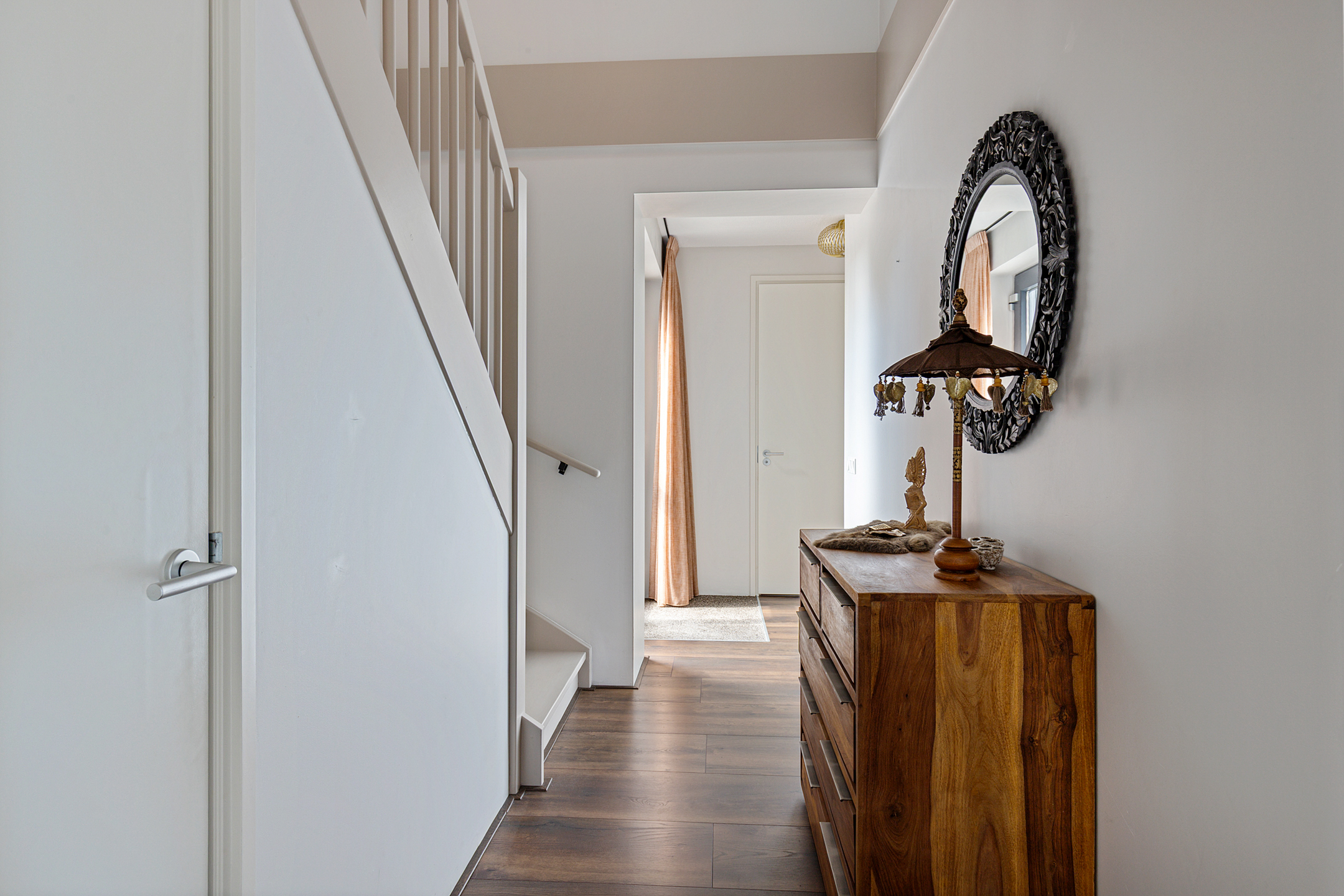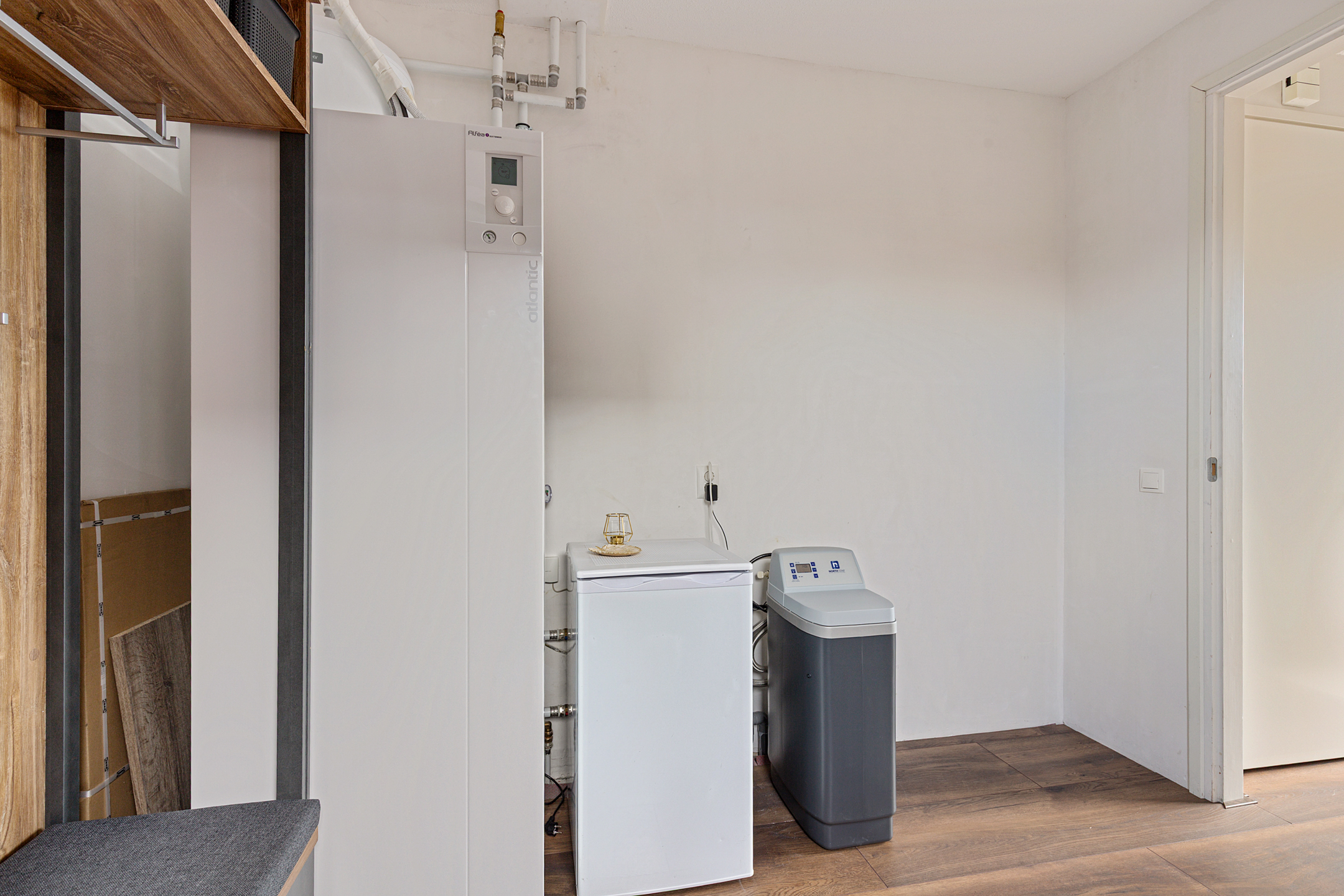 Via de ruime entree bereikt u de hal met stijlvol extra royaal gastentoilet, trapopgang met vide en toegang tot zowel de bijkeuken als de living. De woonkamer is sfeervol gepositioneerd aan de beschutte tuinzijde en vormt samen met de lichte woonkeuken een speelse, open leefruimte. De keuken aan de voorzijde is maatwerk en voorzien van hoogwaardige afwerking en inbouwapparatuur zoals robuuste decton bladen, koffiehoek, vaatwasser, combi heteluchtoven, grote Bora inductie kookplaat met geïntegreerde afzuiging, Quooker, inbouw koel- vriescombinatie, terwijl de woonkamer uitnodigt tot ontspannen in een knusse zithoek. De tuinkamer is een volwaardige uitbreiding van de leefruimte. Dankzij de glazen pui die volledig geopend kan worden, vloeien binnen en buiten naadloos in elkaar over. In de warmere maanden ervaart u een maximale tuinbeleving, terwijl in de koelere seizoenen een behaaglijke loungeplek behouden blijft. De bijkeuken herbergt de warmtepompinstallatie met 190 liter boiler, aansluitingen voor wasapparatuur en een waterontharder. De fluisterstille luchtwarmtepomp is zorgvuldig buiten de woning geplaatst. De gehele begane grond is voorzien van een stijlvolle laminaat-vloer en wordt verwarmd en gekoeld middels vloerverwarming.