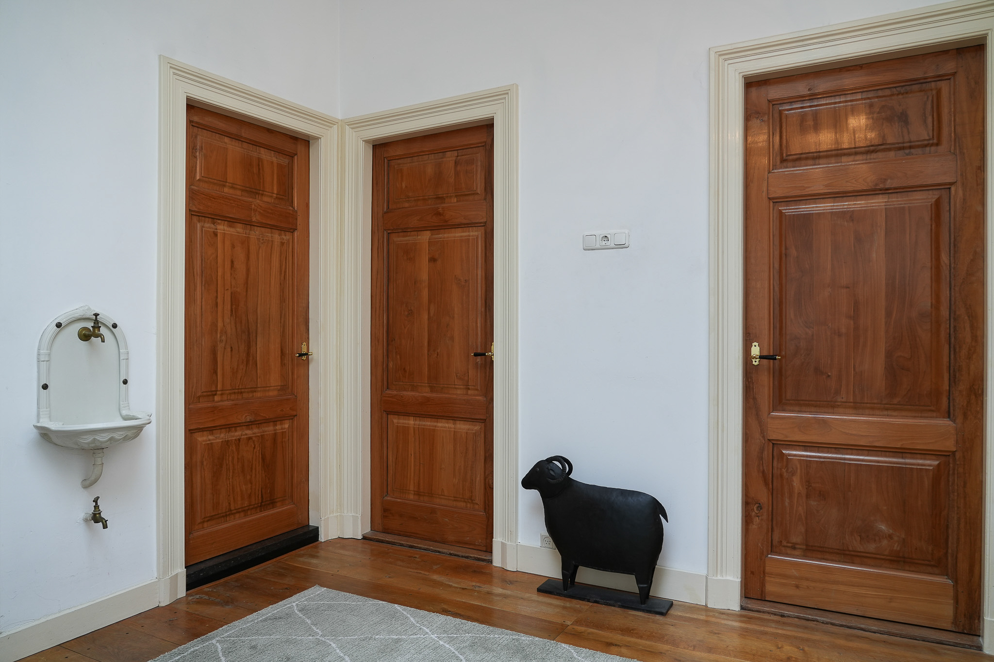 Aan de achterzijde ligt de grootste slaapkamer met antieke schouw, geornamenteerd stucplafond, garderobewand en balkon. Aangrenzend bevindt zich de wasruimte met aansluitingen voor wasmachine, droger en de cv-ketel. De badkamer is compleet ingericht met ligbad, inloopdouche, twee wastafels en vloerverwarming. De toiletruimte grenst aan de overloop.