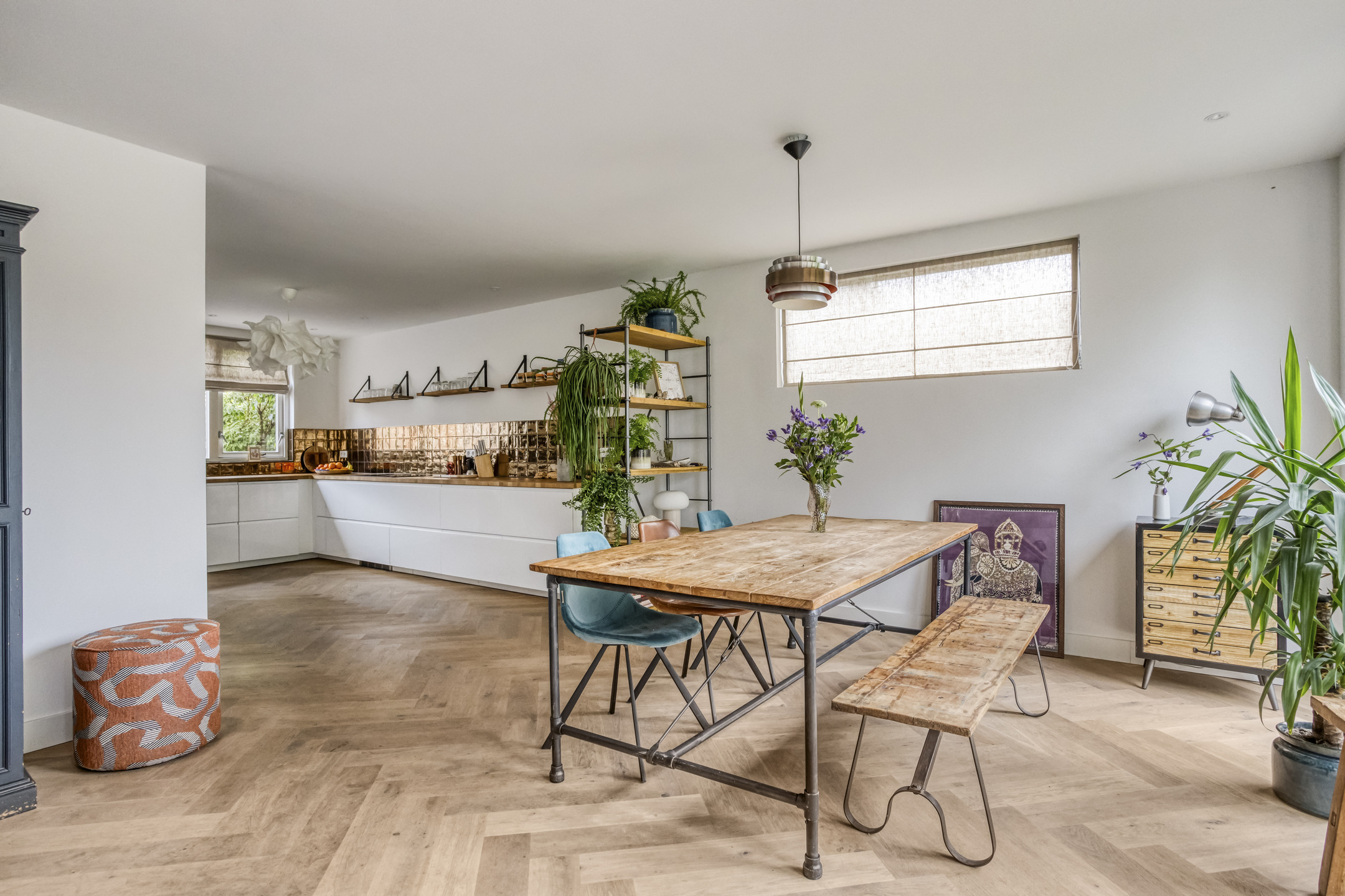 De woonkamer? Heerlijk licht, met openslaande deuren naar de tuin en een gezellige houtkachel voor de winteravonden. Hoge plafonds en originele oude balken maken het af en doordat een deel van de garage bij de woonkamer is getrokken is deze extra ruim! Wilt u uitbouwen? De fundering voor een eventuele uitbouw ligt er al.