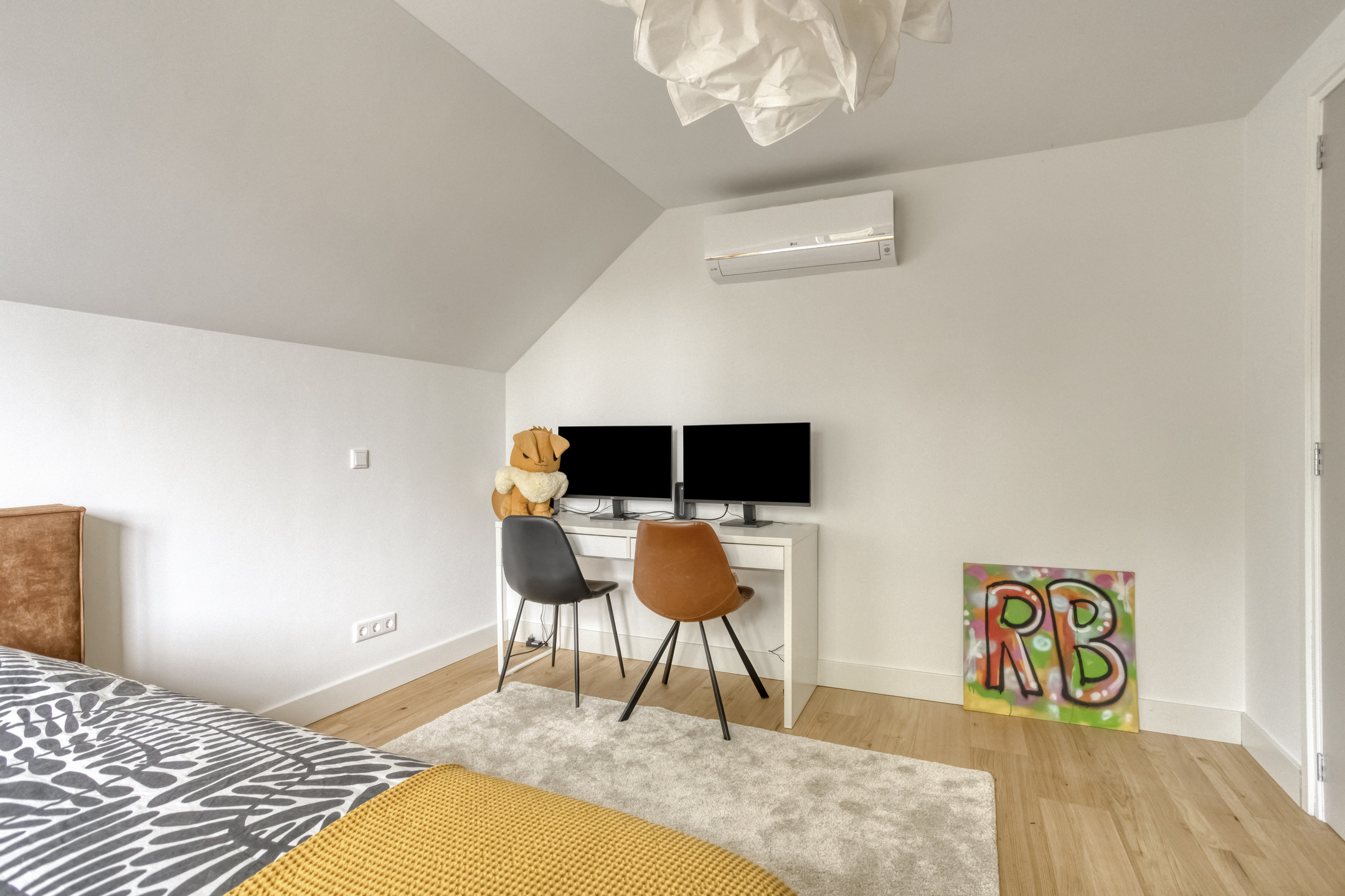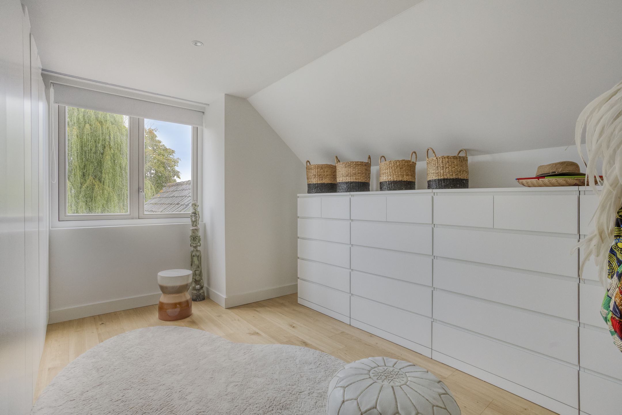 Op de 1e verdieping zijn drie slaapkamers, waarvan één is omgetoverd tot een royale walk-in-closet aansluitend aan de slaapkamer. Dit is eenvoudig weer terug te brengen naar 2 losse slaapkamers. De badkamer is luxe afgewerkt en is voorzien van vloerverwarming, twee stijlvolle natuurstenen waskommen met gunmetal kranen, een eiken wastafelmeubel, een inloopdouche en een 2e toilet.