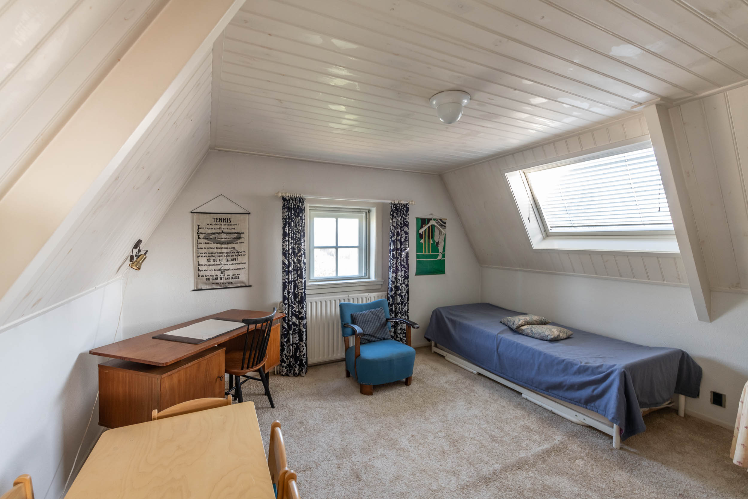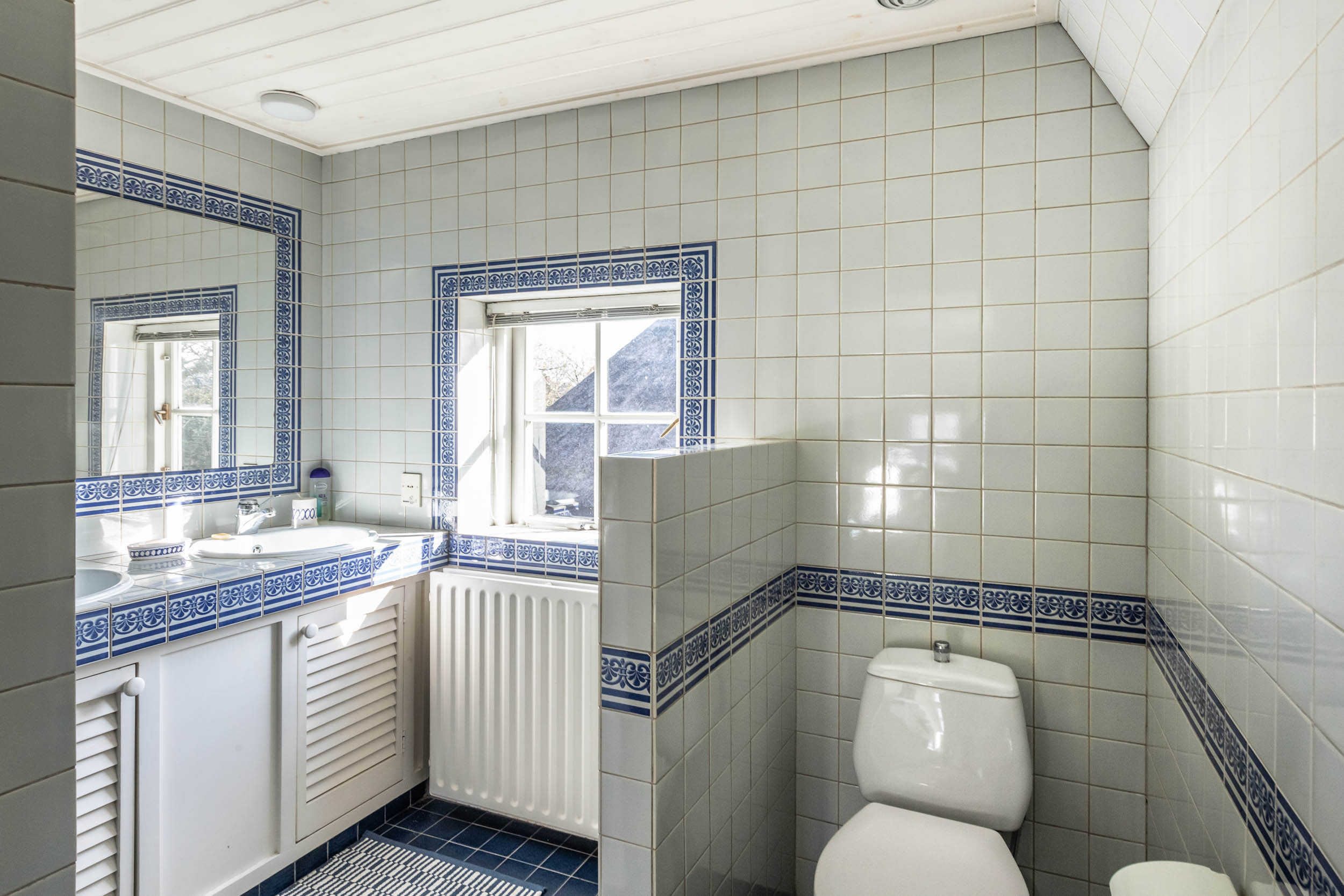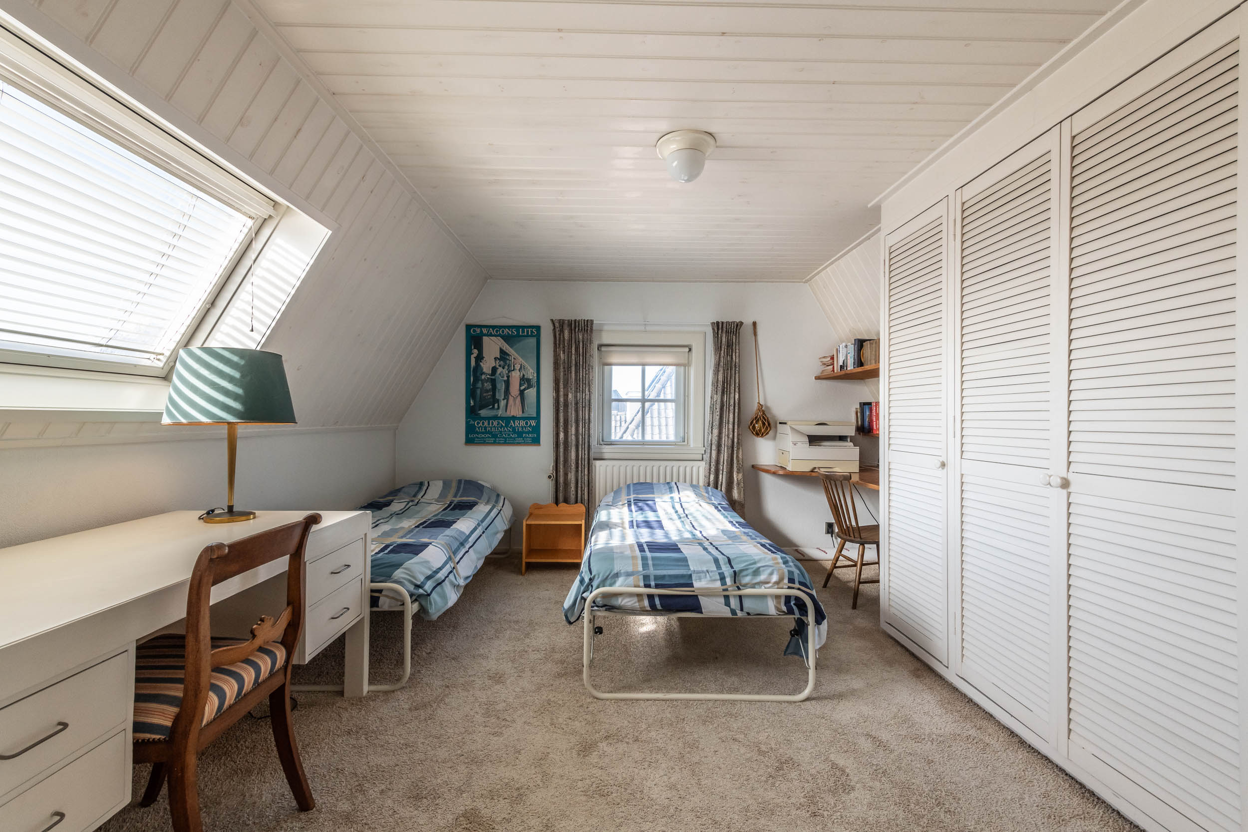 The landing features a large dormer window. On this floor, there are two bedrooms, both with a skylight and fixed cupboards. The landing also provides access to a large storage room with the boiler system. This floor also has a 2nd bathroom with walk-in shower, toilet and washbasin with double sinks. An attic ladder provides access to the large attic with plenty of headroom.