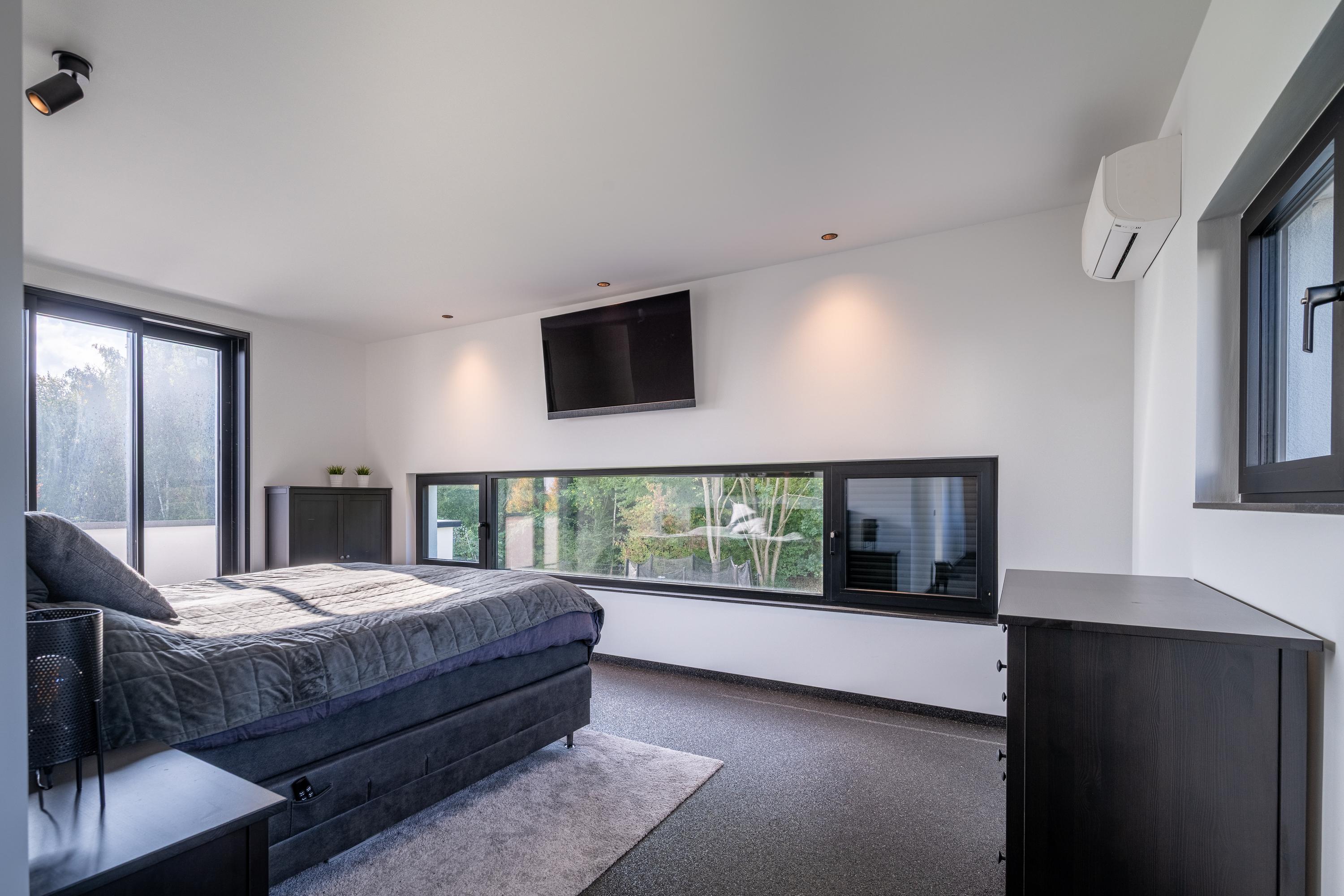 Een bijzonder detail is het grote bloemenraam, dat zorgt voor een speelse doorkijk naar de tuin en de bosrand. In combinatie met de grote schuifpui naar het overdekt terras ontstaat een ruimtelijk en open geheel, waarin binnen en buiten op harmonieuze wijze in elkaar overlopen. De woonkamer en keuken zijn beide voorzien van een airco unit.
