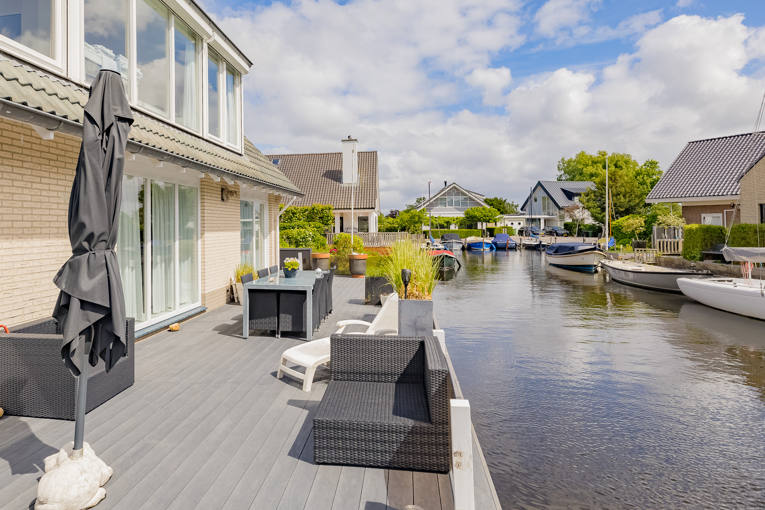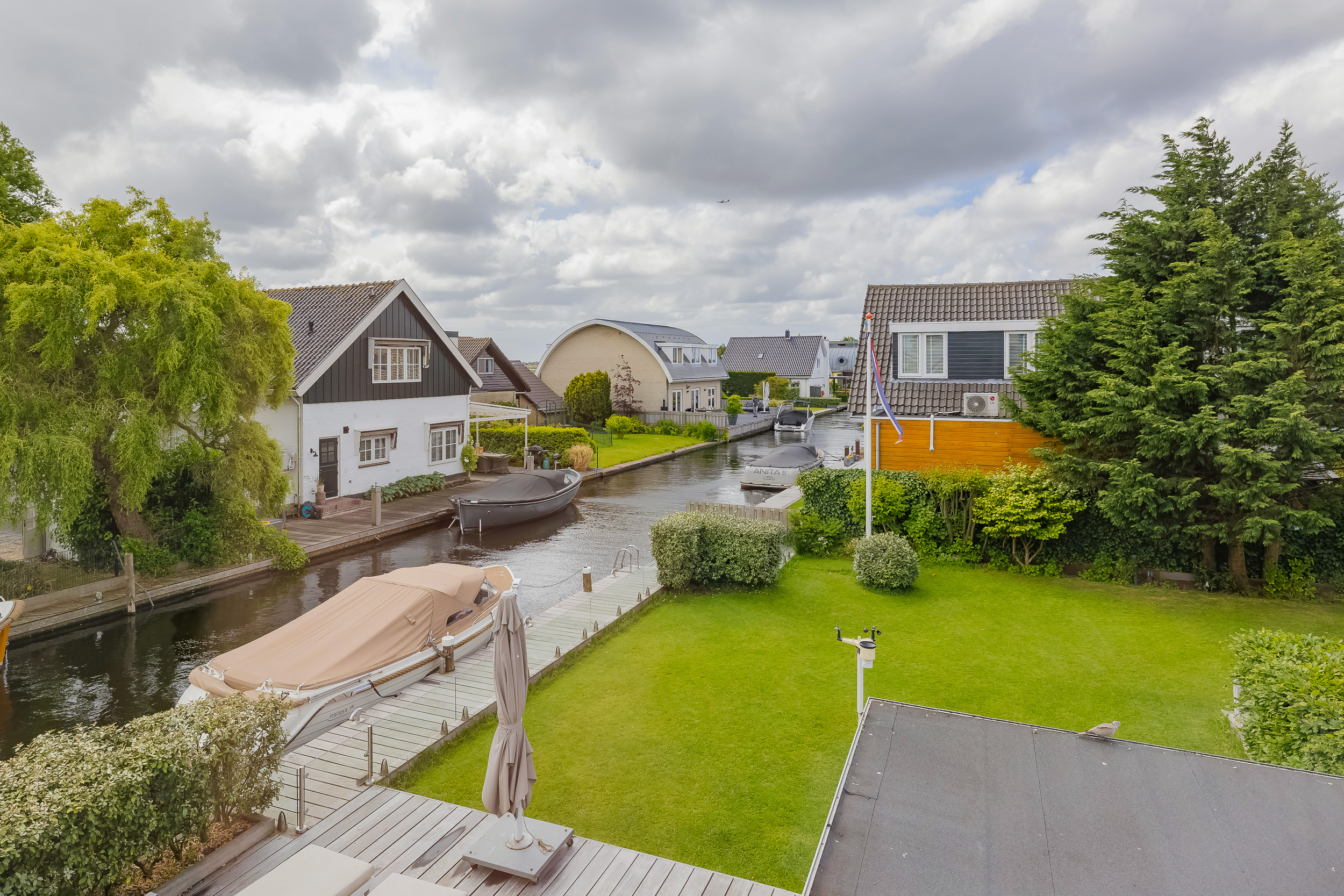 De fraai aangelegde voortuin met hagen, sierpaden en sierhekwerk biedt volop rust en parkeergelegenheid op eigen terrein. Achter de woning ligt het royale kunststof vlonderterras, een heerlijke plek om te ontspannen in de zon of juist in de schaduw. Uw eigen boot legt u eenvoudig aan bij uw eigen steiger – varen wordt zo wel héél verleidelijk. Een handige berging maakt het plaatje compleet.