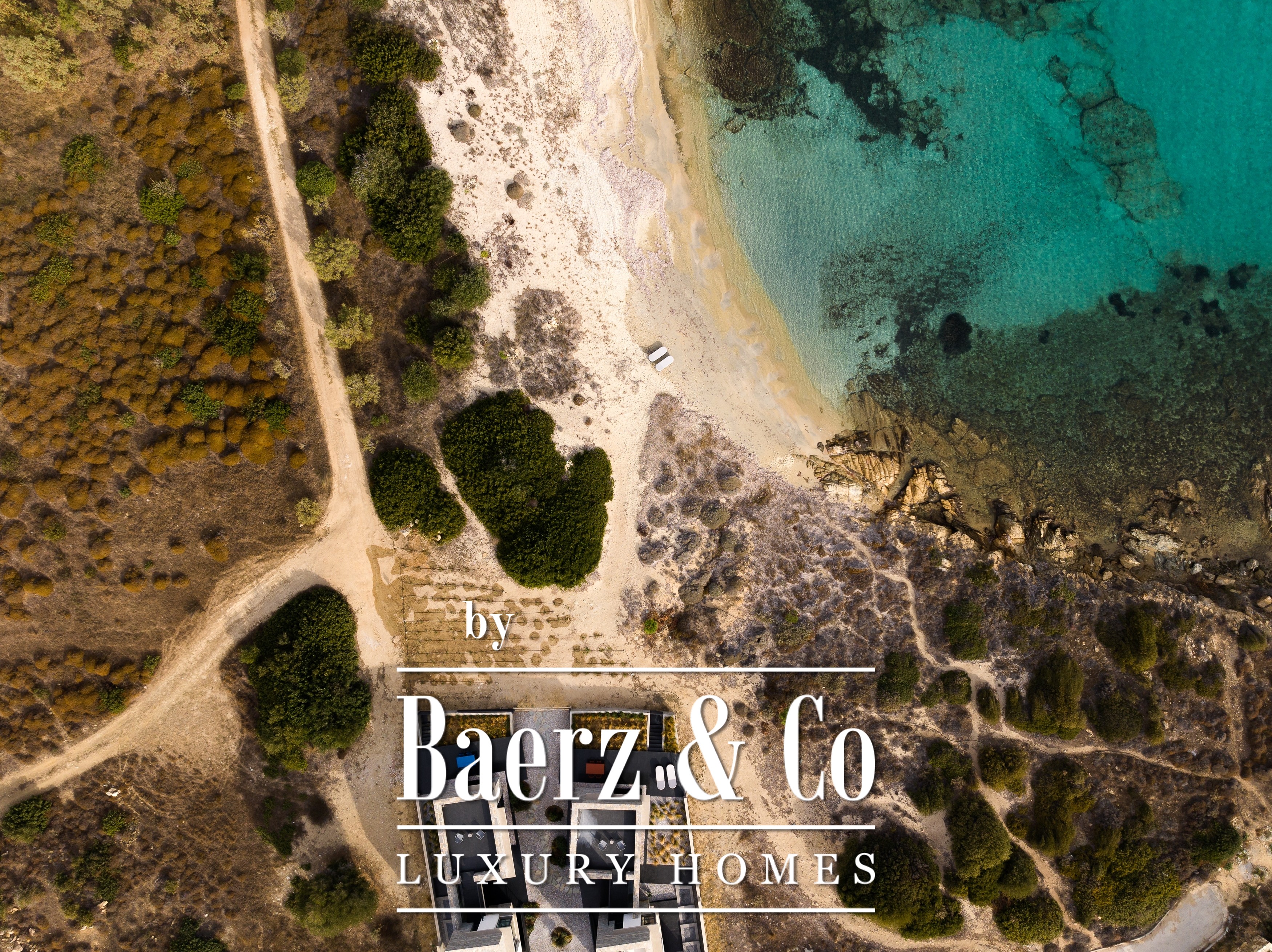 Buitenleven staat centraal bij Villa Helios. Royale terrassen openen zich direct naar het strand, waardoor u binnen enkele stappen met uw voeten in het zachte witte zand staat. Of u nu geniet van uw ochtendkoffie met uitzicht op zee, ontspant in volledige privacy of de zon ziet ondergaan boven de Egeïsche Zee, de omgeving biedt een zeldzaam gevoel van rust en verbondenheid met de natuur. De vloeiende overgang tussen binnen en buiten creëert een ontspannen maar verfijnde levensstijl aan zee.