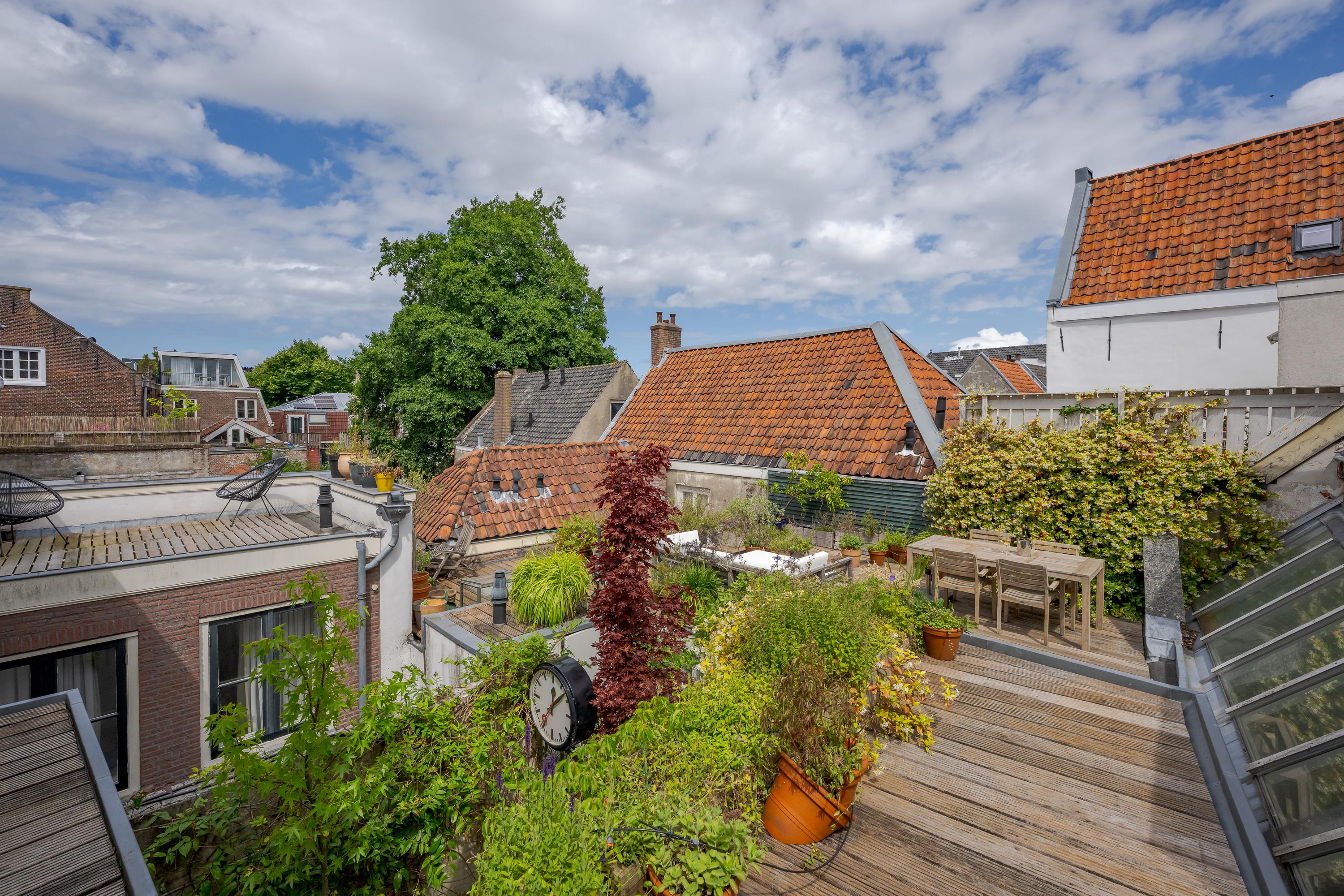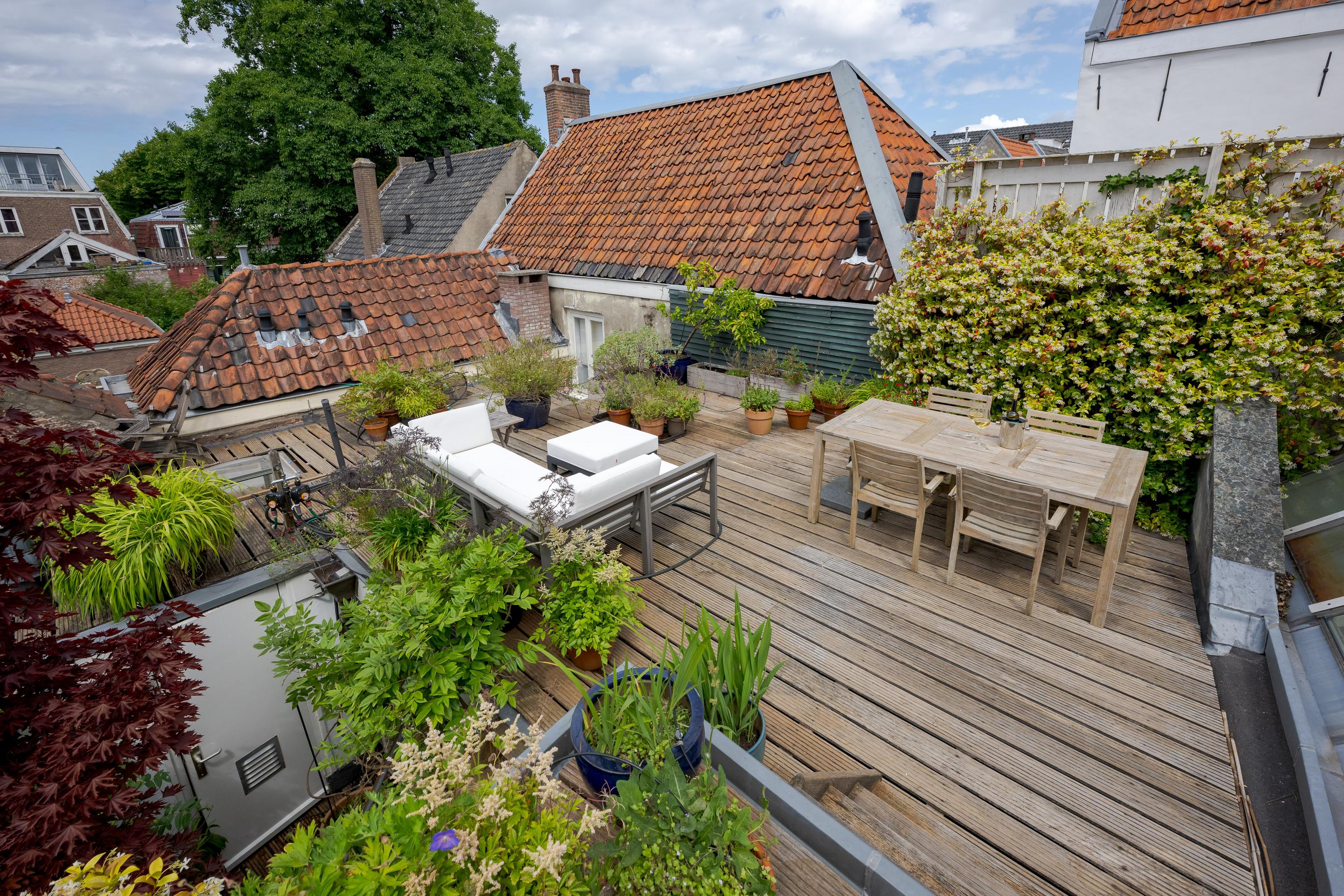 Wat dit pand verder uniek maakt, is de bijzondere combinatie van een statige, klassieke gevel aan de grachtzijde (drie ramen breed op het zuiden) en een verrassend royale achterzijde van ruim negen meter breed. Op de eerste verdieping, in het hart van de woning, ligt een kleurrijke binnentuin en een tiental treden hoger een riant en zonnig dakterras met volop privacy en meerdere zitplekken.