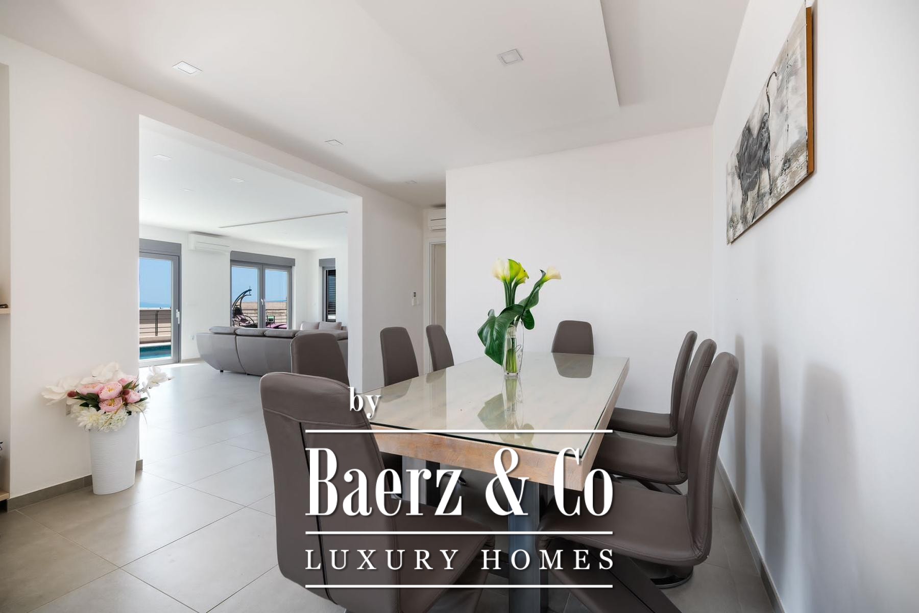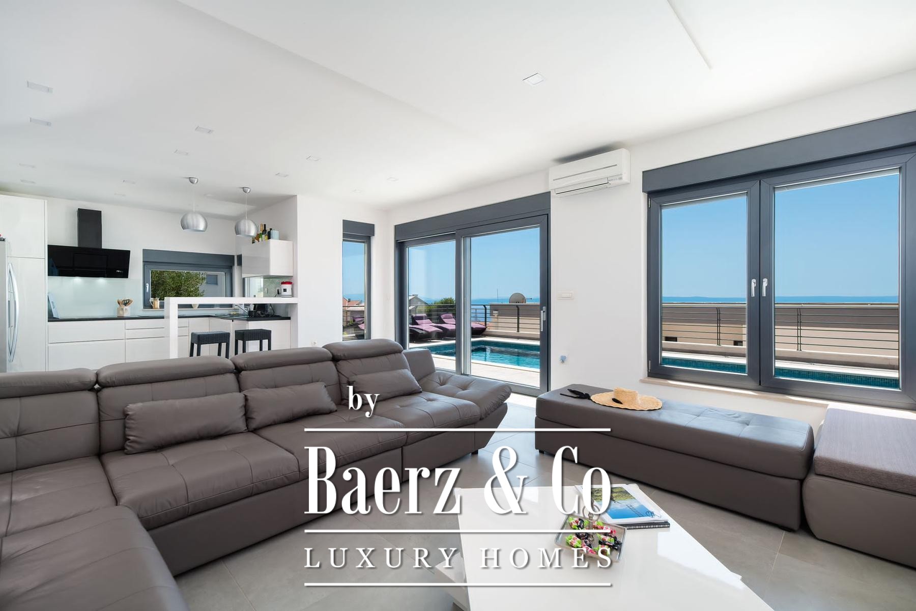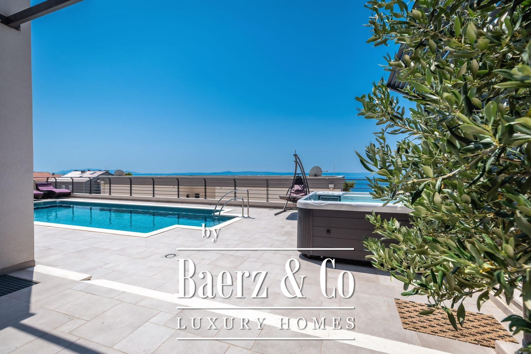 Vloer-tot-plafond glas schuift open vanuit de woonkamer naar het terras met zwembad, jacuzzi, zonneweide en een buitenbarbecue te midden van de privési tuin. Airconditioning door het hele huis garandeert comfort in elk seizoen, terwijl parkeergelegenheid discreet onderdak biedt aan gasten. Deze villa in Makarska biedt een zeldzaam samenspel van mediterraan licht en hedendaags design.