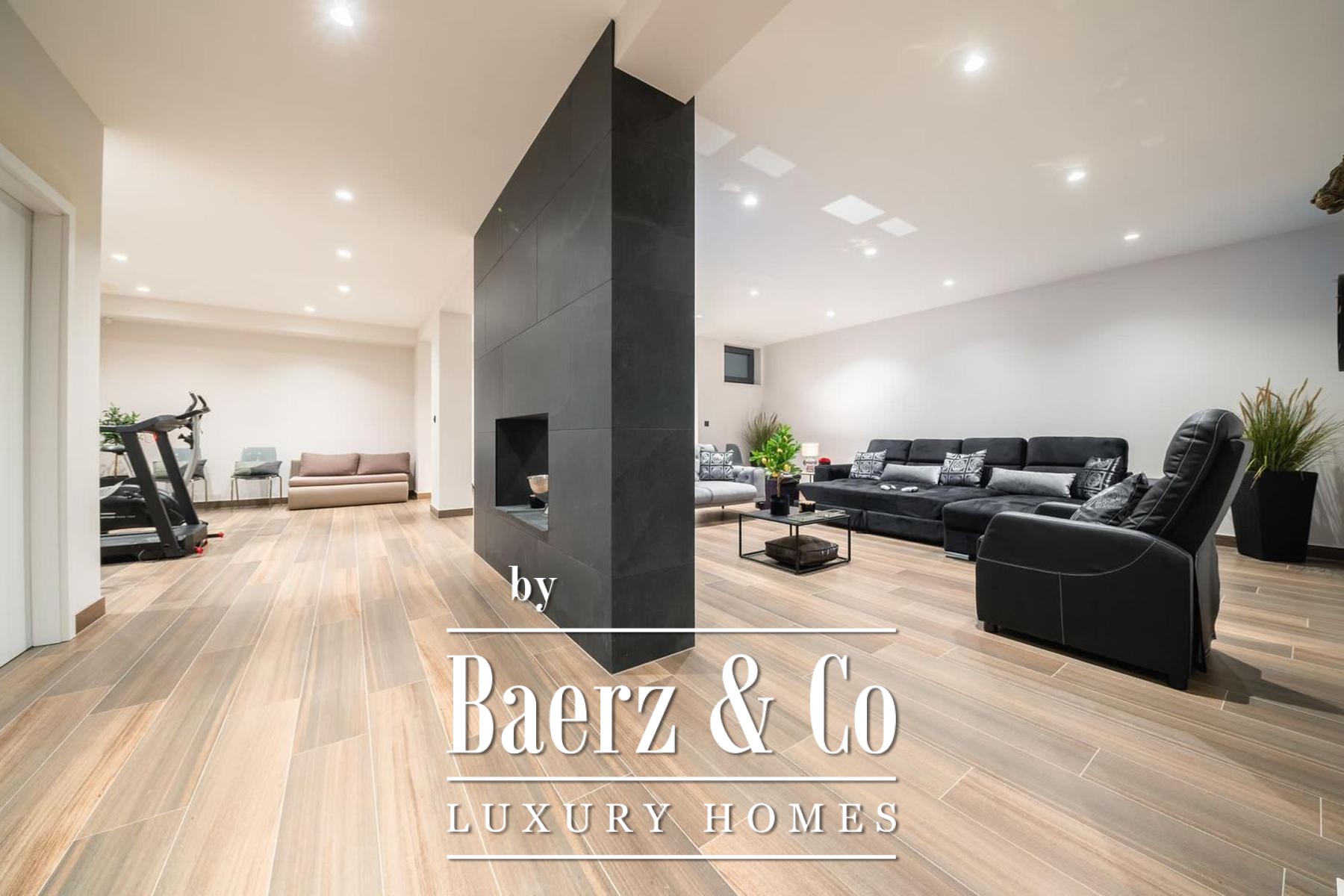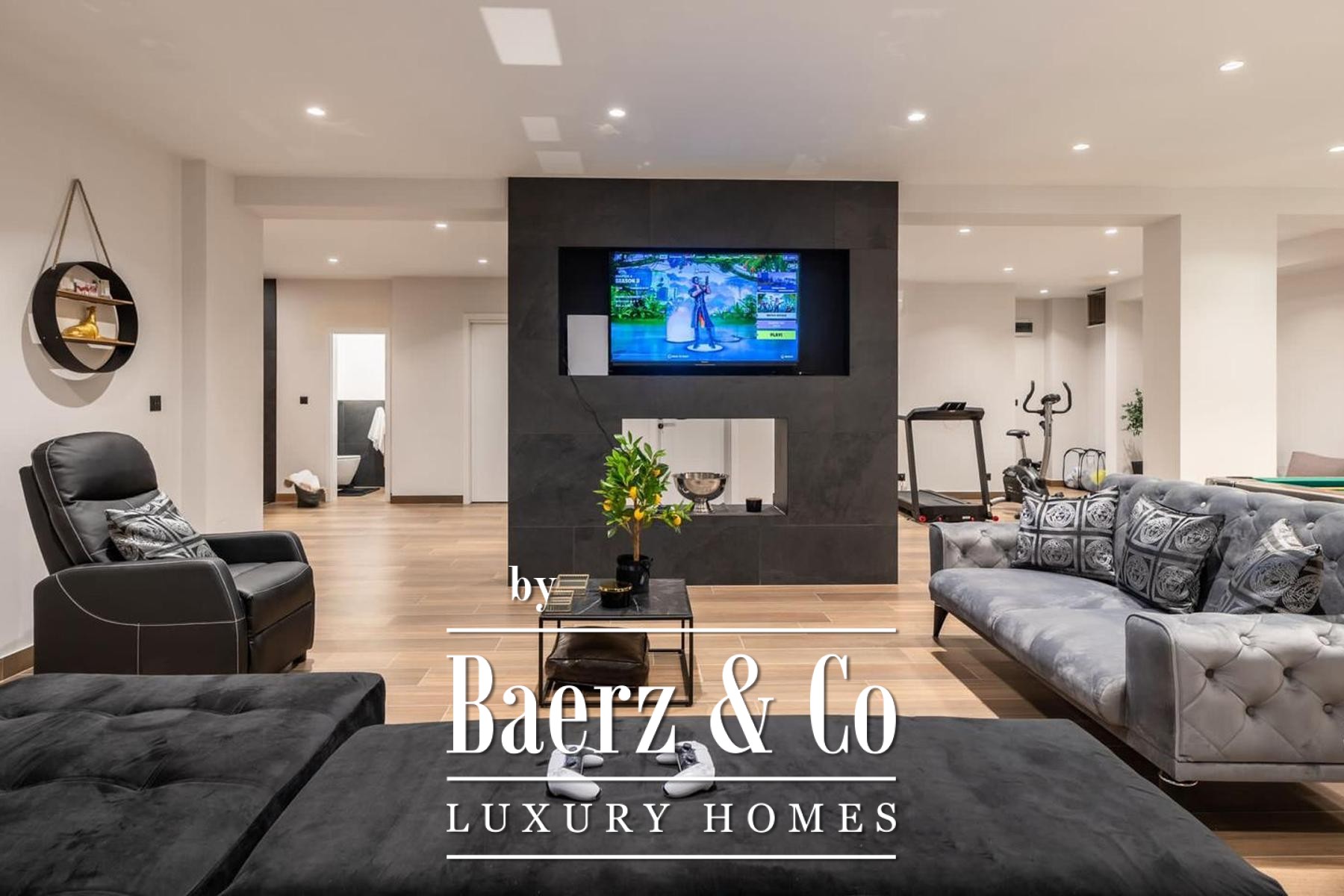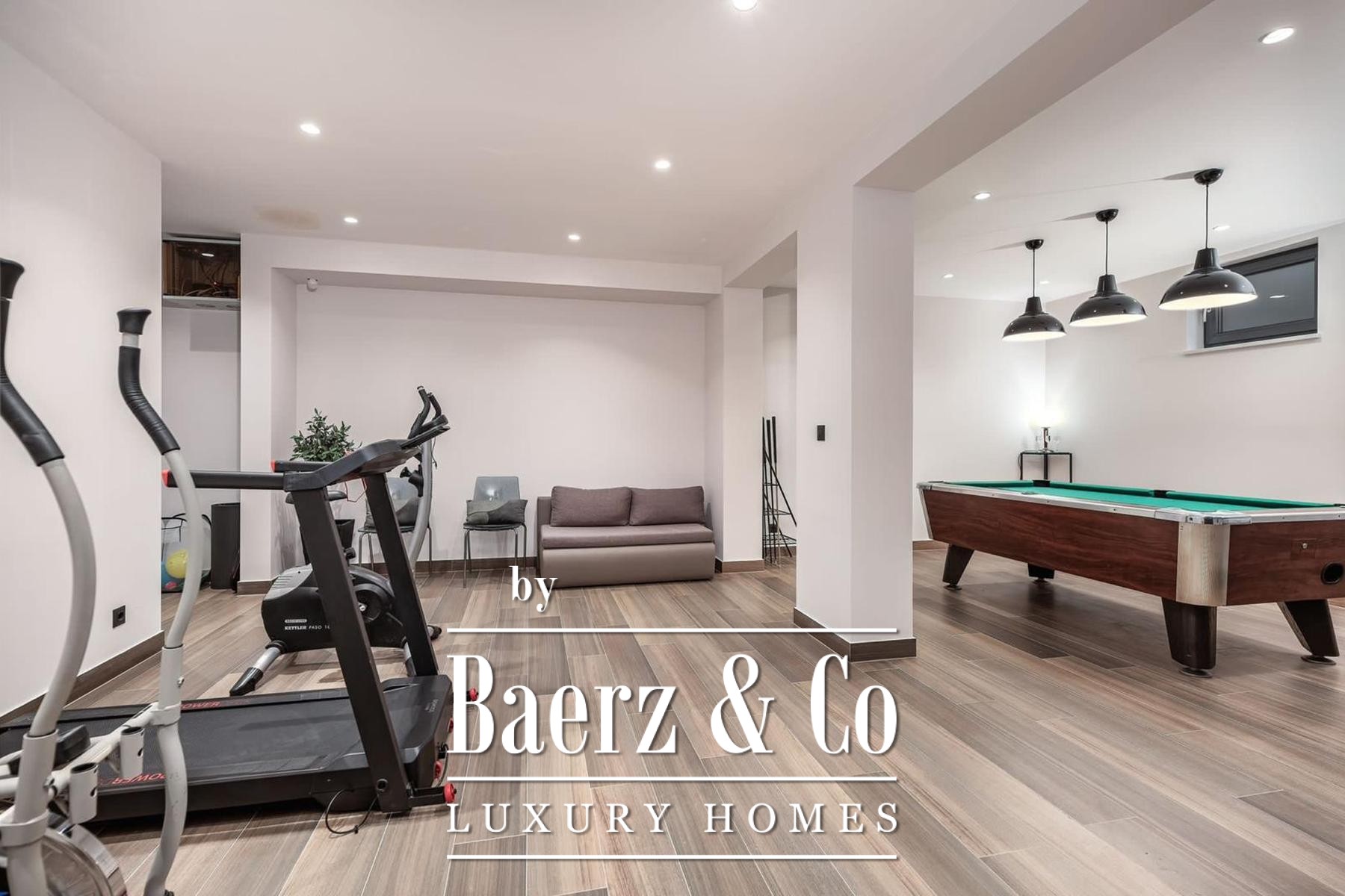 De architectuur strekt zich uit over drie niveaus. Het souterrain is volledig gericht op ontspanning en beschikt over fitnessapparatuur, een biljarttafel, een ruime sofa en televisie, een sauna met douche, een apart toilet en opbergruimte. De begane grond verwelkomt met een open keuken, eetgedeelte en woonkamer, aangevuld met een badkamer en een gastenslaapkamer. Boven beschikken drie slaapkamers over eigen en-suite badkamers en toegang tot een aparte wasruimte, wat privacy en gebruiksgemak biedt.