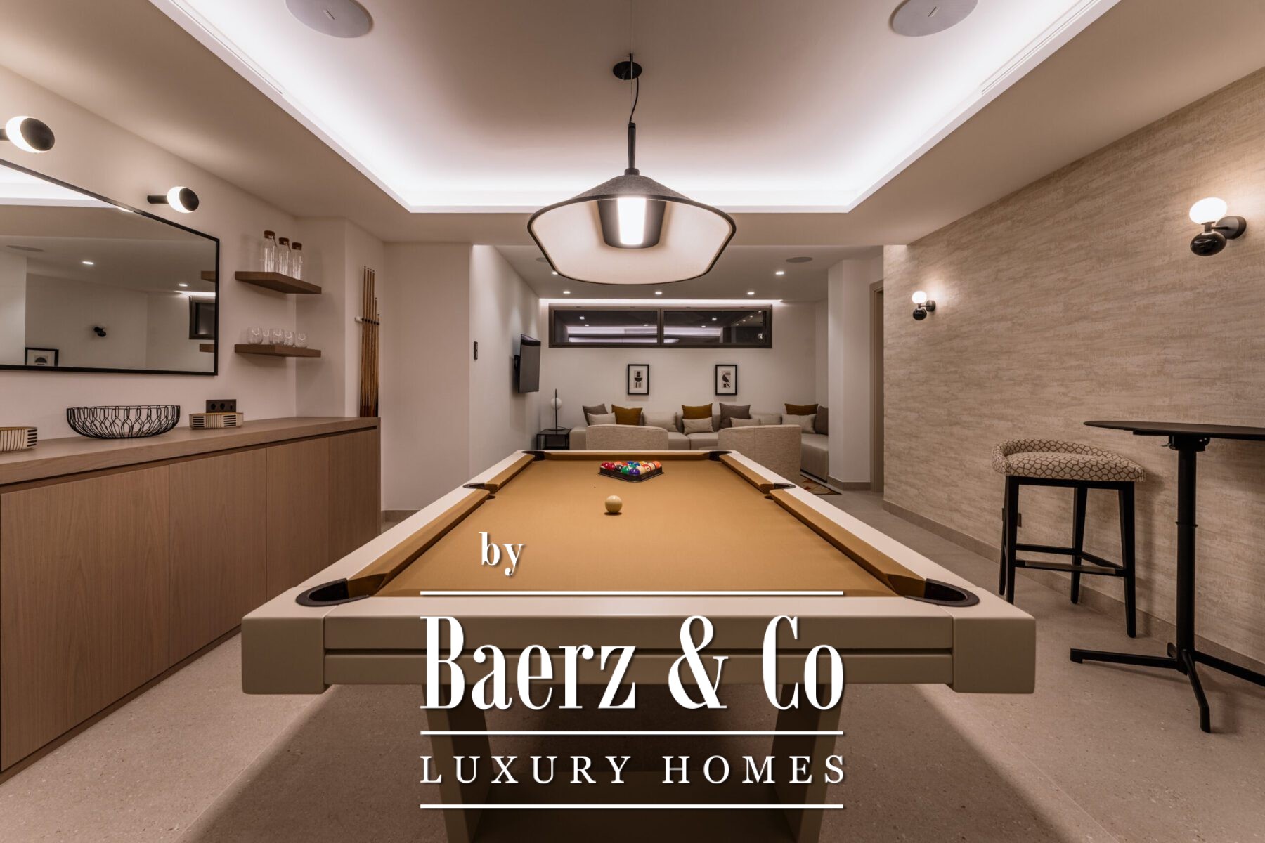 De bovenverdieping biedt privacy en perspectief. De mastersuite beschikt over twee badkamers, gescheiden kleedkamers en brede glaspartijen die het landschap omlijsten. Twee aanvullende gastensuites, waarvan één met privéterras, maken dit toevluchtsoord compleet. Op de benedenverdieping wacht een wellnessruimte met verwarmd binnenzwembad, sauna, fitness en stoombad, aangevuld met een entertainmentlounge, klimaatgereguleerde wijnkelder en een medewerkersappartement met eigen keuken. Vier auto's staan veilig in de garage; gastparkeerplaatsen zijn er voor zes voertuigen.