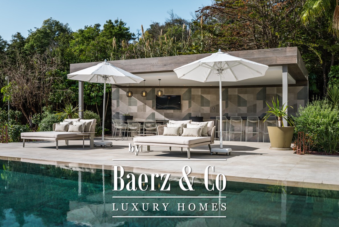 De begane grond biedt zowel ruimtelijkheid als elegantie: een royale living, een eetkamer met plaats voor twaalf gasten en een volledig uitgeruste keuken met centraal kookeiland vormen uitnodigende zones voor dagelijks gebruik en ontvangst. De vloeiende overgang naar terras en gazons verbindt binnen en buiten, met een buitenkeuken, eetgedeelte in de open lucht, barbecue en een privézwembad te midden van zorgvuldig aangelegde tuinen. Licht stroomt door iedere ruimte via de hoge raampartijen van vloer tot plafond.