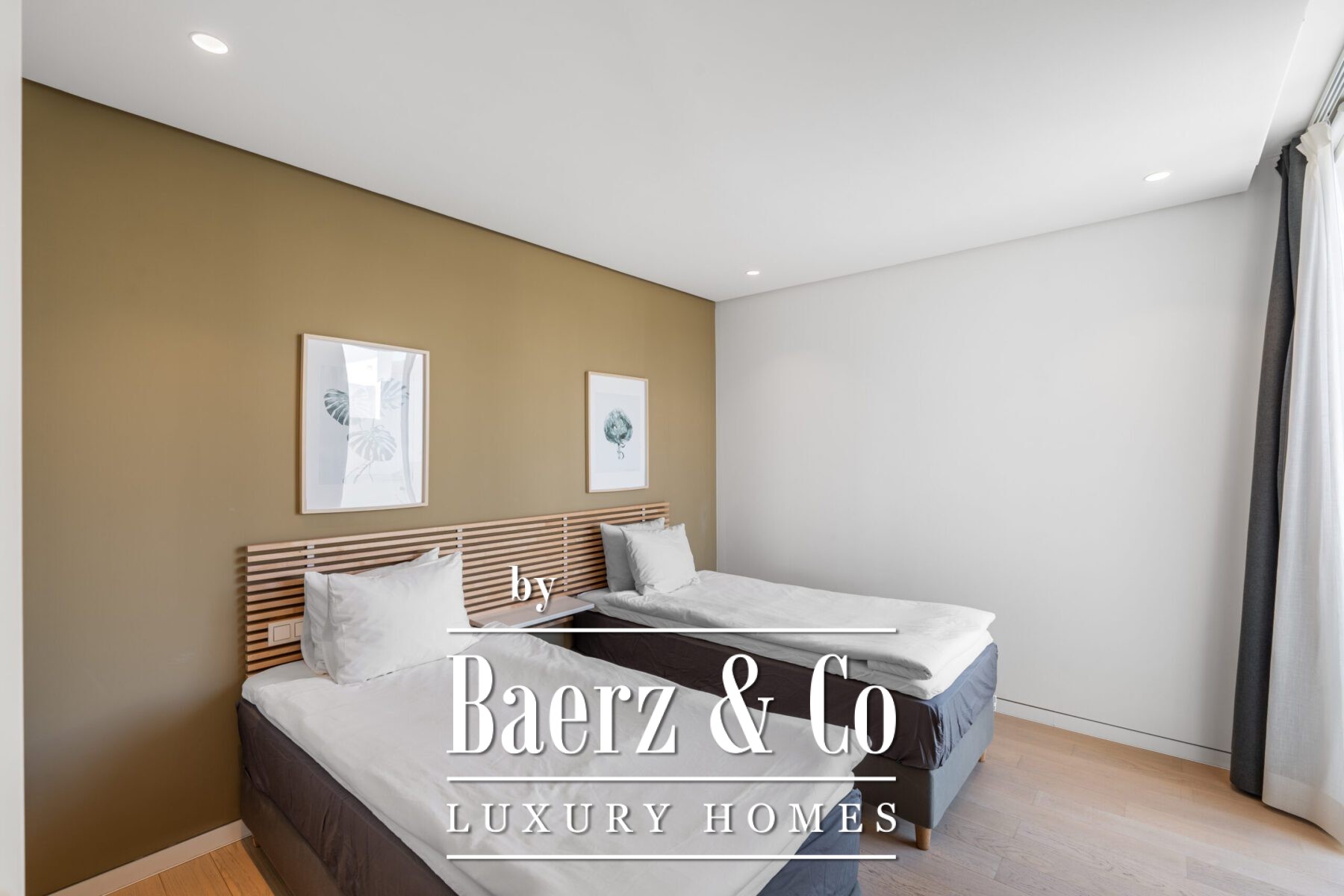 De open indeling combineert ruimte en geborgenheid, met een volledig uitgeruste keuken en een woon-eetgedeelte dat direct aansluit op het royale terras. Er zijn drie slaapkamers, elk met een eigen en-suite badkamer, waaronder een master suite met inloopkast en terras. Een gasten-wc en een aparte wasruimte met extra berging verhogen het dagelijkse comfort. Het penthouse wordt volledig gemeubileerd verkocht, is voorzien van airconditioning en vloerverwarming, en beschikt over een dubbele garage en een berging.