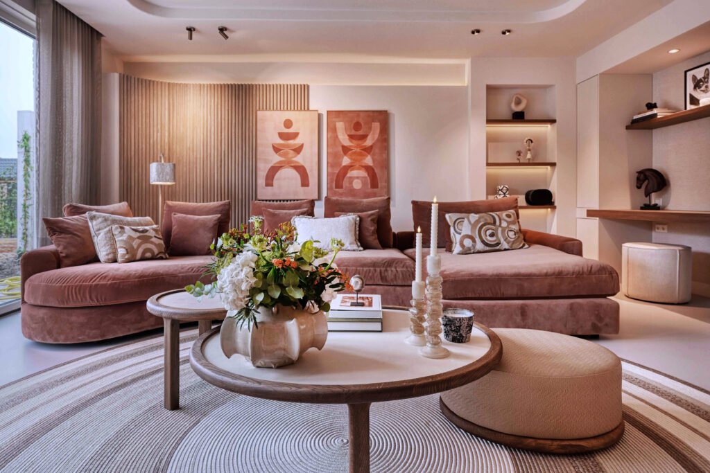 Wie de woonkamer binnenstapt, weet zich direct omringd door tactiliteit. De leren wandpanelen achter de bank nodigen uit om aan te raken en het ronde vloerkleed vangt het licht in zijn vezels dankzij het bijzondere design. Dit zorgt voor een aangenaam contrast. De indirecte verlichting, die subtiel is geïntegreerd op diverse plaatsen, lijkt de ruimte zachtjes te laten ademen. “Ik ontwerp altijd met gevoel”, legt Daniela uit. “We zoeken naar wat past bij de ruimte zelf, qua belijning, materialen, meubels en accessoires. Het moet ook echt passen bij de bewoners.” De organisch gevormde plantenbak in bronskleur, de subtiele rondingen in plafond en wand, niets is toevallig. Er werd bewust gewerkt met afgeronde vormen binnen een geometrisch kader, waardoor rust en dynamiek elkaar perfect aanvullen. “Het is een huis dat je omarmt”, legt zij uit. “Elke lijn heeft een reden, elke ronding een betekenis.”