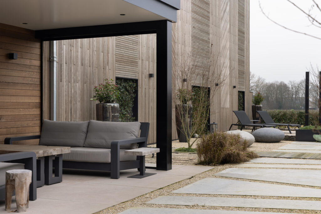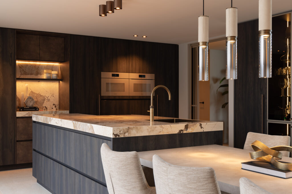 In de leefkeuken zorgt het donkere materiaal van de achterwand en het eiland voor een prettig contrast met het lichte keukenblad en de royale eettafel in betonlook. Het oogstrelende blad zien we ook terug in het barretje en het zithoekje in het raam, wat eenheid in de keuken brengt. De bronstinten en de zorgvuldig gekozen verlichting zorgen ook in deze ruimte voor extra beleving, waarbij de vloerlamp in de living en de ‘juwelenlamp’ in de trapopgang op zichzelf al blikvangers zijn. Ook de tuin onderging een grote metamorfose en sluit aan bij het hoge niveau van het interieur én de wensen en dromen van de bewoners.